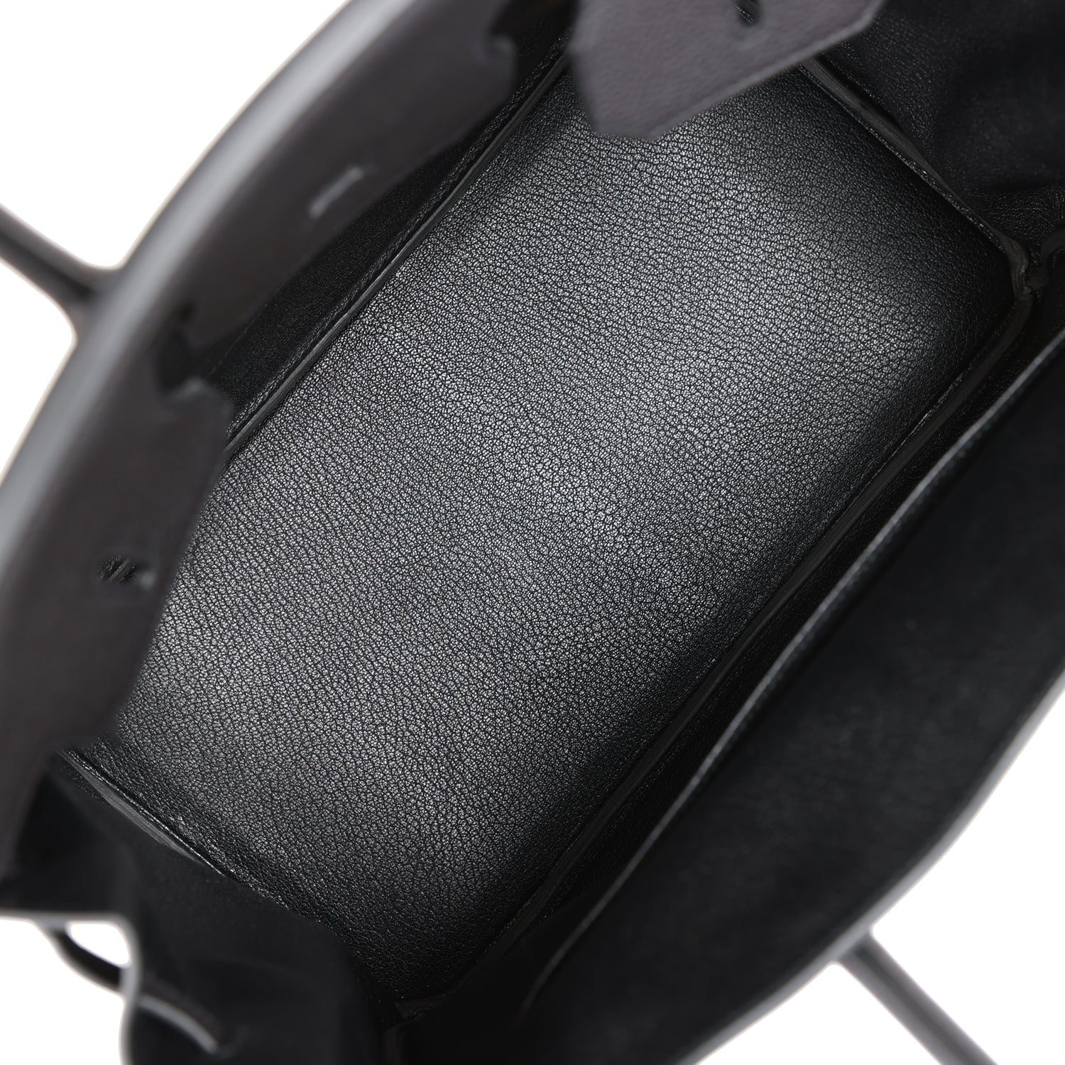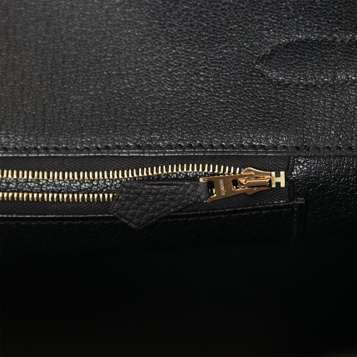 The interior is lined with black chevre and has one zip pocket with an Hermes engraved zipper pull and an open pocket on the opposite side.