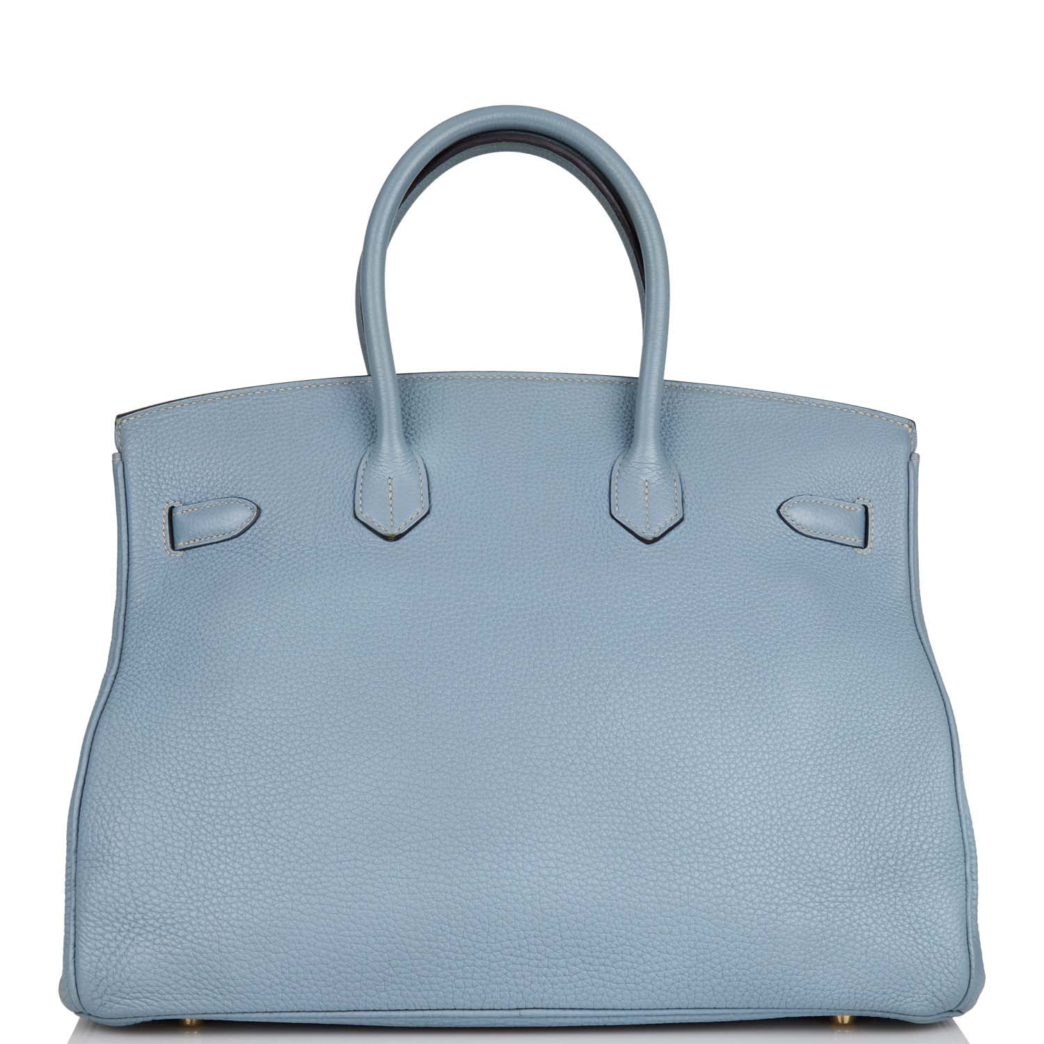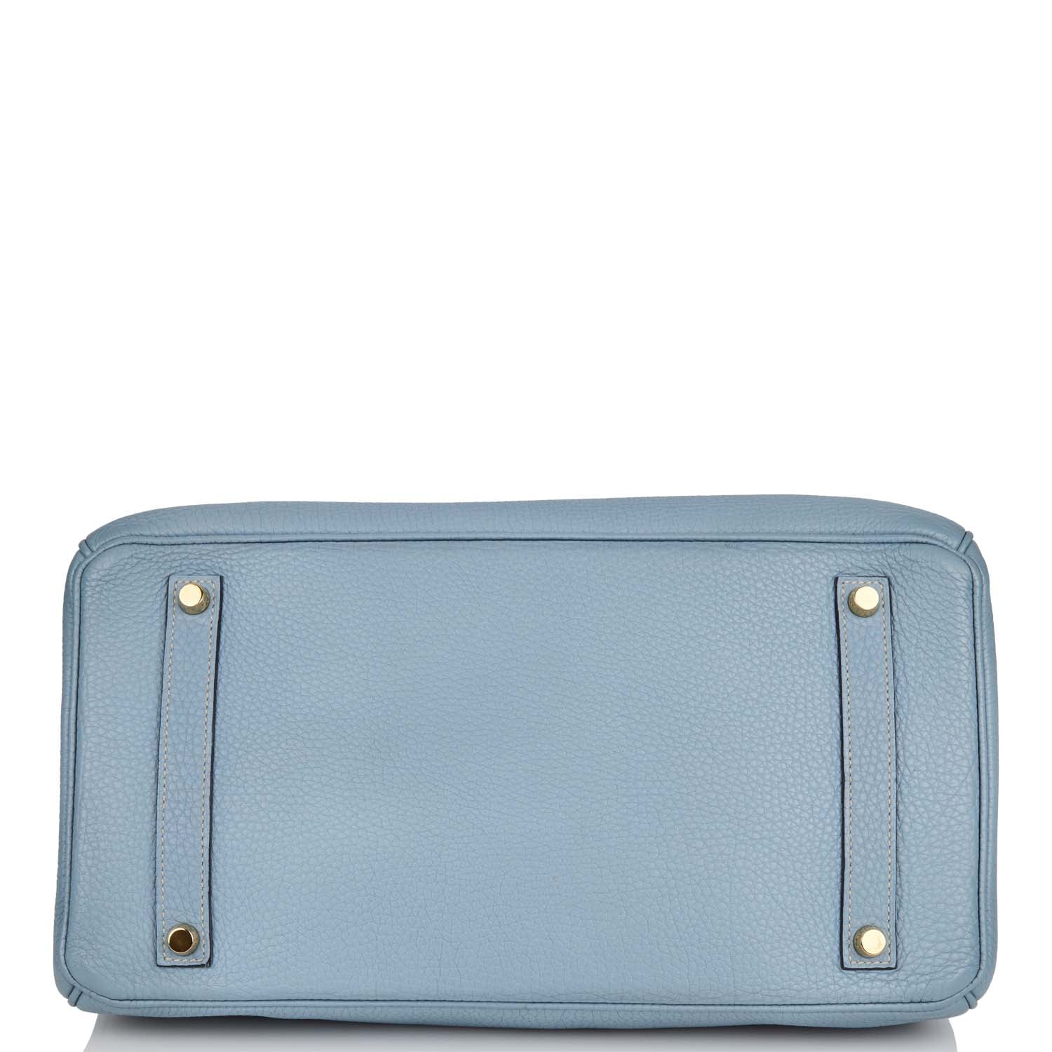 This Birkin is in Bleu Lin togo leather with gold hardware and has contrast stitching, a front toggle closure, a clochette with lock and two keys, and double rolled handles.
