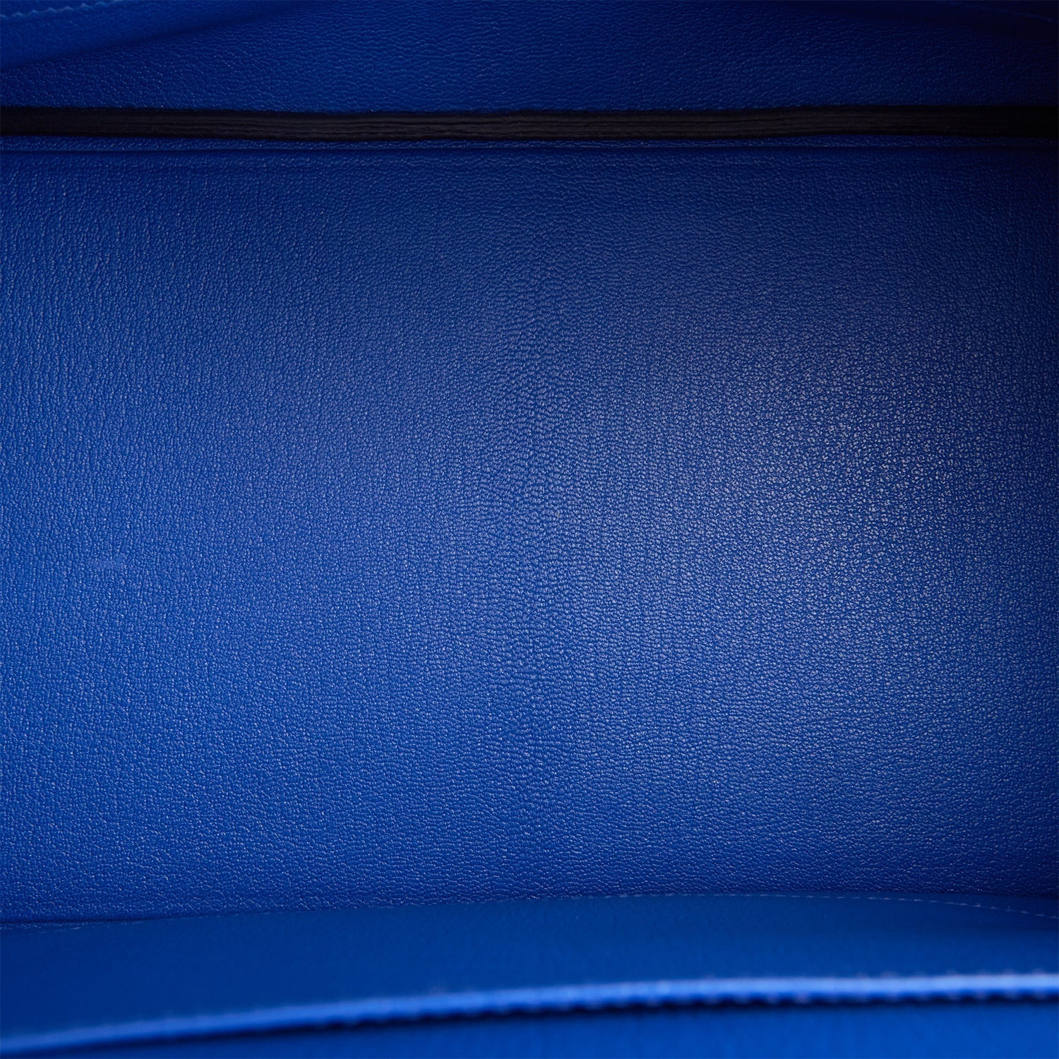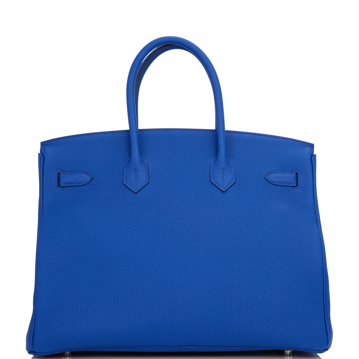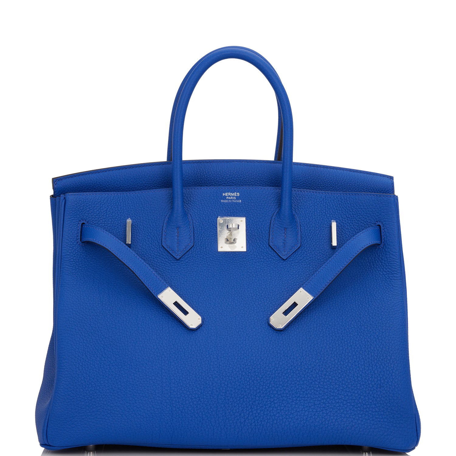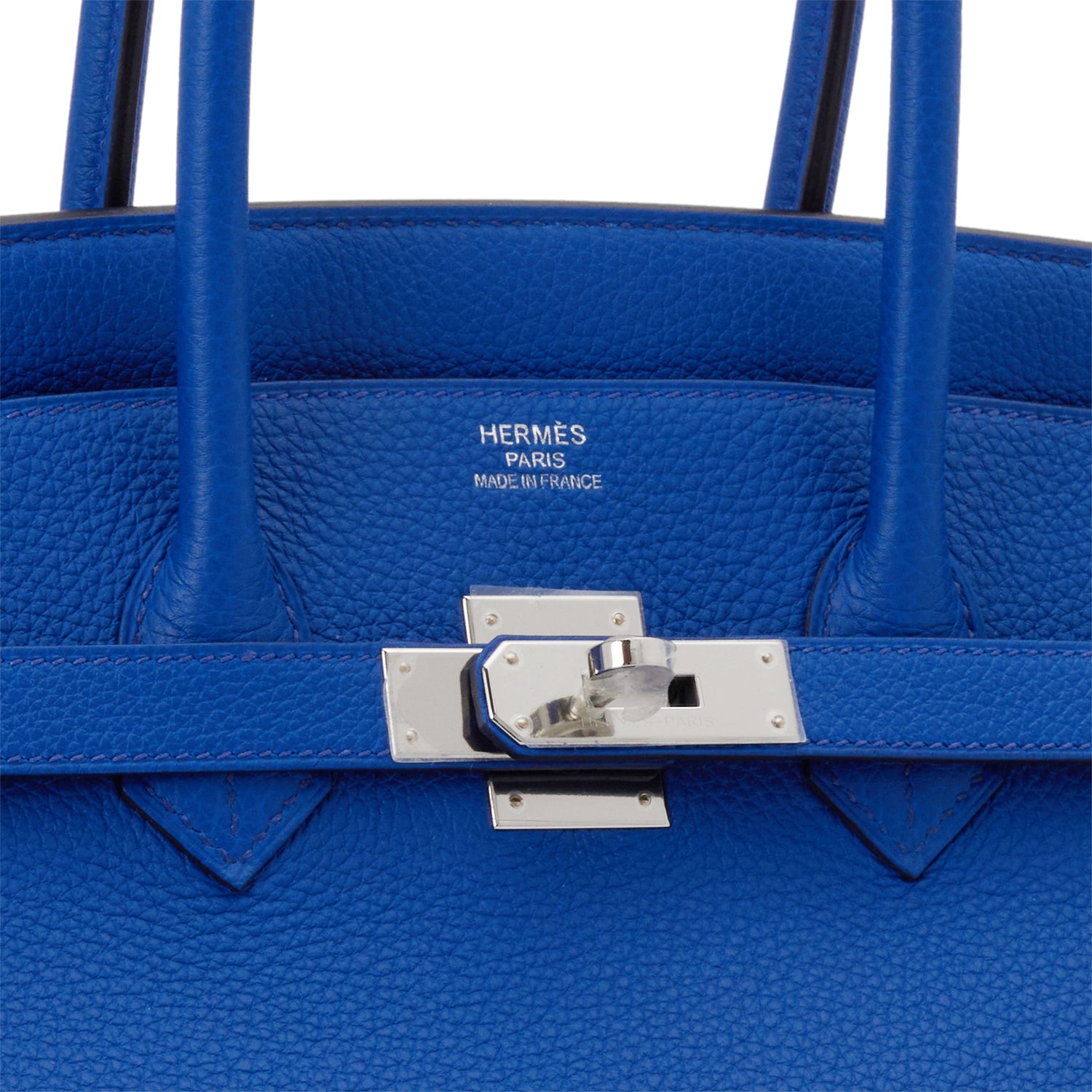 This Birkin is in Bleu Royal togo leather with palladium hardware and has tonal stitching, front flap, two straps with center toggle closure, clochette with lock and two keys, and double rolled handles.