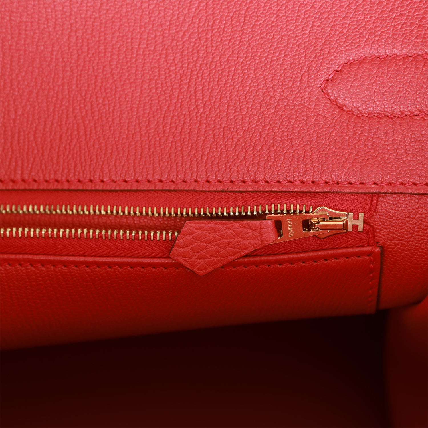 The interior is lined with Bougainvillea chevre and has one zip pocket with an Hermes engraved zipper pull and an open pocket on the opposite side.