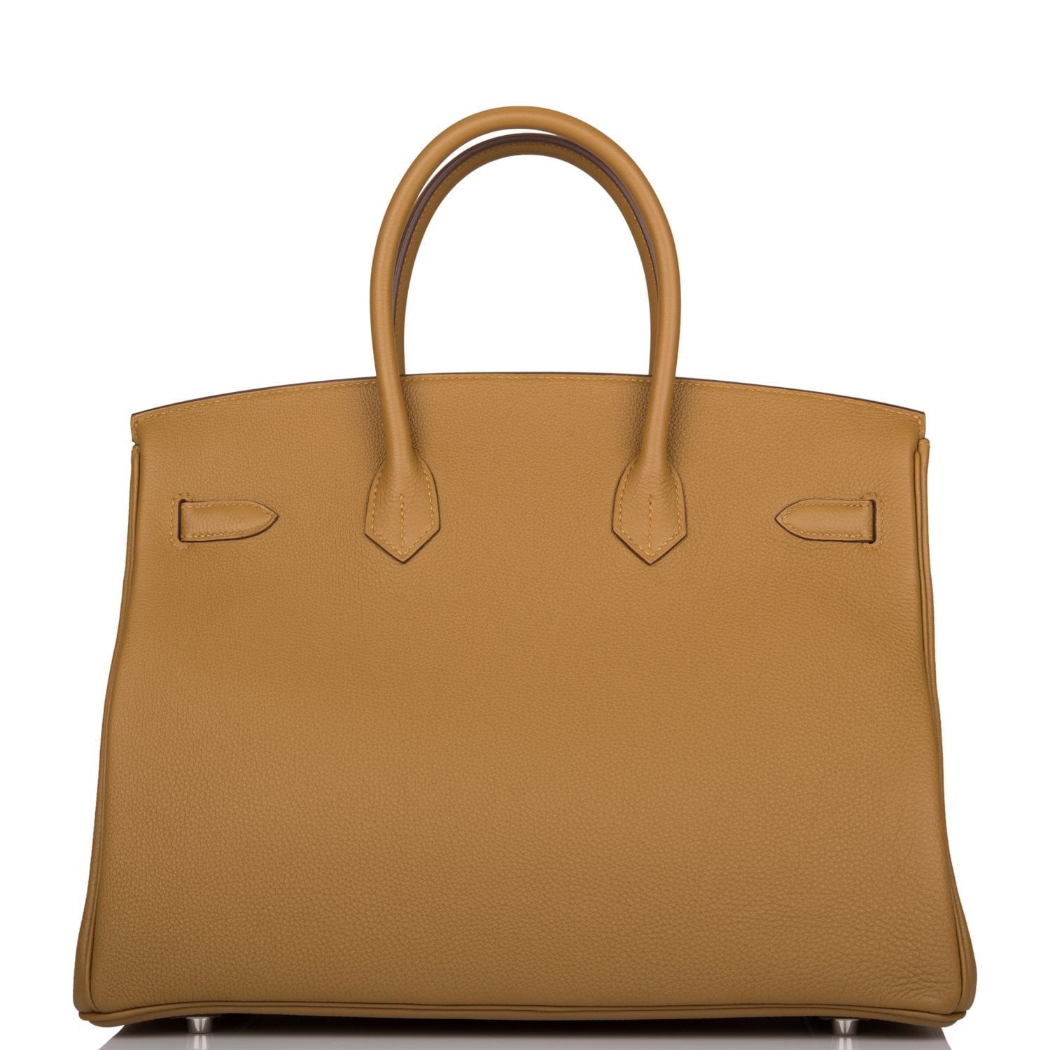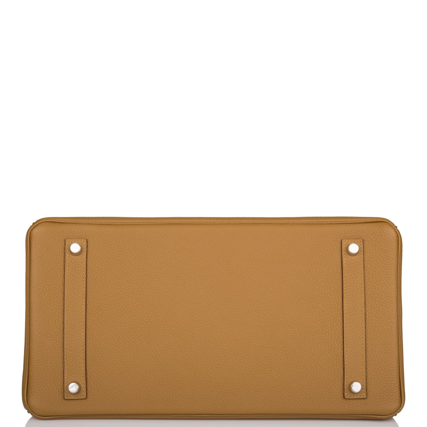 This Birkin is in Bronze D'or togo leather with palladium hardware and has tonal stitching, front flap, two straps with center toggle closure, clochette with lock and two keys, and double rolled handles.