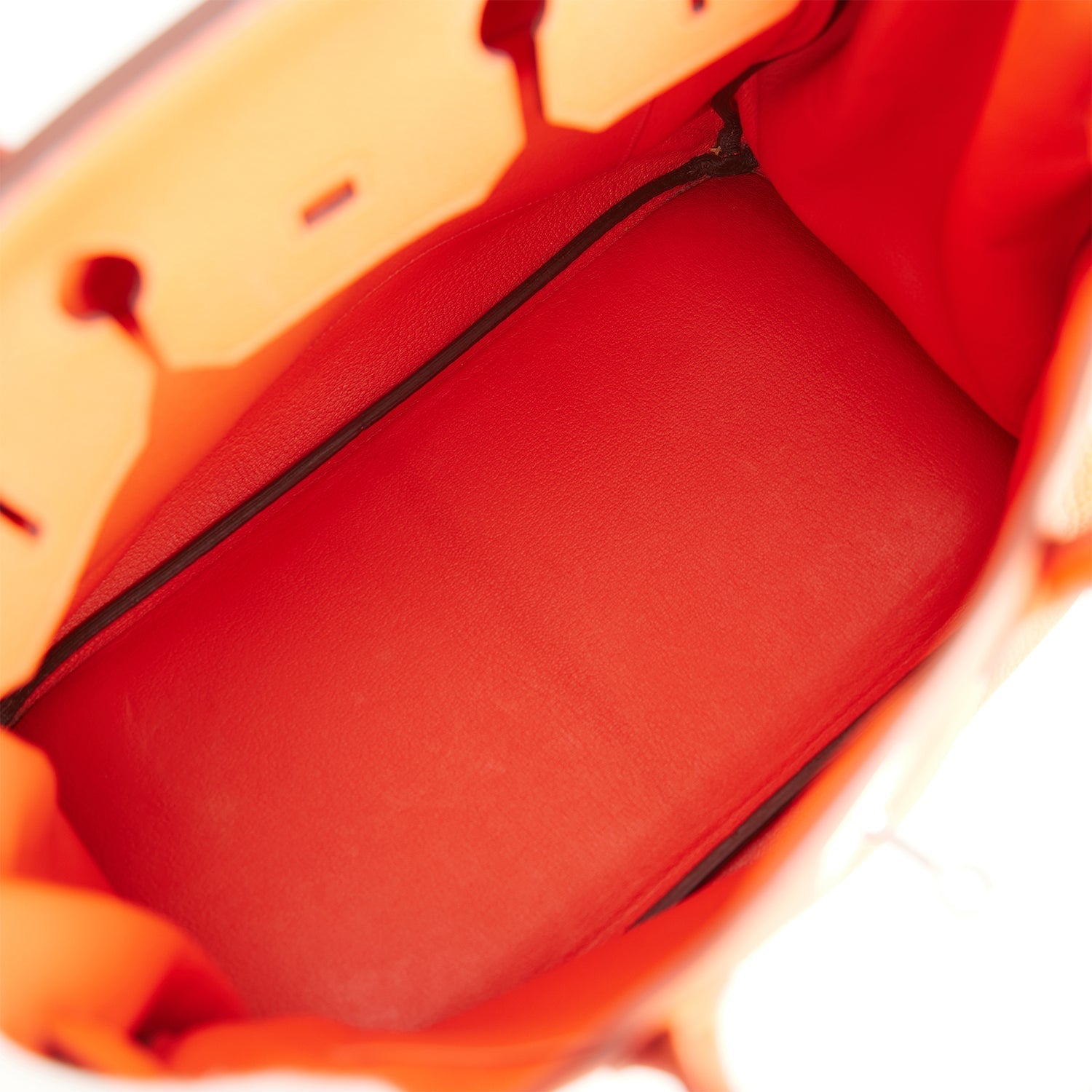 This Birkin is in Capucine togo leather with palladium hardware and has tonal stitching, front flap, two straps with center toggle closure, clochette with lock and two keys, and double rolled handles.