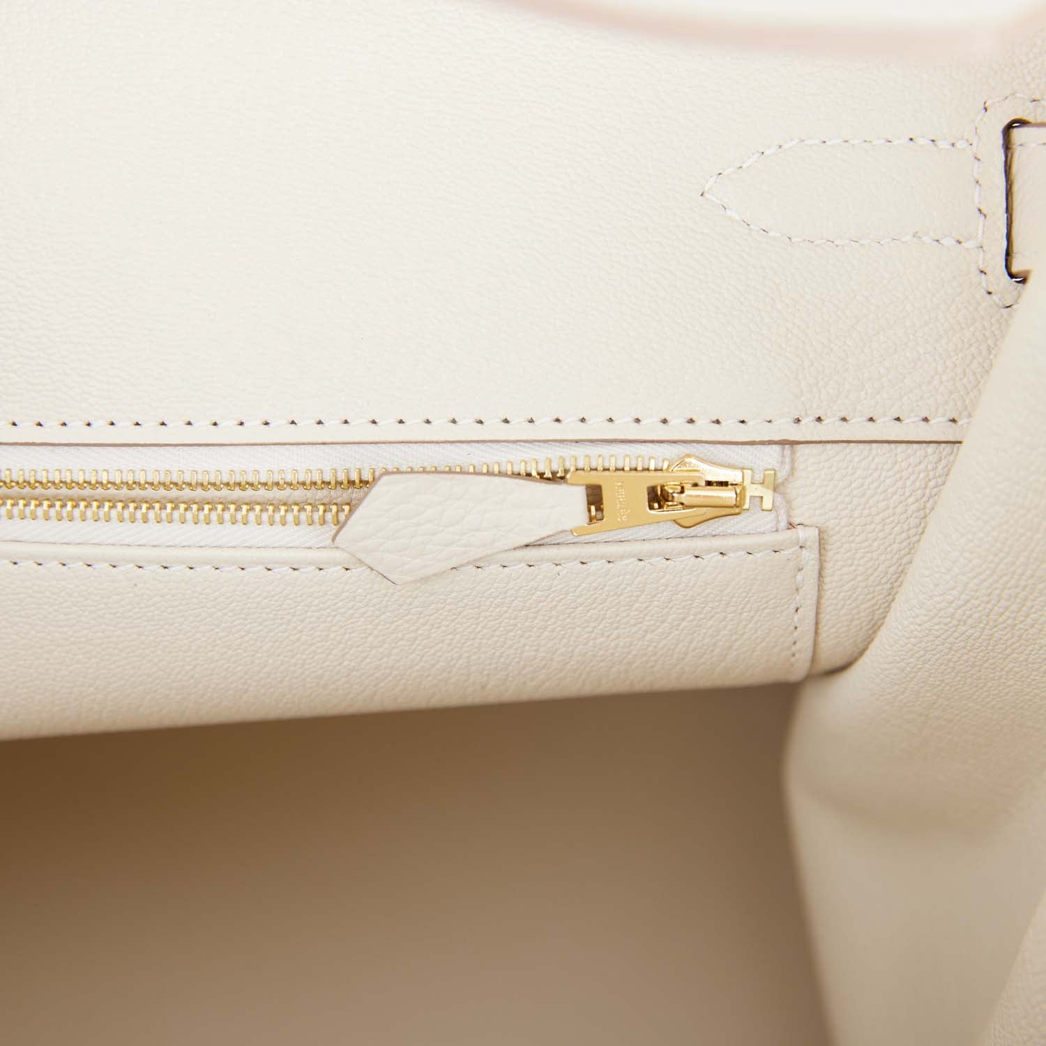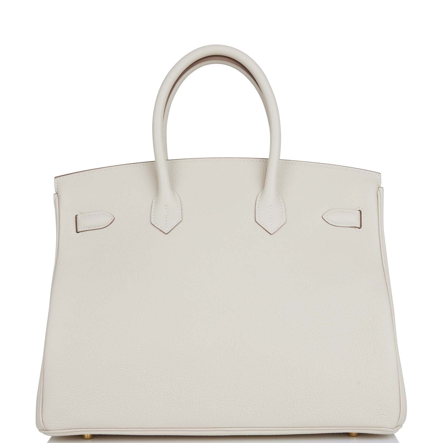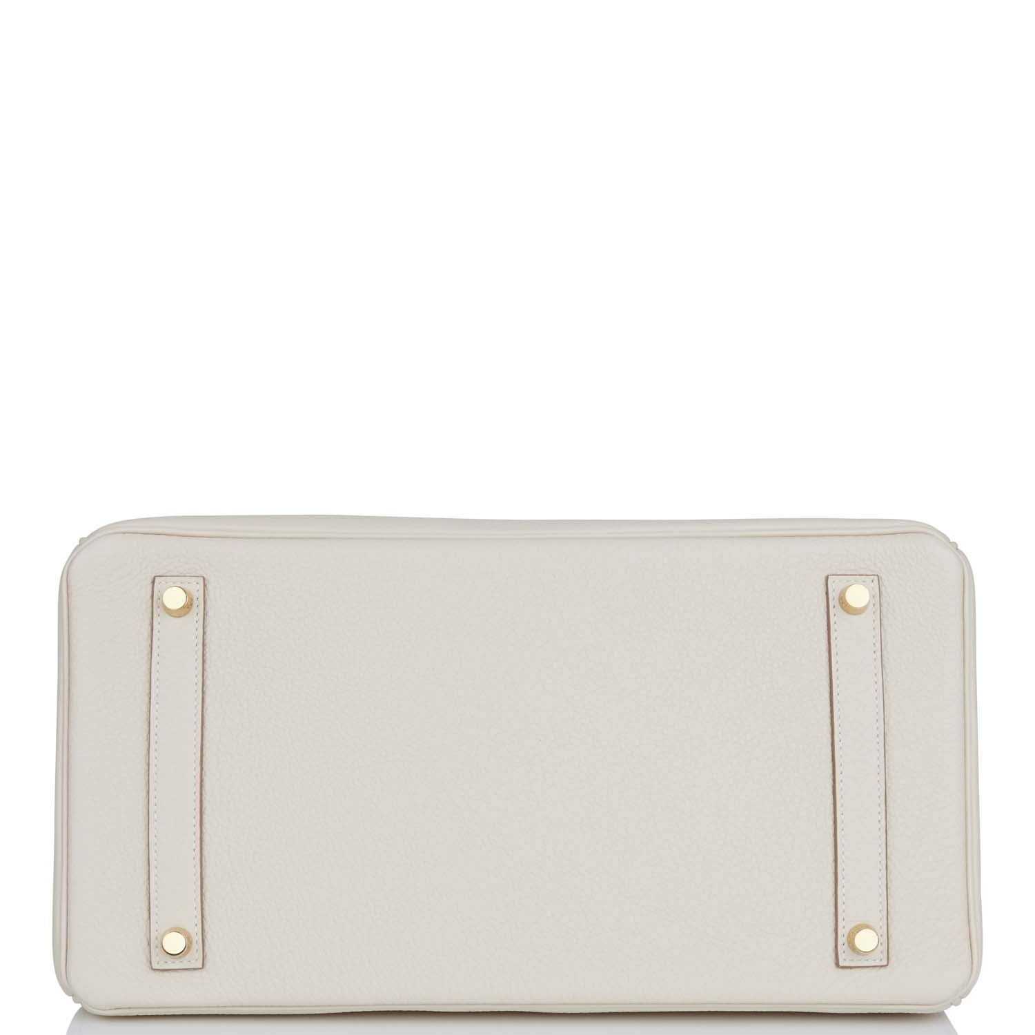 This Birkin is in Craie togo leather with gold hardware and has tonal stitching, front flap, two straps with center toggle closure, clochette with lock and two keys, and double rolled handles.