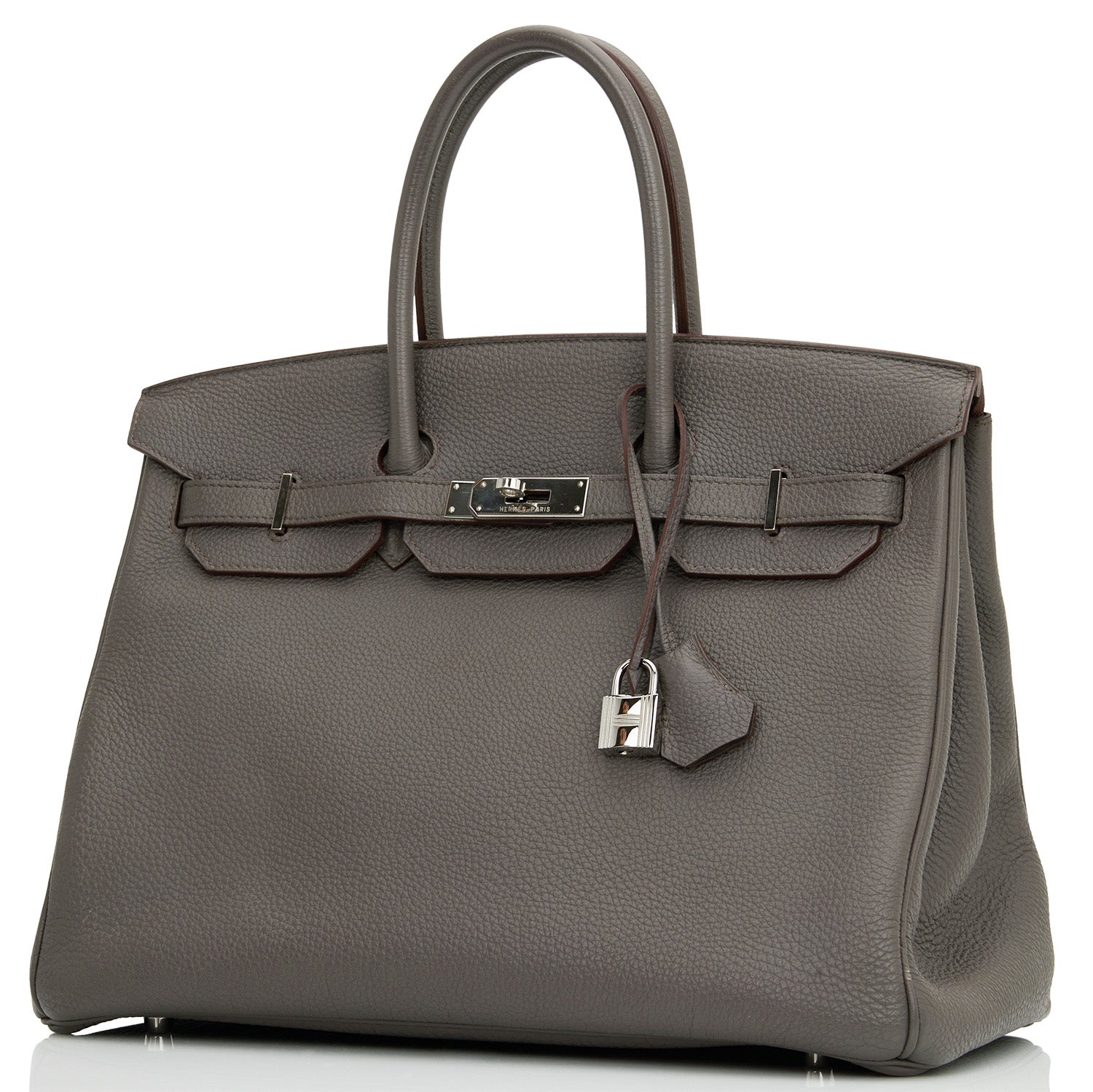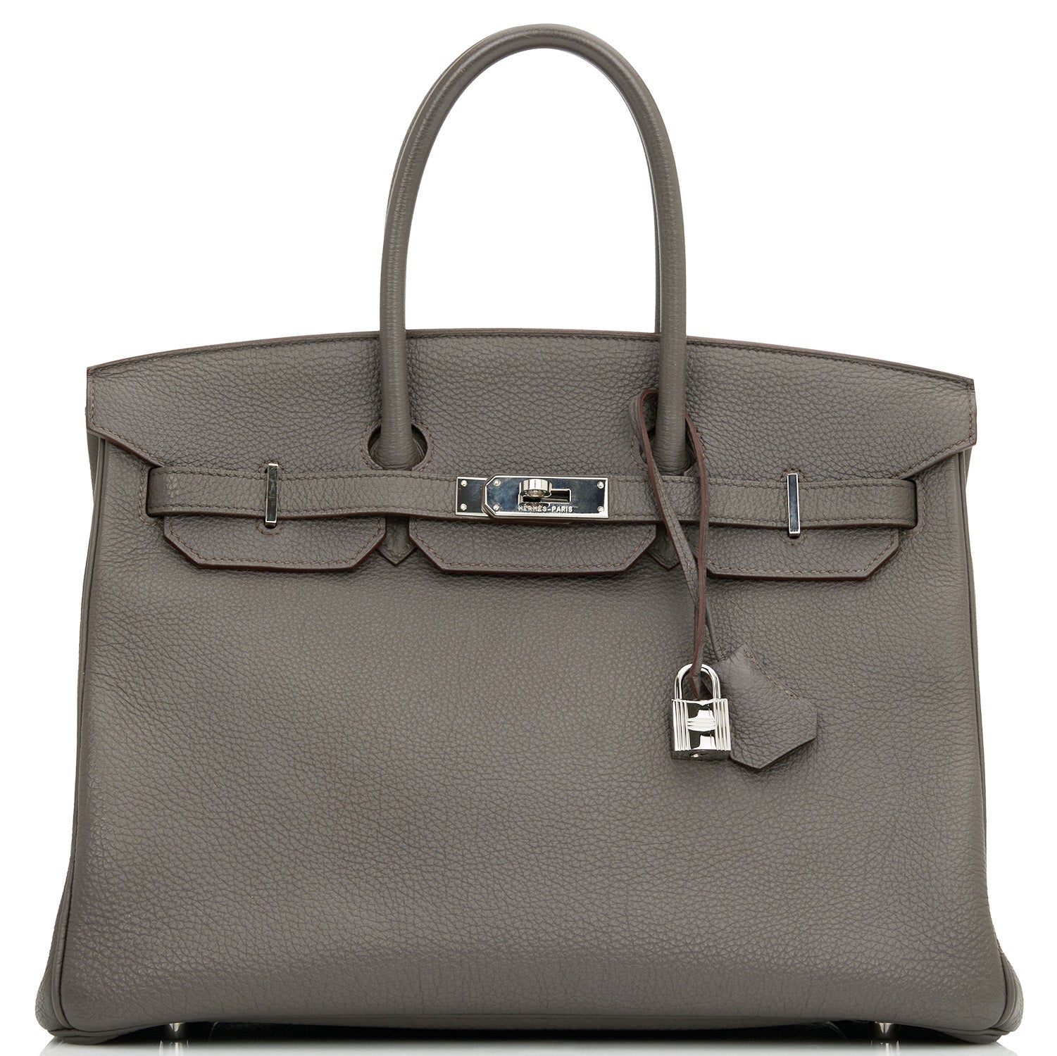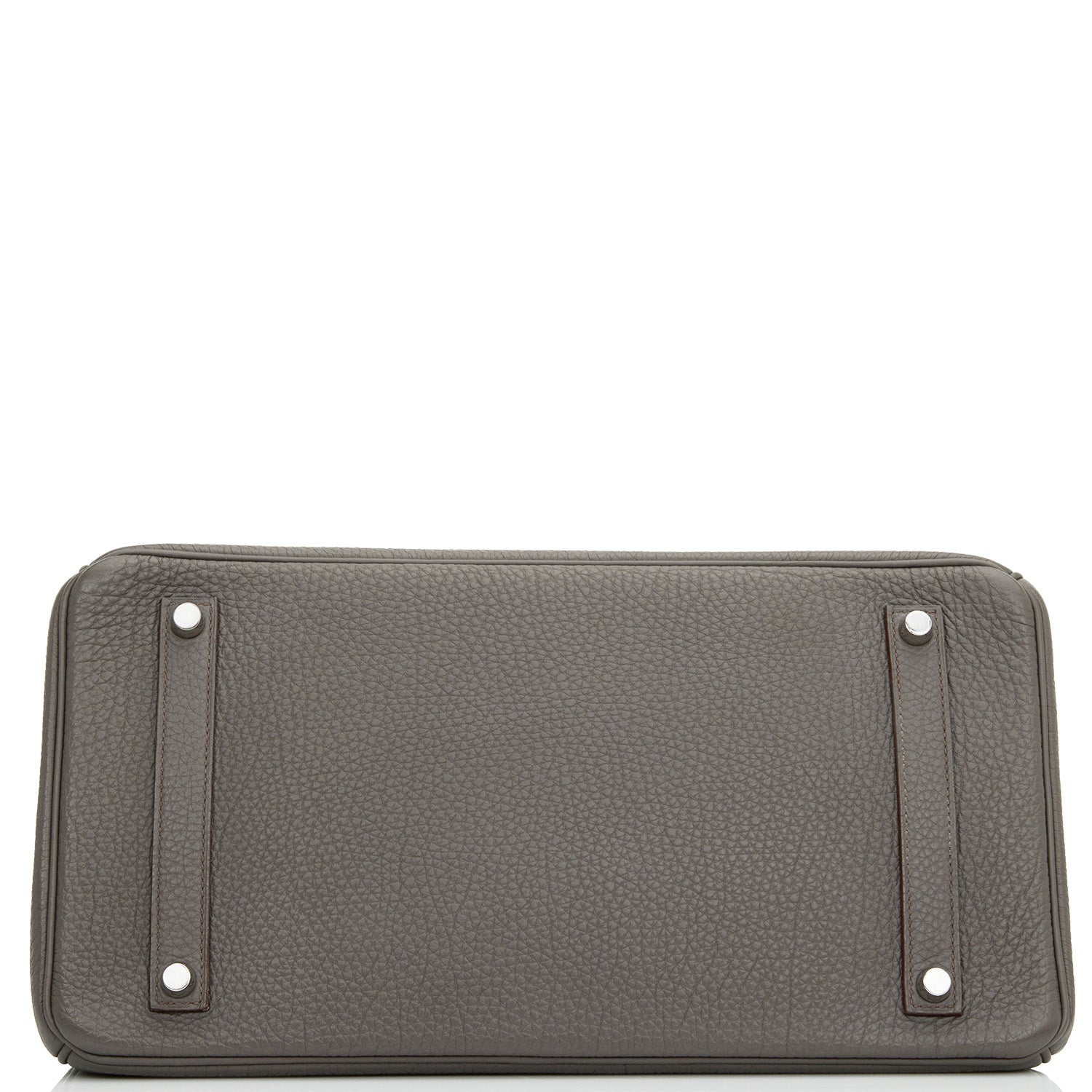 This Birkin is in Etain togo leather with palladium hardware and has tonal stitching, front flap, two straps with center toggle closure, clochette with lock and two keys, and double rolled handles.