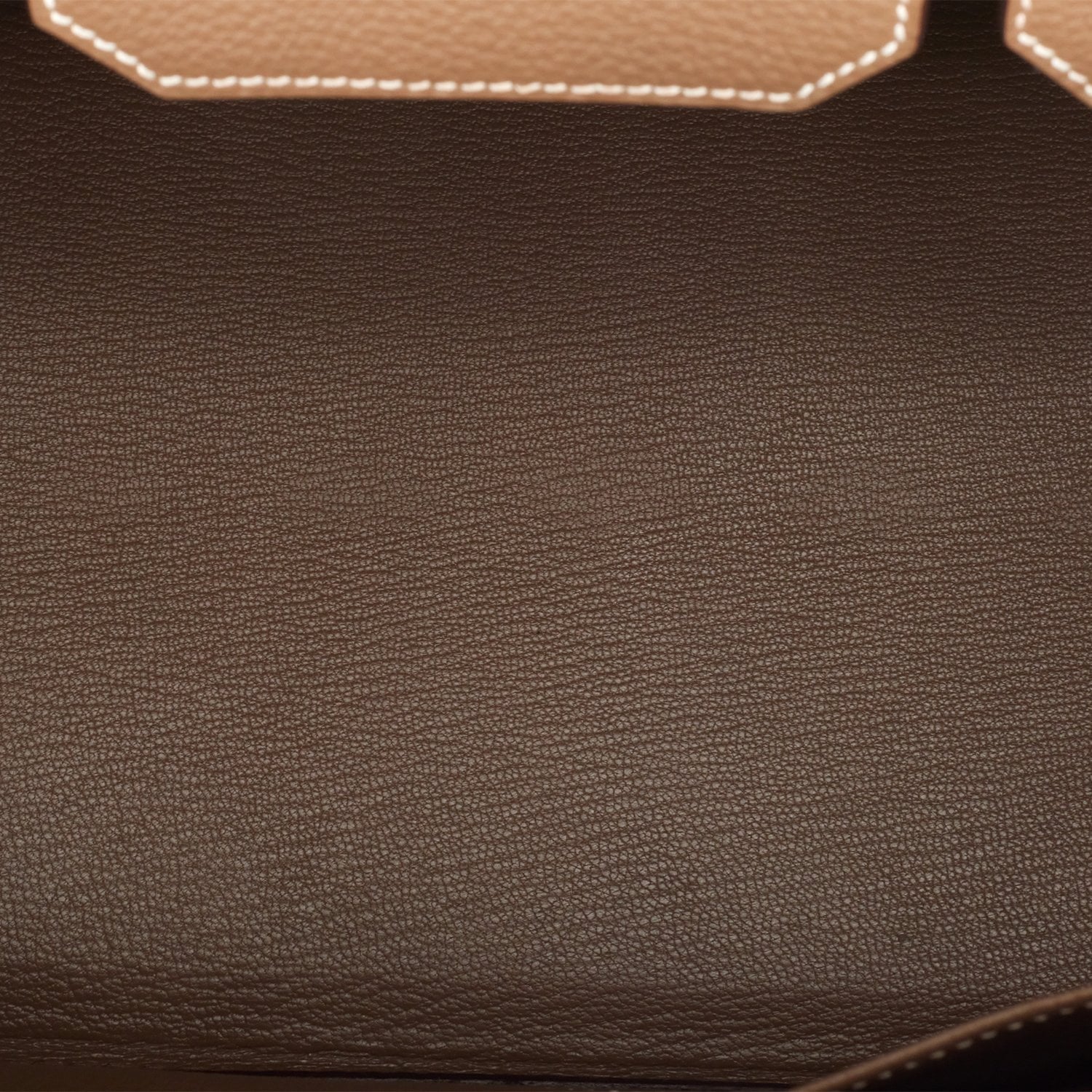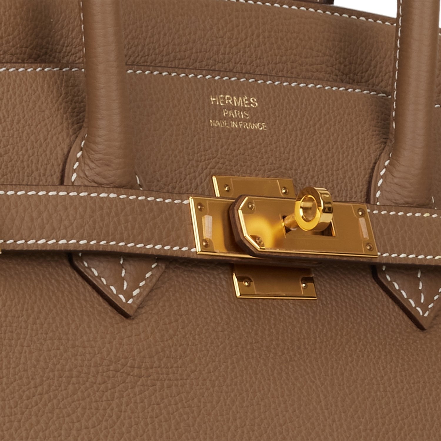 This Birkin is in Etoupe togo leather with gold hardware and has contrast stitching, front flap, two straps with center toggle closure, clochette with lock and two keys, and double rolled handles.