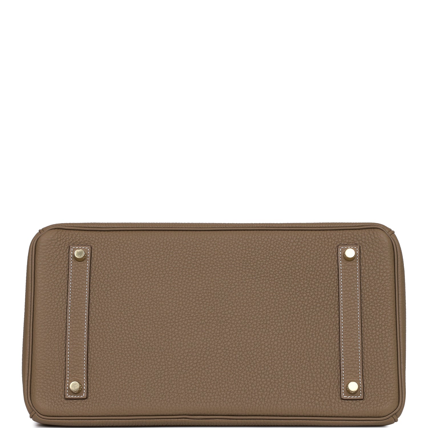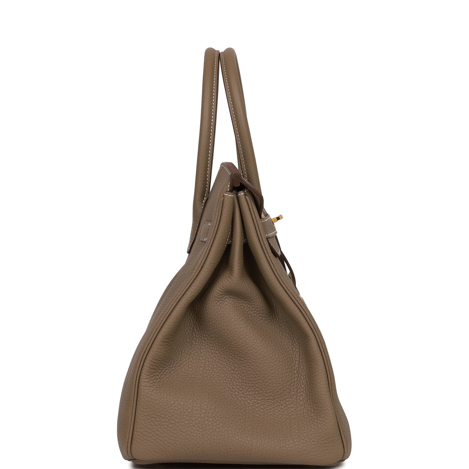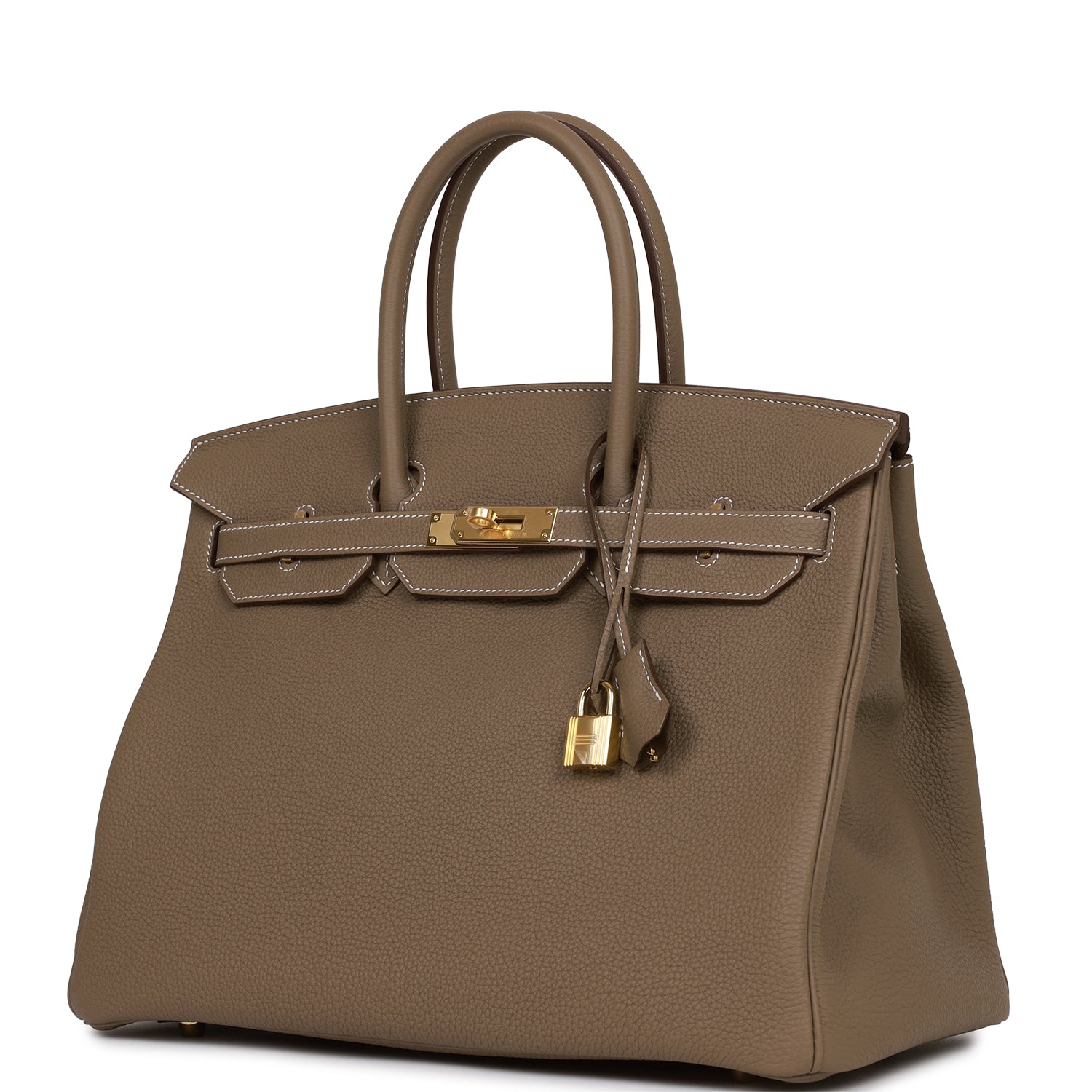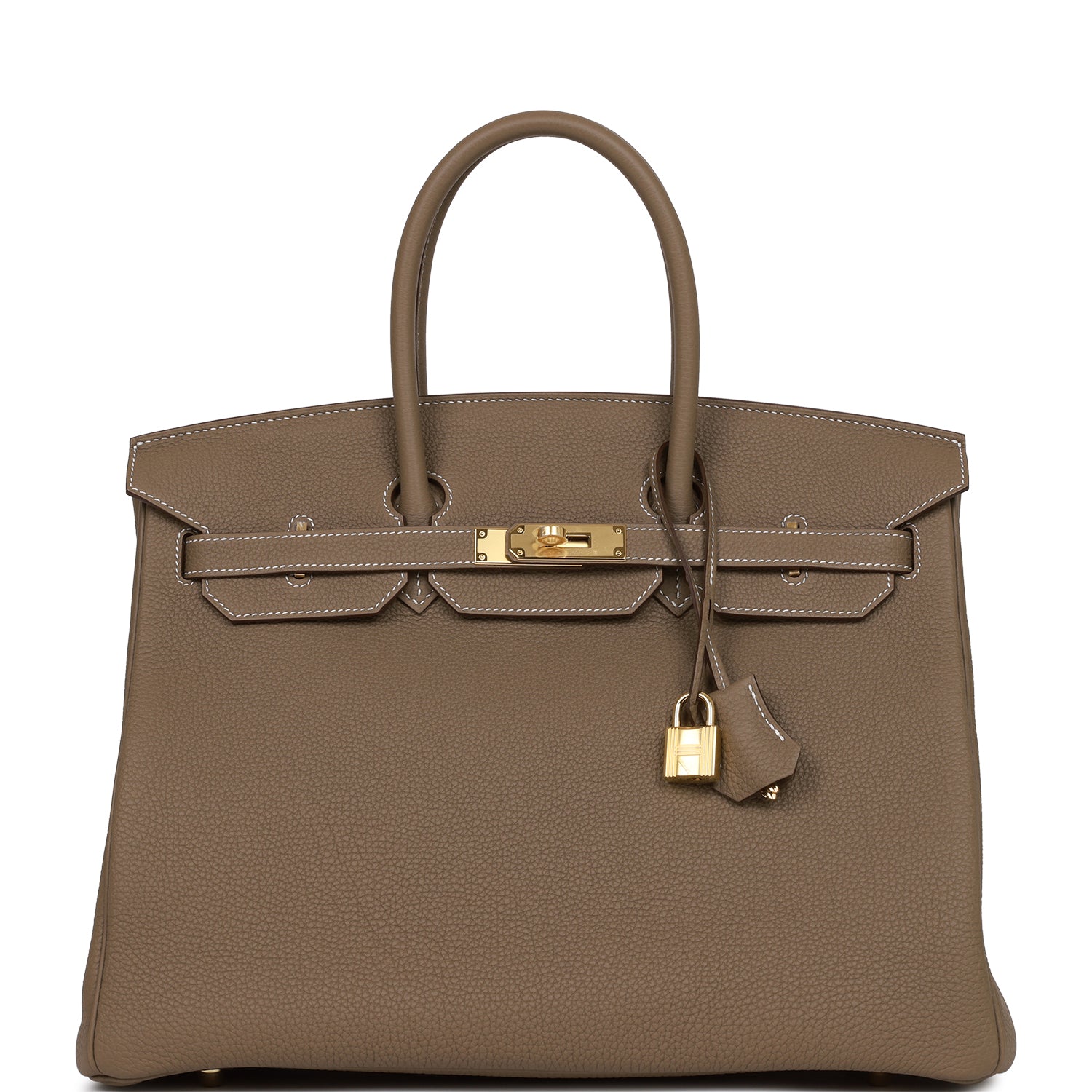 This Birkin is in Etoupe togo leather with gold hardware and has contrast stitching, front flap, two straps with center toggle closure, clochette with lock and two keys, and double rolled handles.