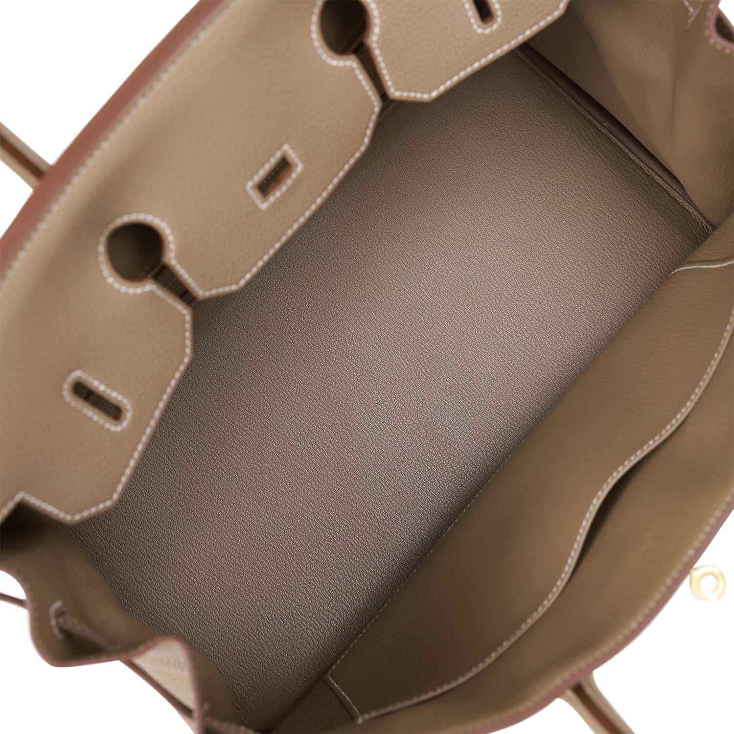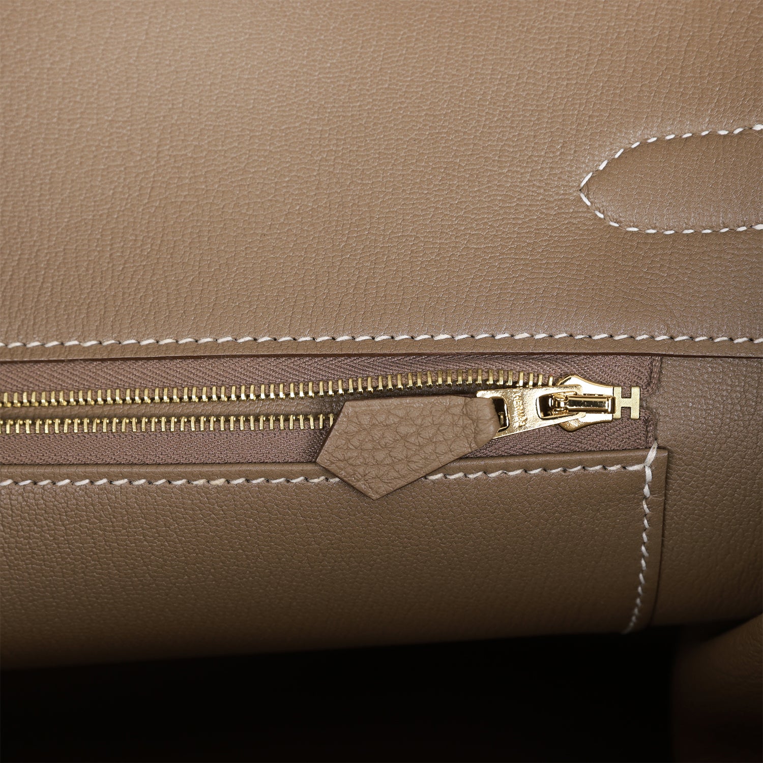 The interior is lined with Etoupe chevre and has one zip pocket with an Hermes engraved zipper pull and an open pocket on the opposite side.