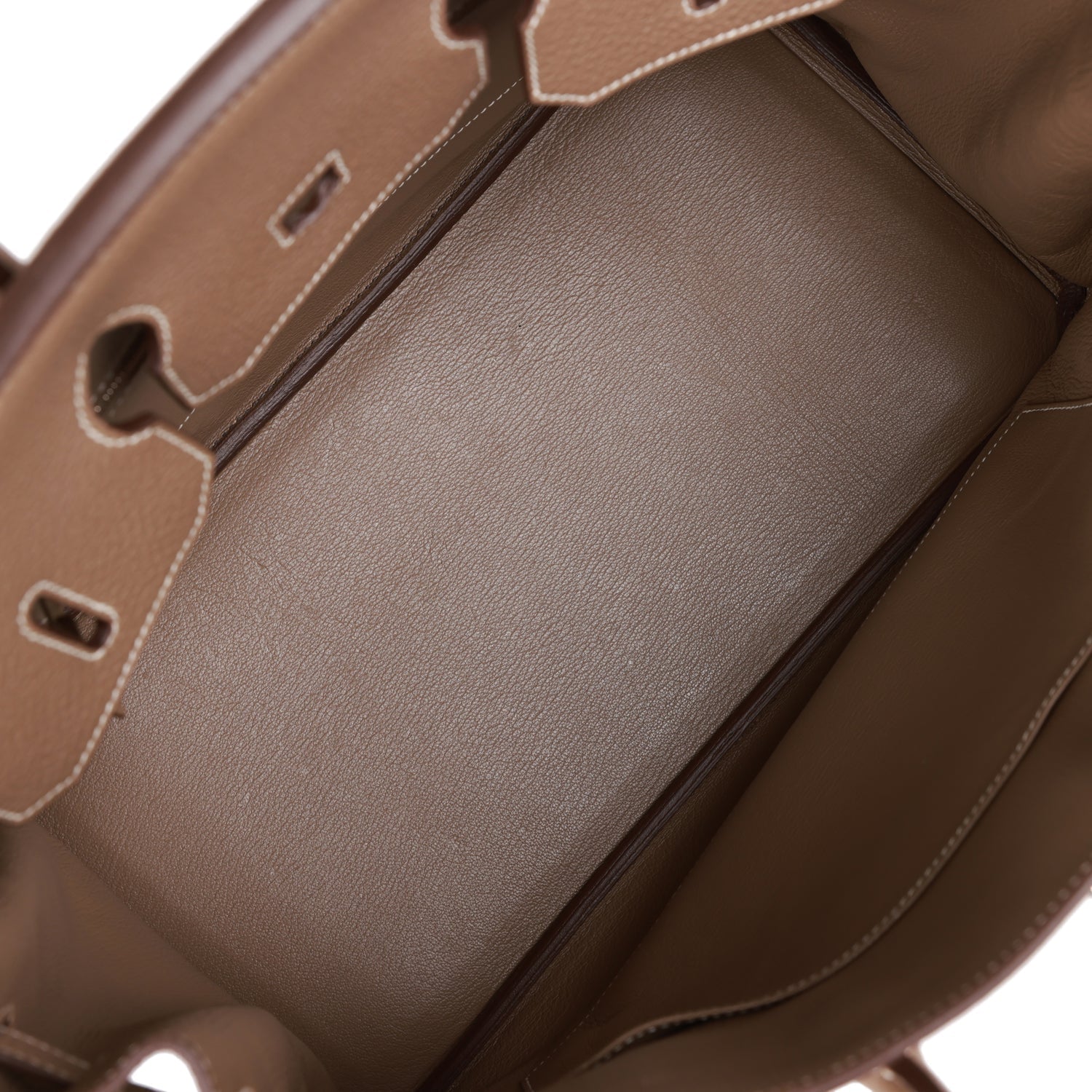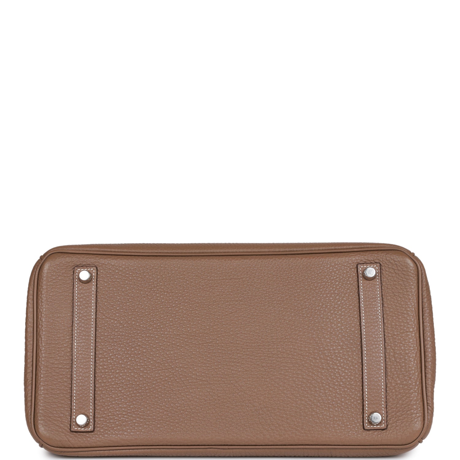 This Birkin is in Etoupe togo leather with palladium hardware and has contrast stitching, front flap, two straps with center toggle closure, clochette with lock and two keys, and double rolled handles.
