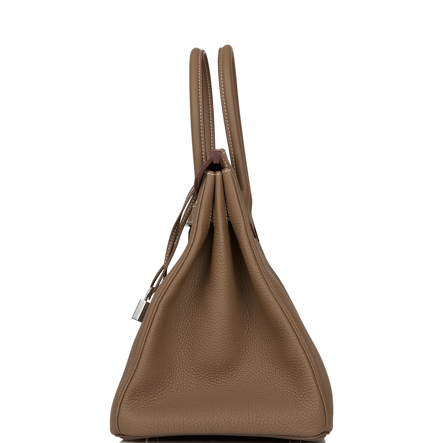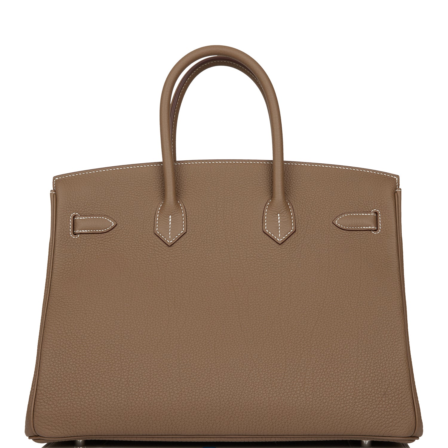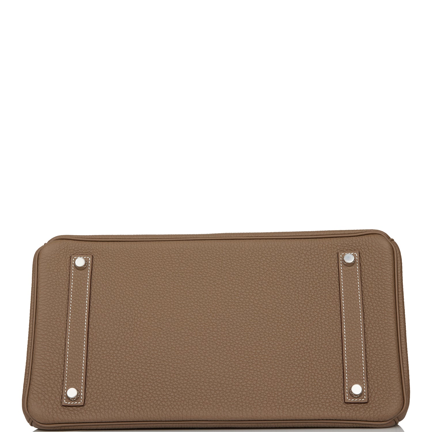 This Birkin is in Etoupe togo leather with palladium hardware and has contrast stitching, front flap, two straps with center toggle closure, clochette with lock and two keys, and double rolled handles.