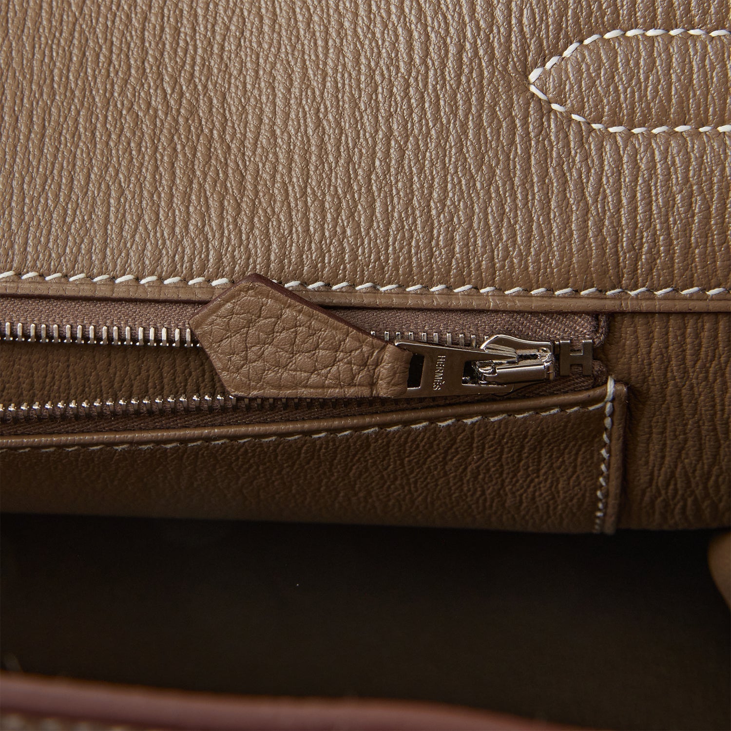The interior is lined with Etoupe chevre and has one zip pocket with an Hermes engraved zipper pull and an open pocket on the opposite side.