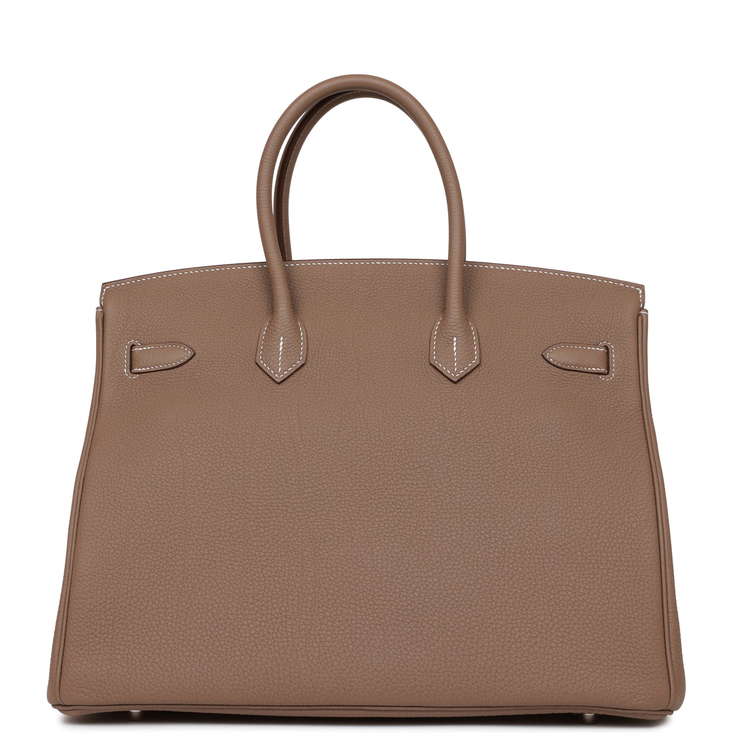 This Birkin is in Etoupe togo leather with palladium hardware and has contrast stitching, front flap, two straps with center toggle closure, clochette with lock and two keys, and double rolled handles.