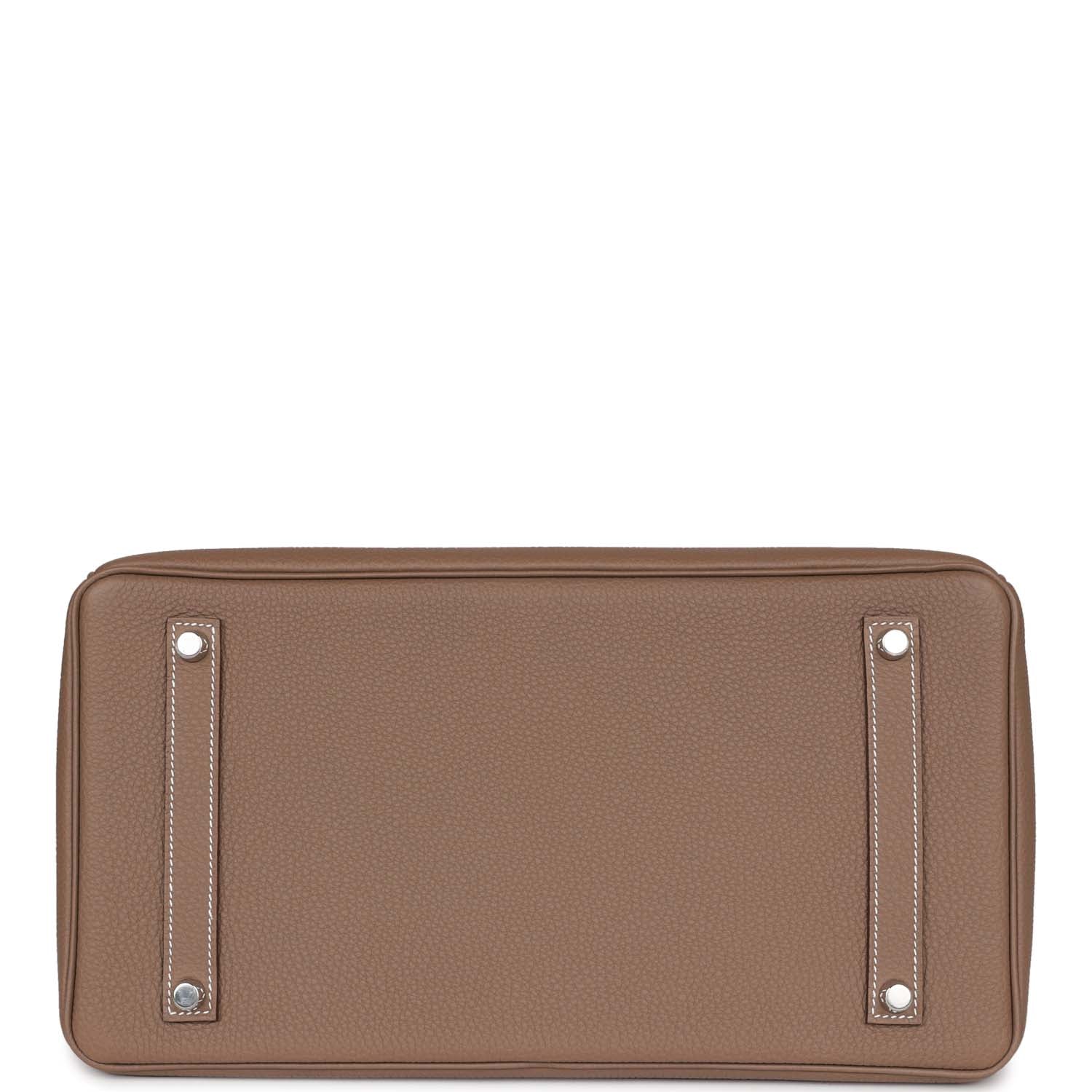 This Birkin is in Etoupe togo leather with palladium hardware and has contrast stitching, front flap, two straps with center toggle closure, clochette with lock and two keys, and double rolled handles.