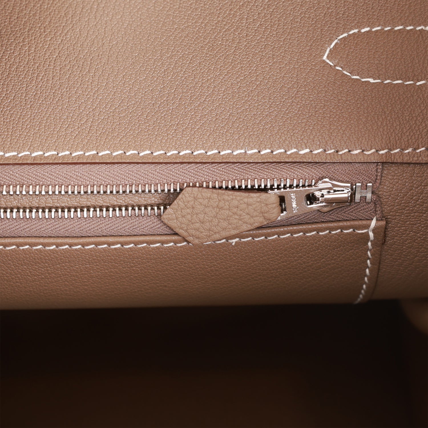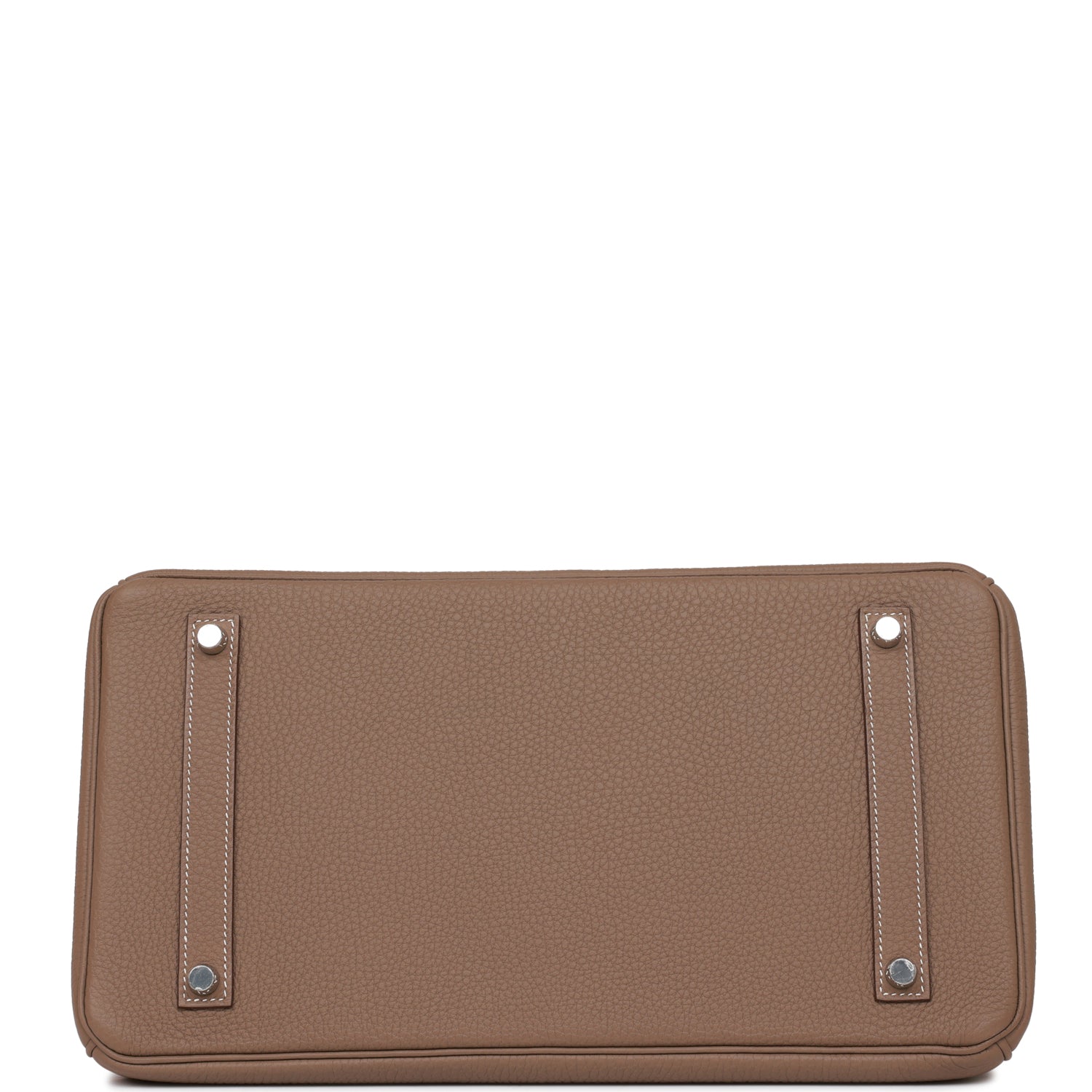 This Birkin is in Etoupe togo leather with palladium hardware and has contrast stitching, front flap, two straps with center toggle closure, clochette with lock and two keys, and double rolled handles.