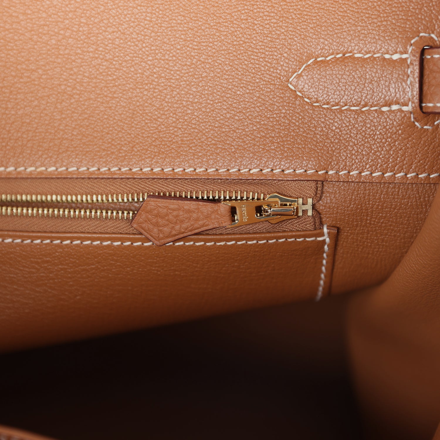 The interior is lined with Gold chevre and has one zip pocket with an Hermes engraved zipper pull and an open pocket on the opposite side.