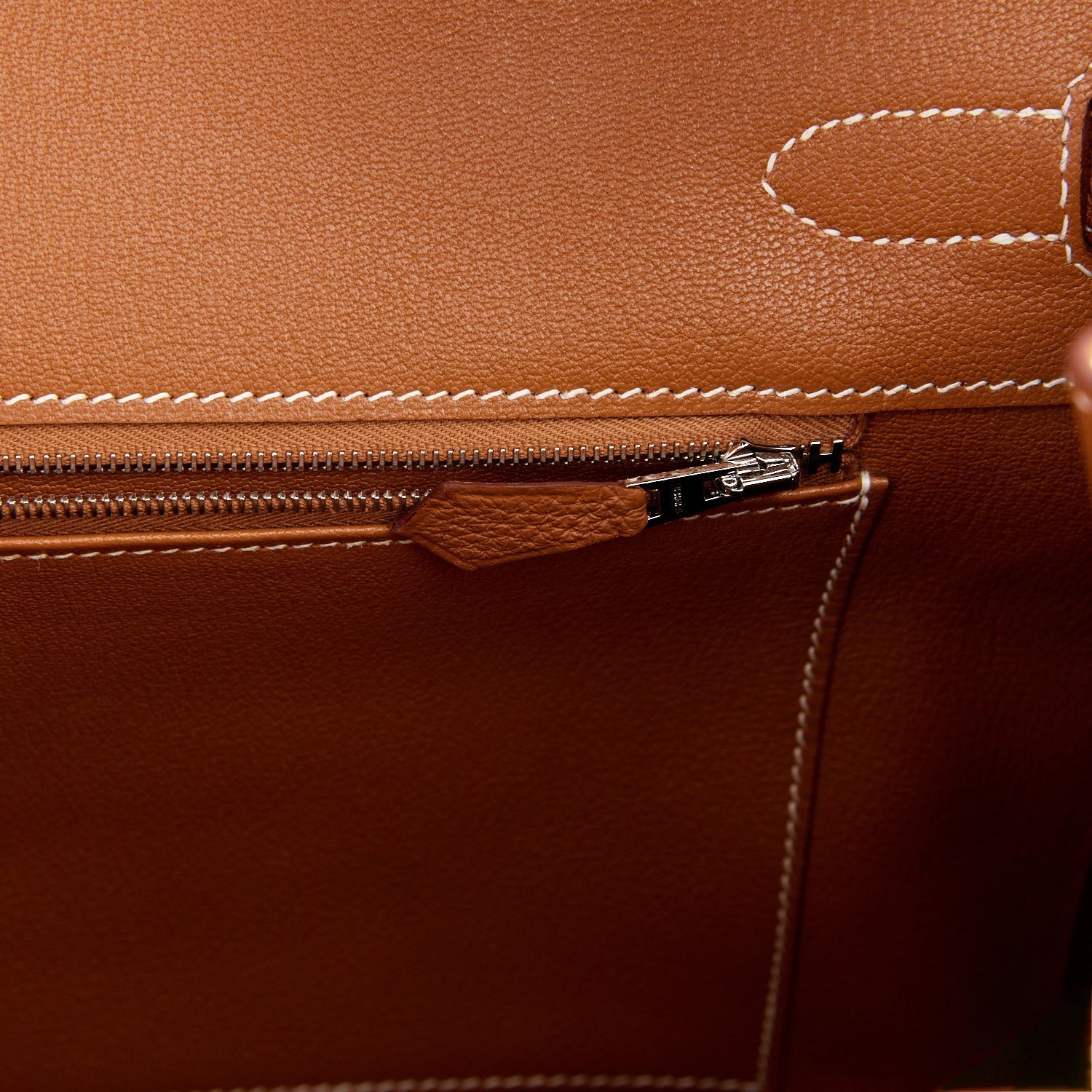 The interior is lined with gold chevre and has one zip pocket with an Hermes engraved zipper pull and an open pocket on the opposite side.