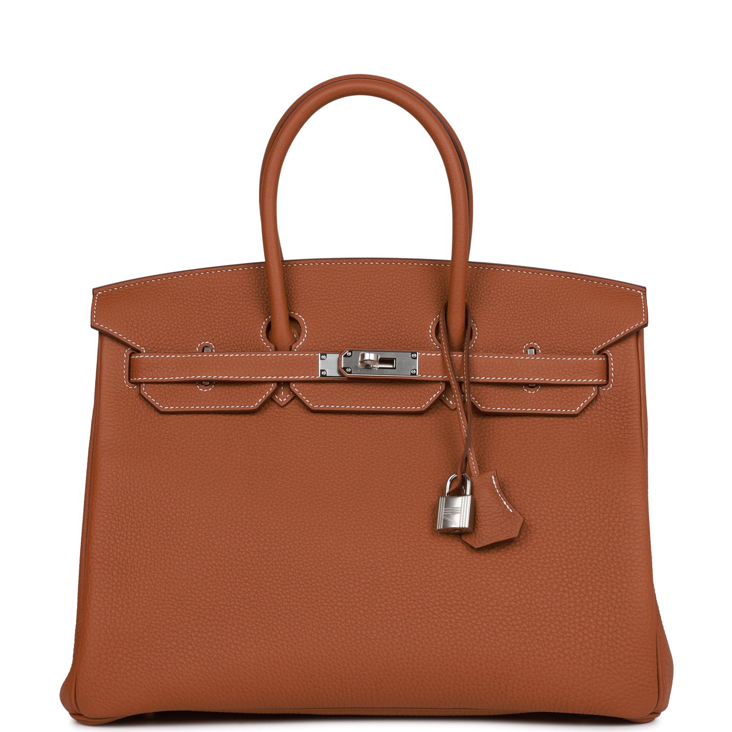 This Birkin is in Gold togo leather with gold hardware and has contrast stitching, two straps with front toggle closure, clochette with lock and two keys and double rolled handles.