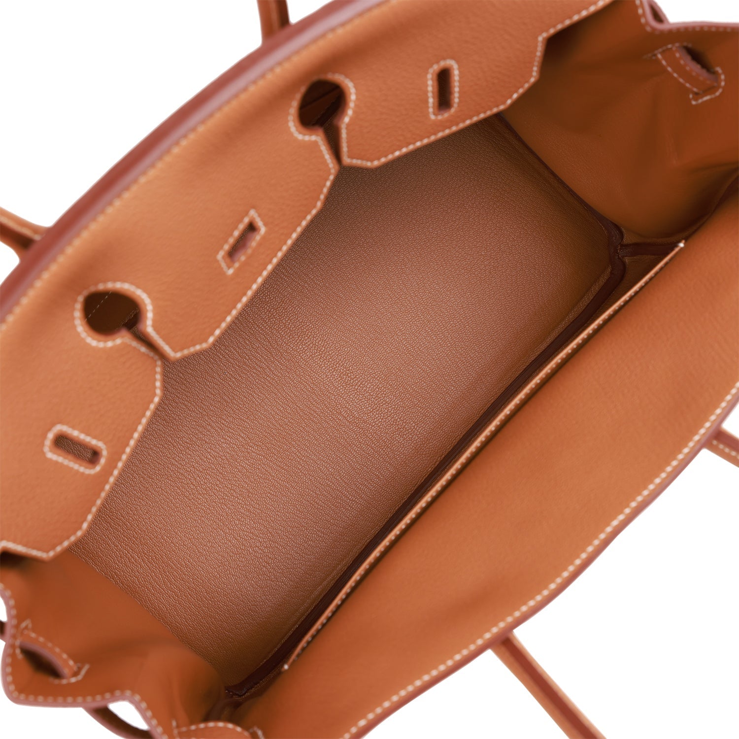 The interior is lined with gold chevre and has one zip pocket with an Hermes engraved zipper pull and an open pocket on the opposite side.
