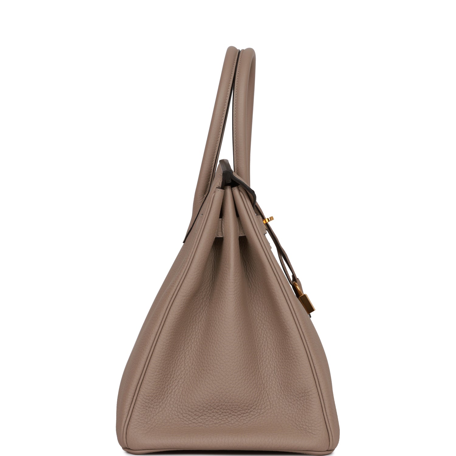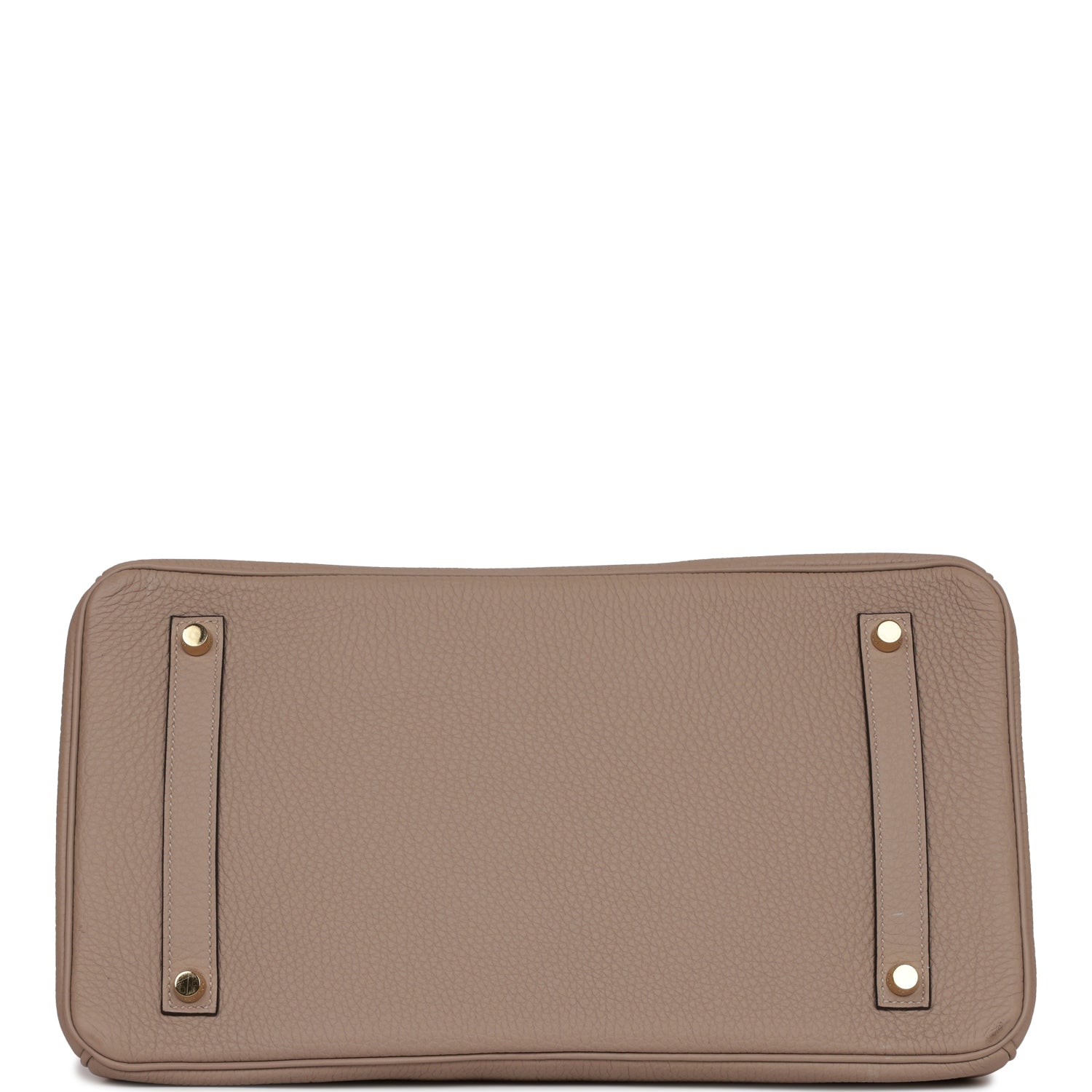 This Birkin is in Gris Tourterelle togo leather with gold hardware and has tonal stitching, front flap, two straps with center toggle closure, clochette with lock and two keys, and double rolled handles.
