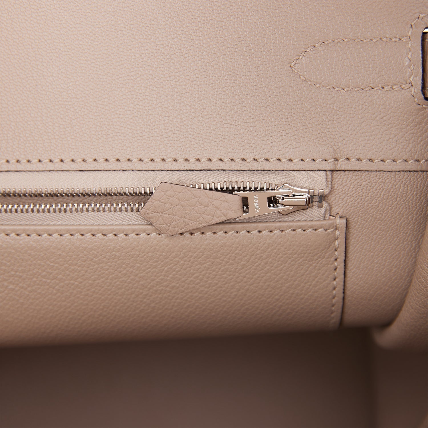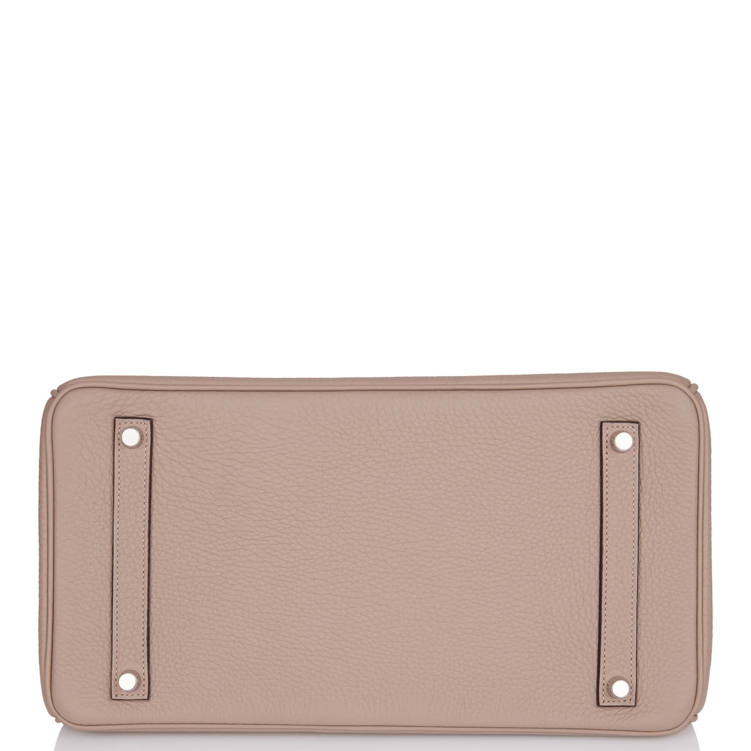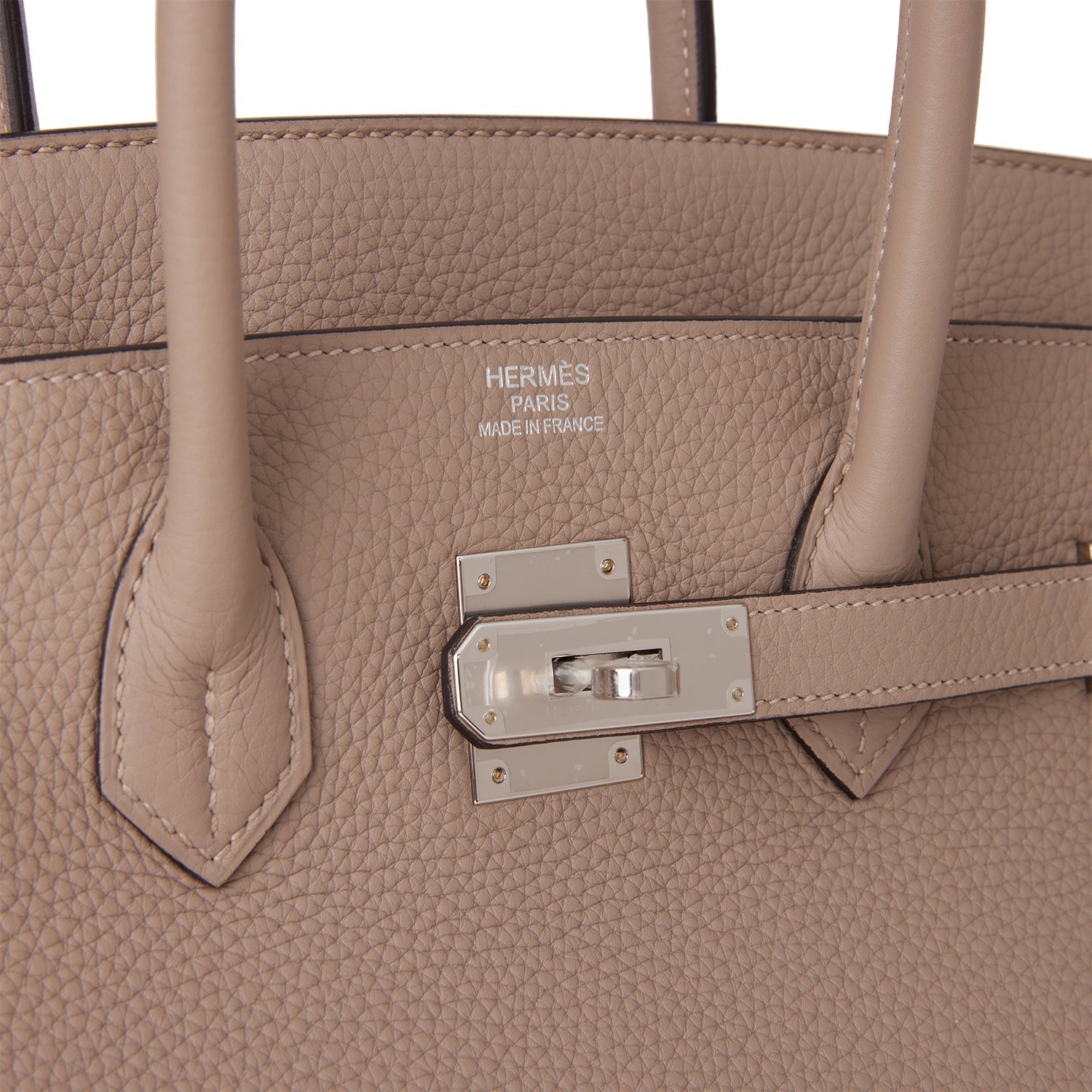 This Birkin is in Gris Tourterelle togo leather with palladium hardware and has tonal stitching, front flap, two straps with center toggle closure, clochette with lock and two keys, and double rolled handles.