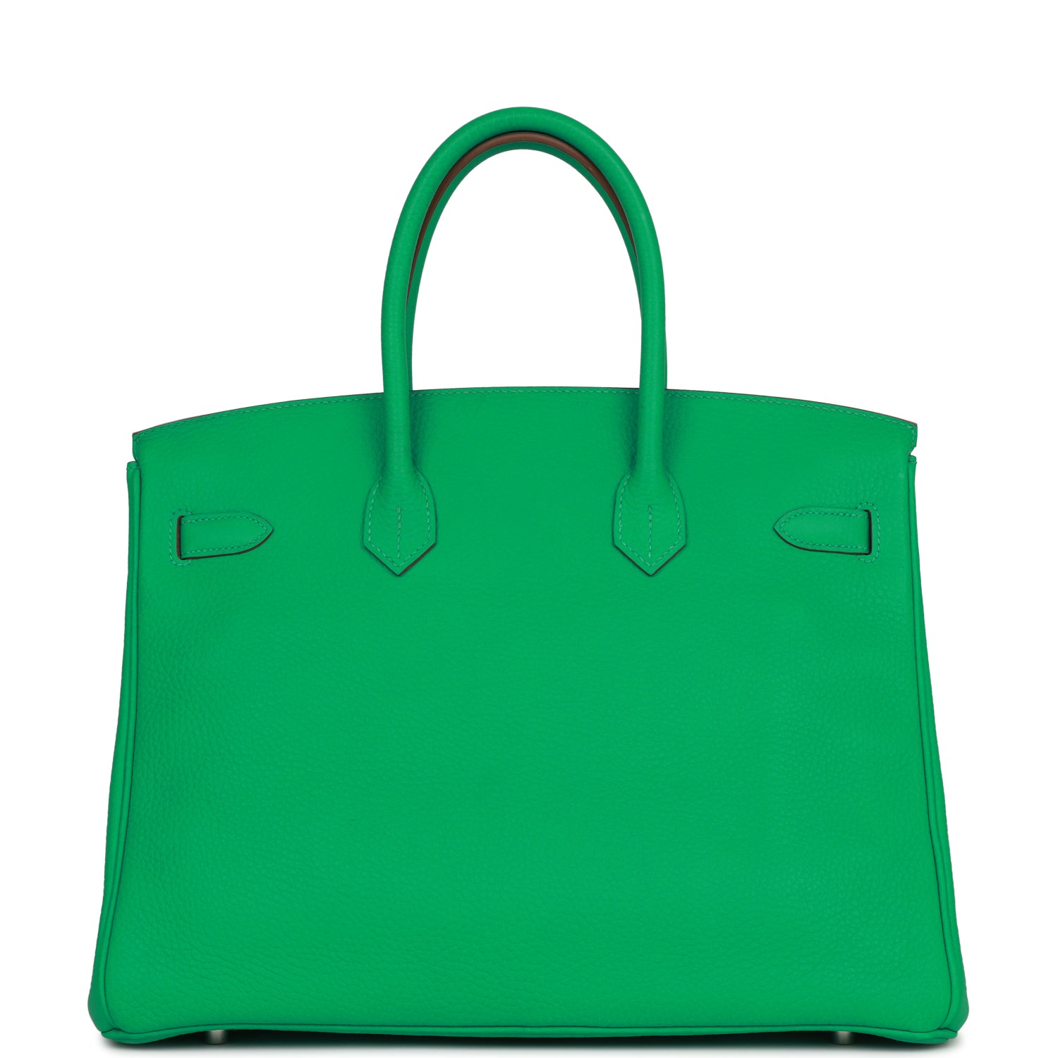 This Birkin is in Menthe clemence leather with palladium hardware and has tonal stitching, front flap, two straps with center toggle closure, clochette with lock and two keys, and double rolled handles.