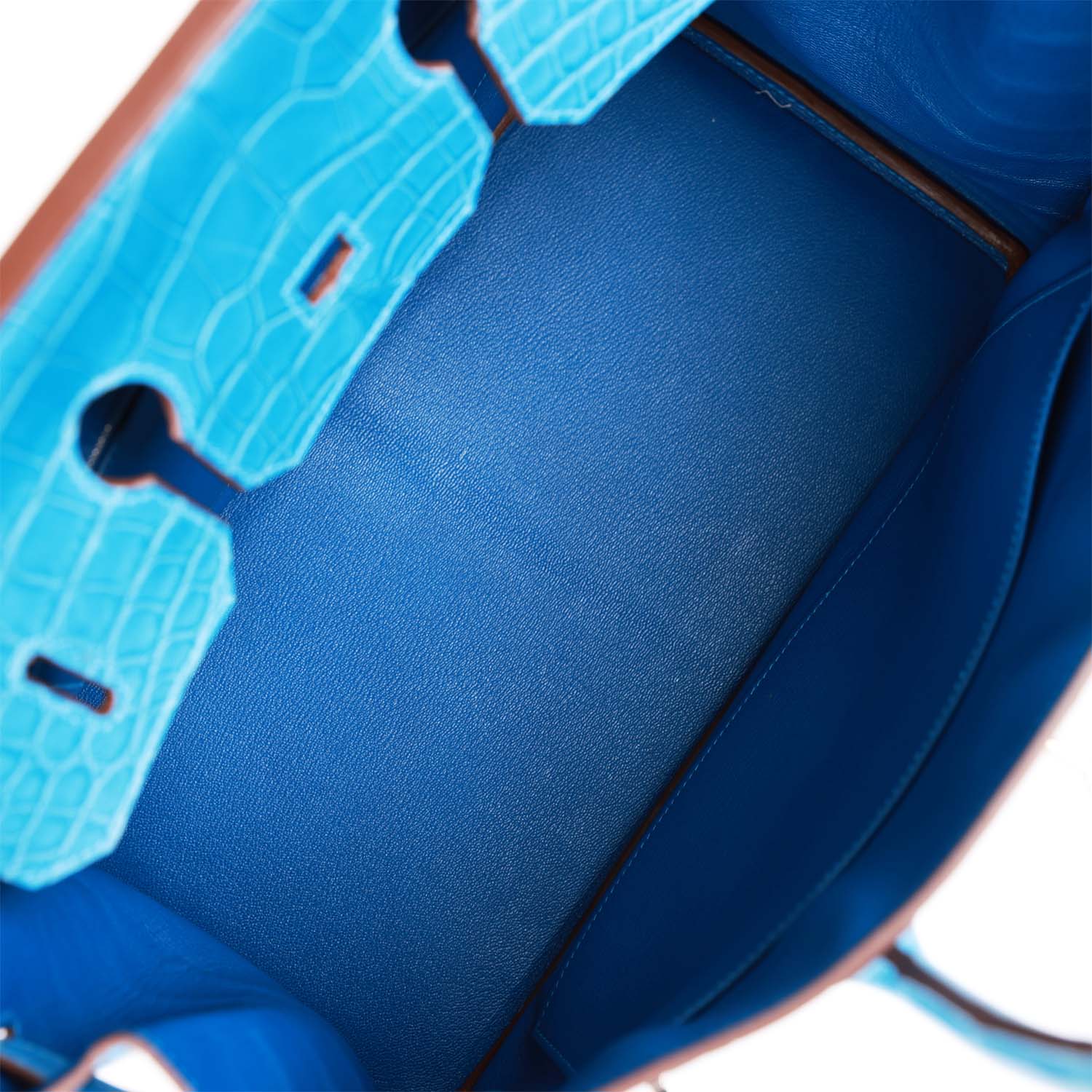 This Birkin is of Mykonos Matte Alligator Mississippiensis with palladium hardware and features tonal stitching, front flap, two straps with center toggle closure, clochette with lock and two keys, and double rolled handles.