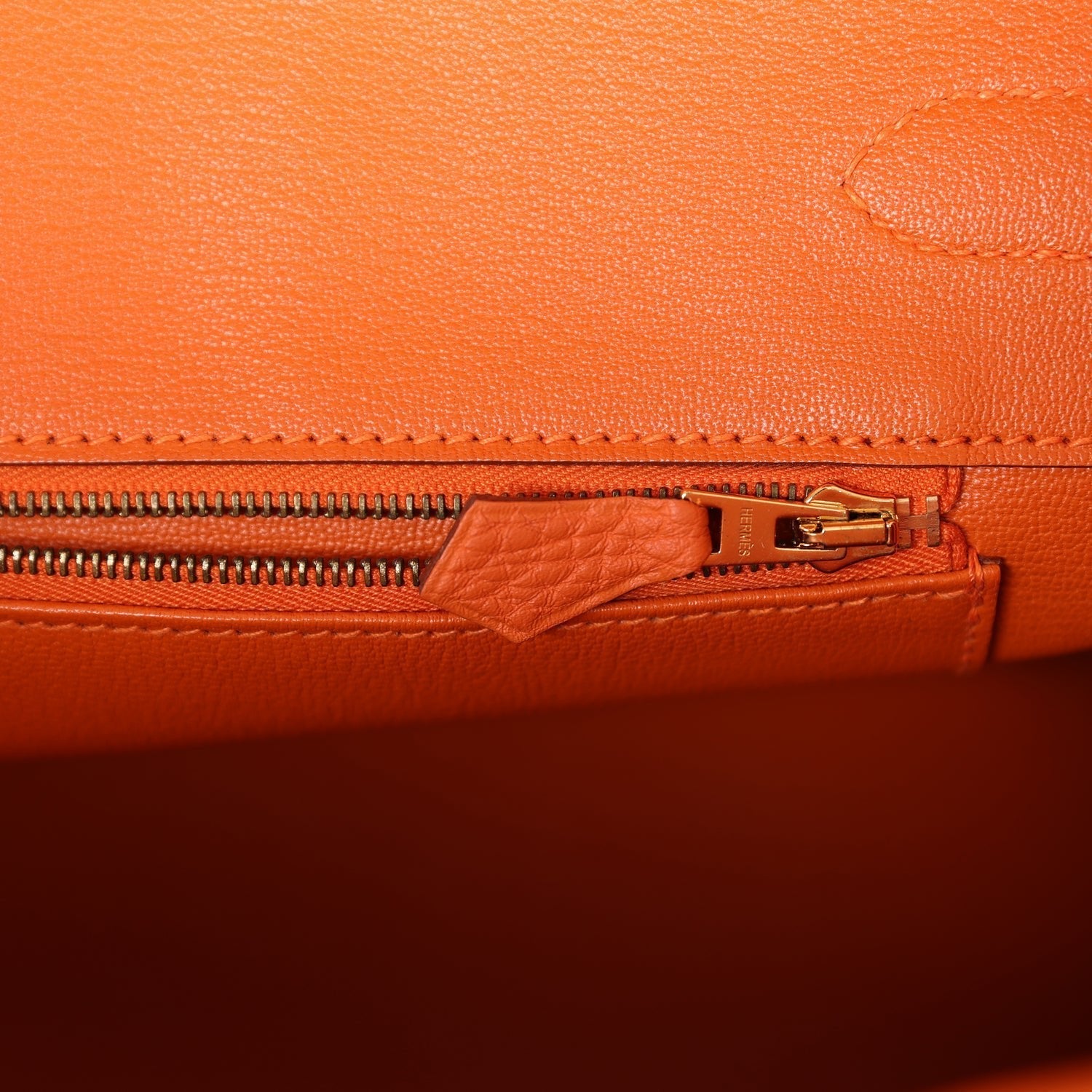 The interior is lined with Orange H chevre and has one zip pocket with an Hermes engraved zipper pull and an open pocket on the opposite side.