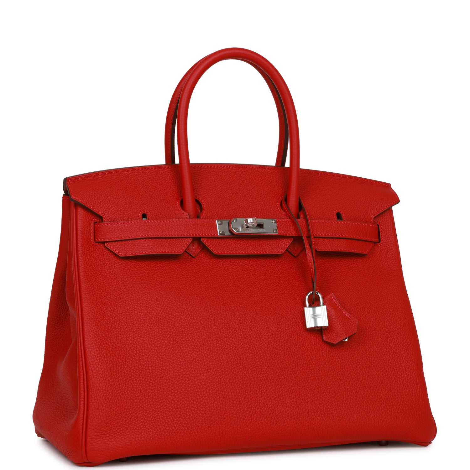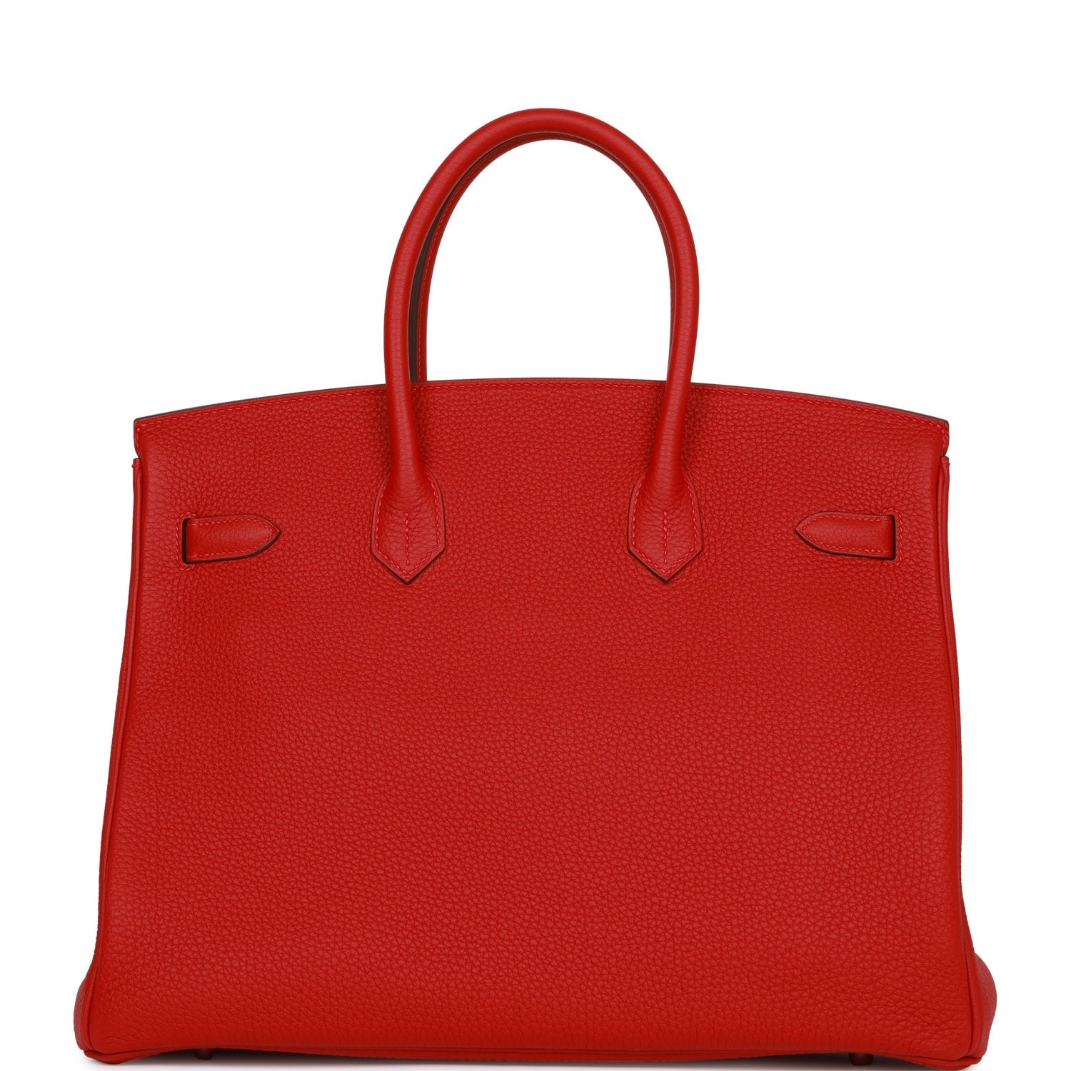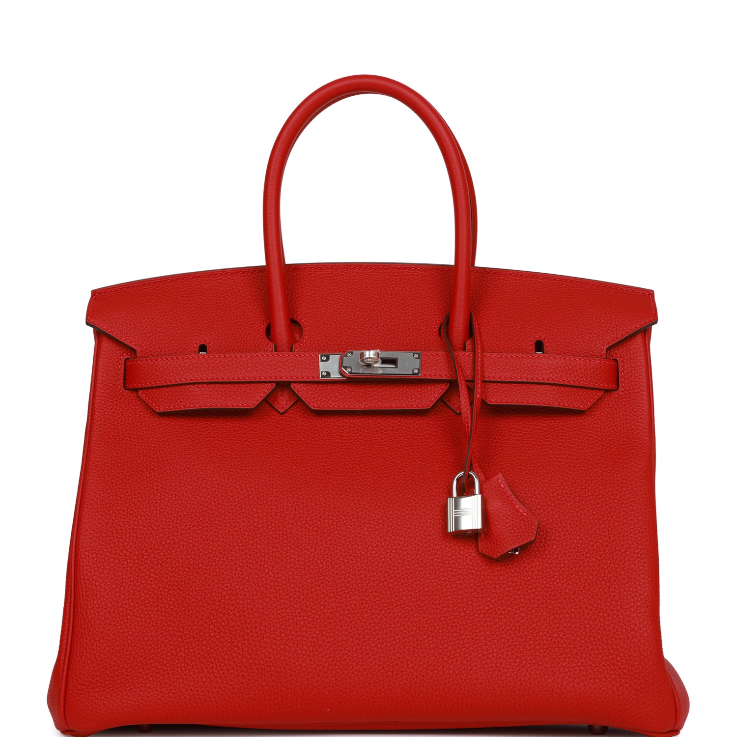This Birkin is in Rouge Casaque togo leather with palladium hardware and has tonal stitching, front flap, two straps with center toggle closure, clochette with lock and two keys, and double rolled handles.