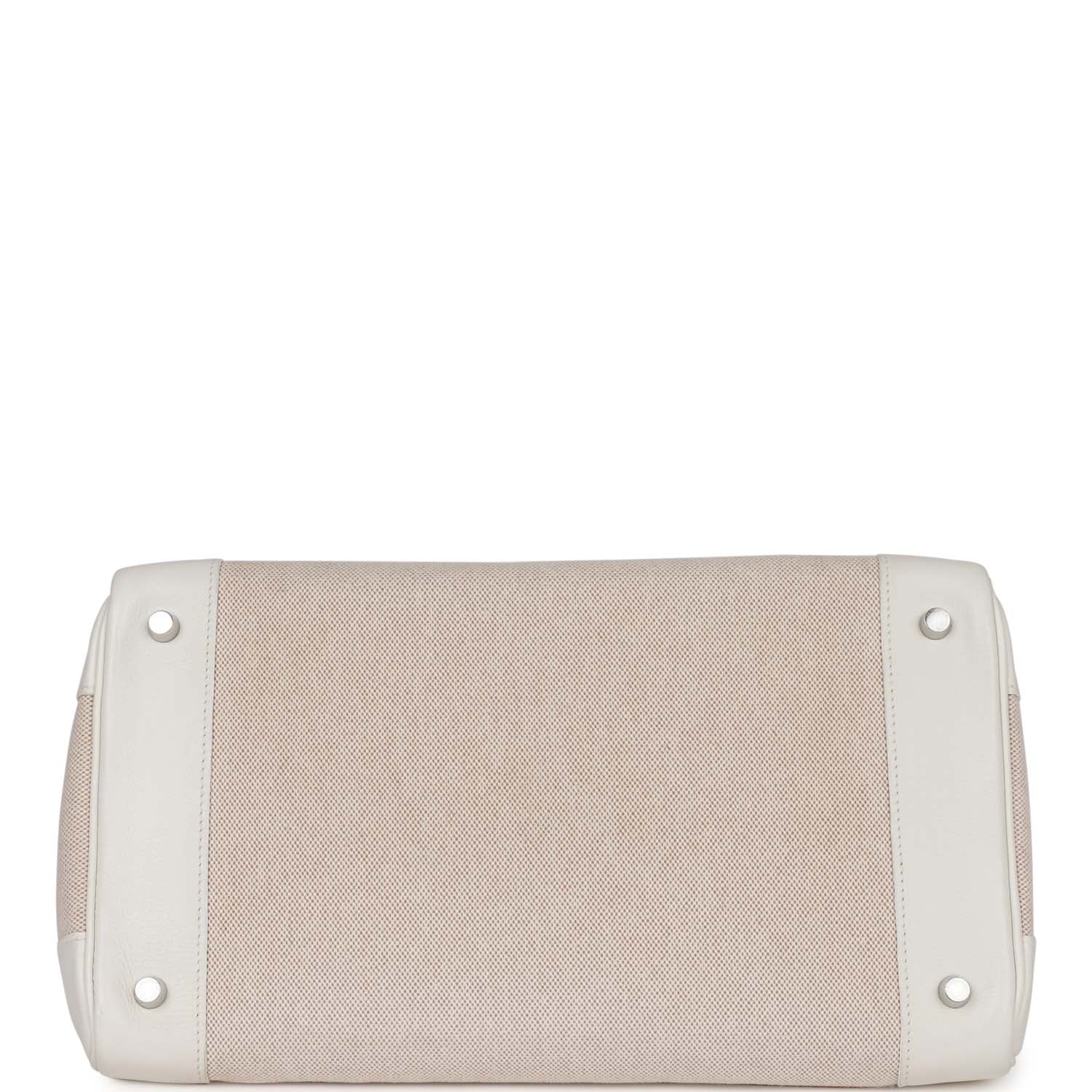 This Birkin is in White gulliver leather and toile with palladium hardware, tonal stitching, front flap with two straps, front toggle closure, clochette with lock and two keys, double rolled handles.