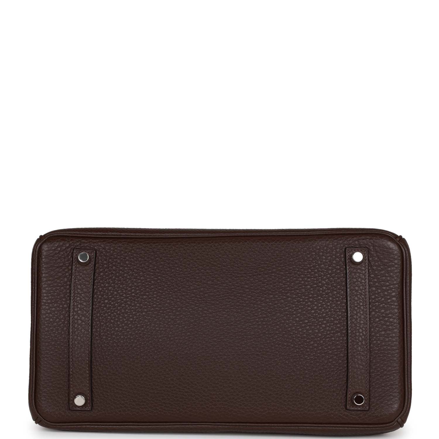 This Birkin is in Chocolate togo leather with palladium hardware, tonal stitching, front flap with two straps, front toggle closure, clochette with lock and two keys, double rolled handles