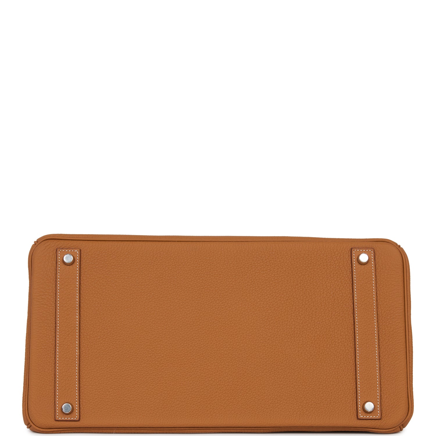 This Birkin is in Gold togo leather with palladium hardware and has contrast stitching, two straps with front toggle closure, clochette with lock and two keys and double rolled handles.