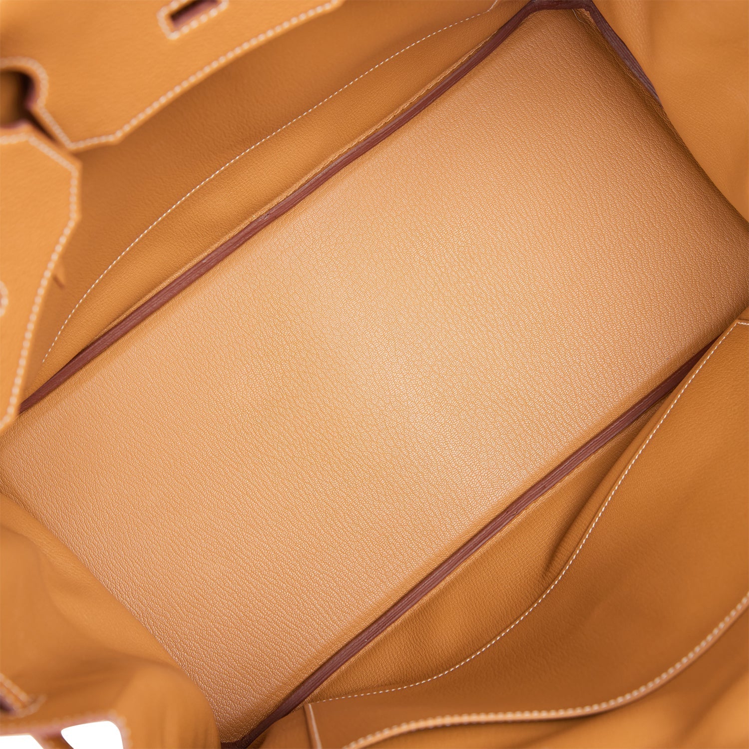 The interior is lined in gold chevre with one zip pocket with an Hermes engraved zipper pull and an open pocket on the opposite side.
