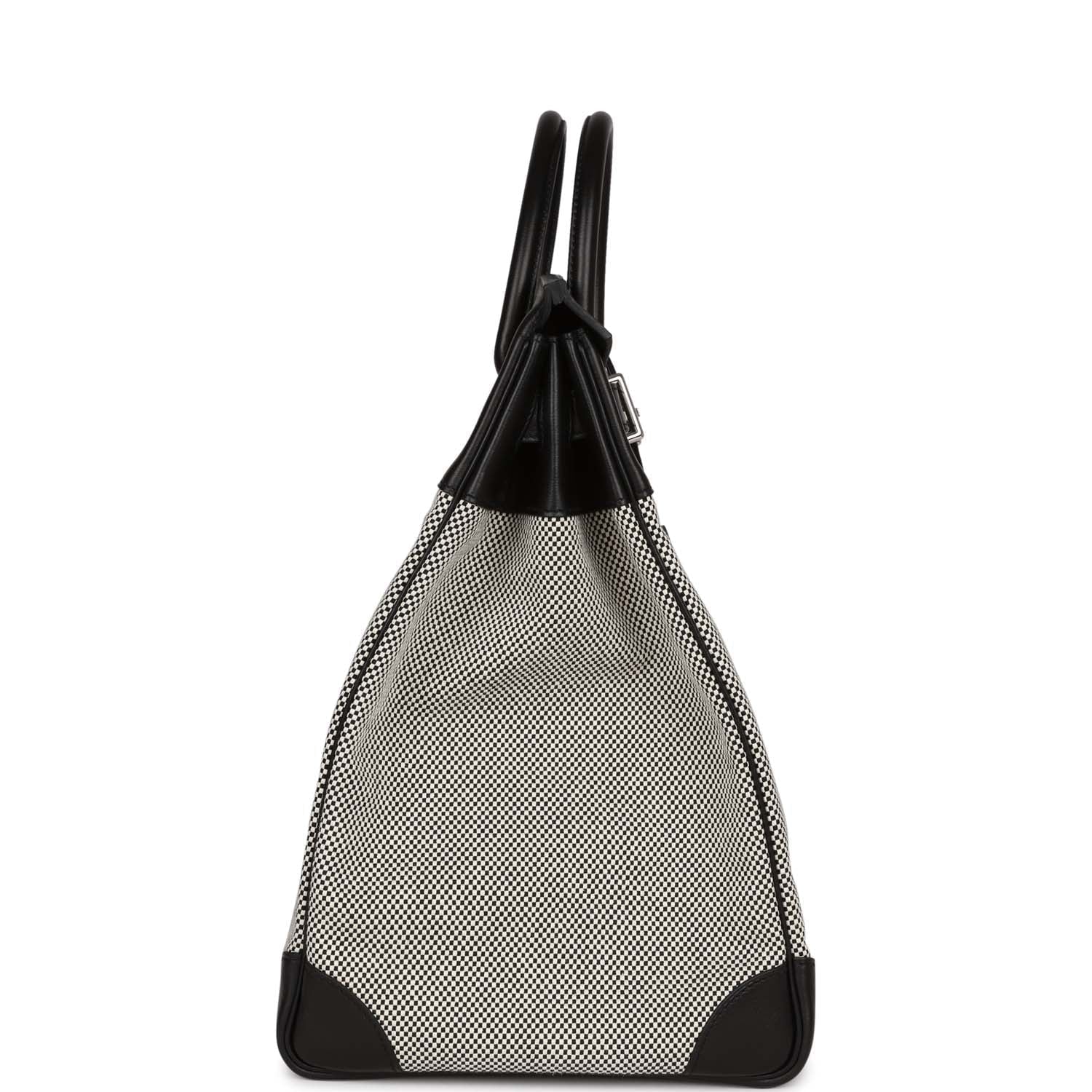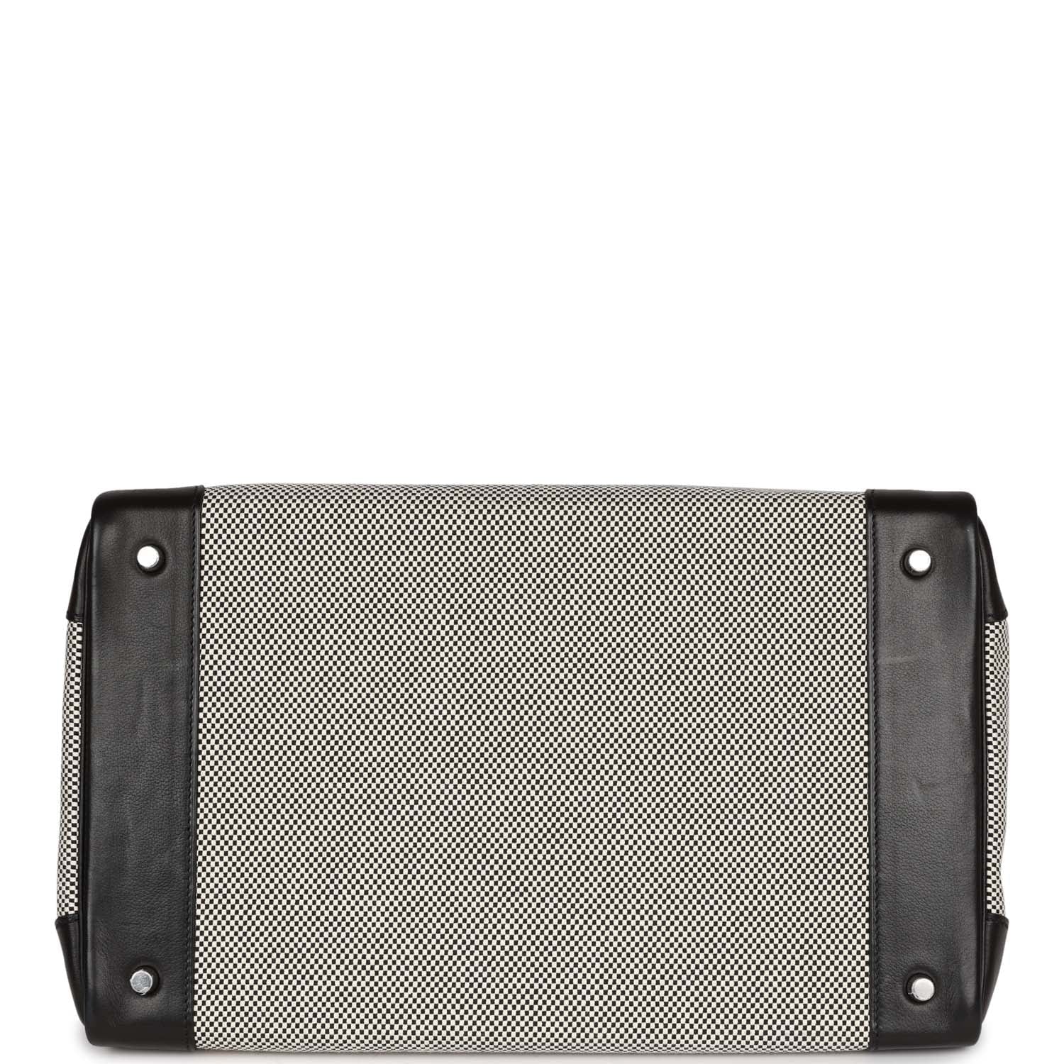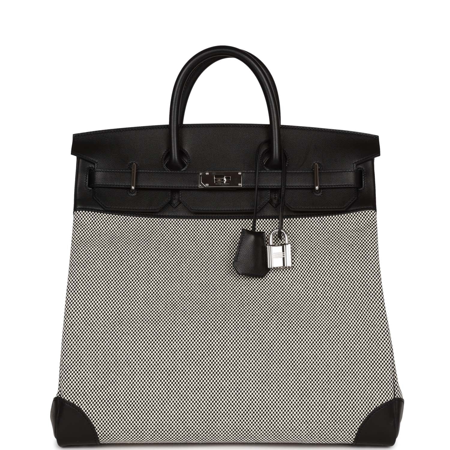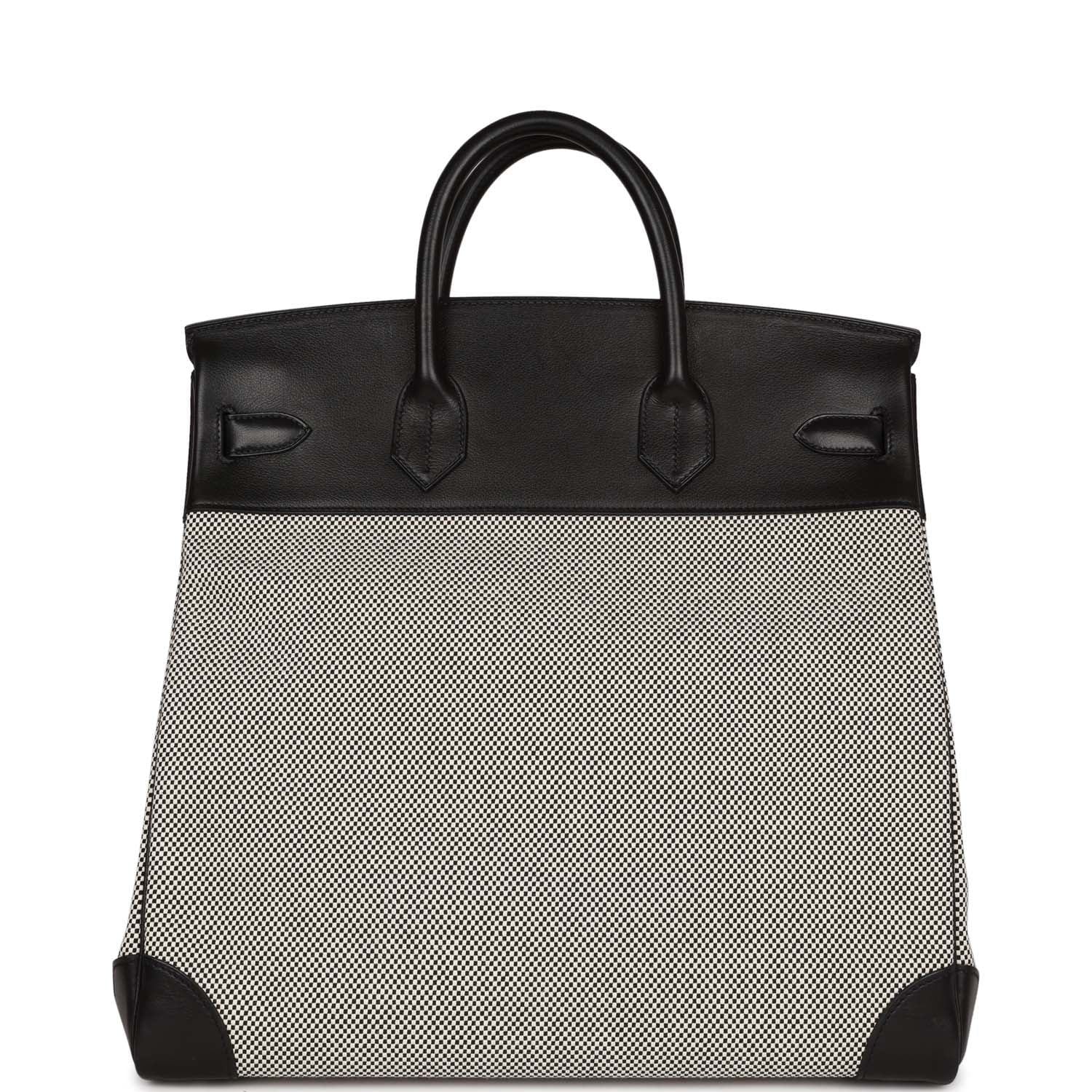 This Birkin 40 HAC, is in Black evercolor leather and toile with palladium hardware, tonal stitching, front flap with two straps, front toggle closure, clochette with lock and two keys, and double rolled handles.