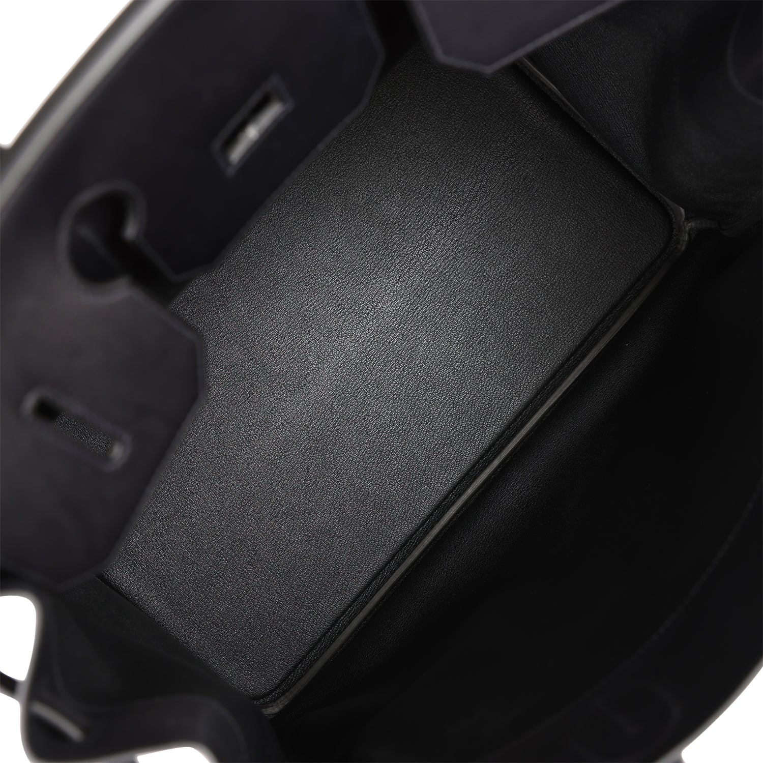 This Limited Edition Rock HAC 40 is in Black Evercolor leather with palladium hardware, features a diagonal saddle shaped zippered pocket and a detachable fastened pocket on a keychain, tonal stitching, double rolled handles, clochette, 2 keys, 1 lock, toggle front closure, no inside pockets, 1 zippered pocket on back of bag.