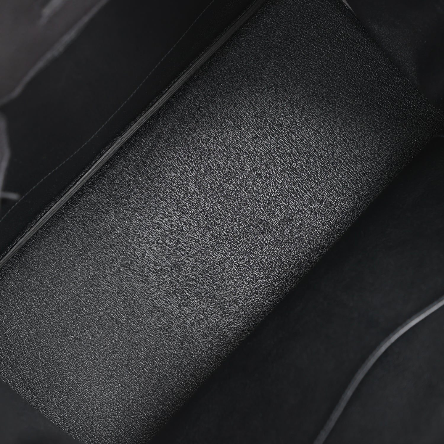 The interior is lined with black chevre with zip pocket with Hermes engraved pull; pocket on opposite side.