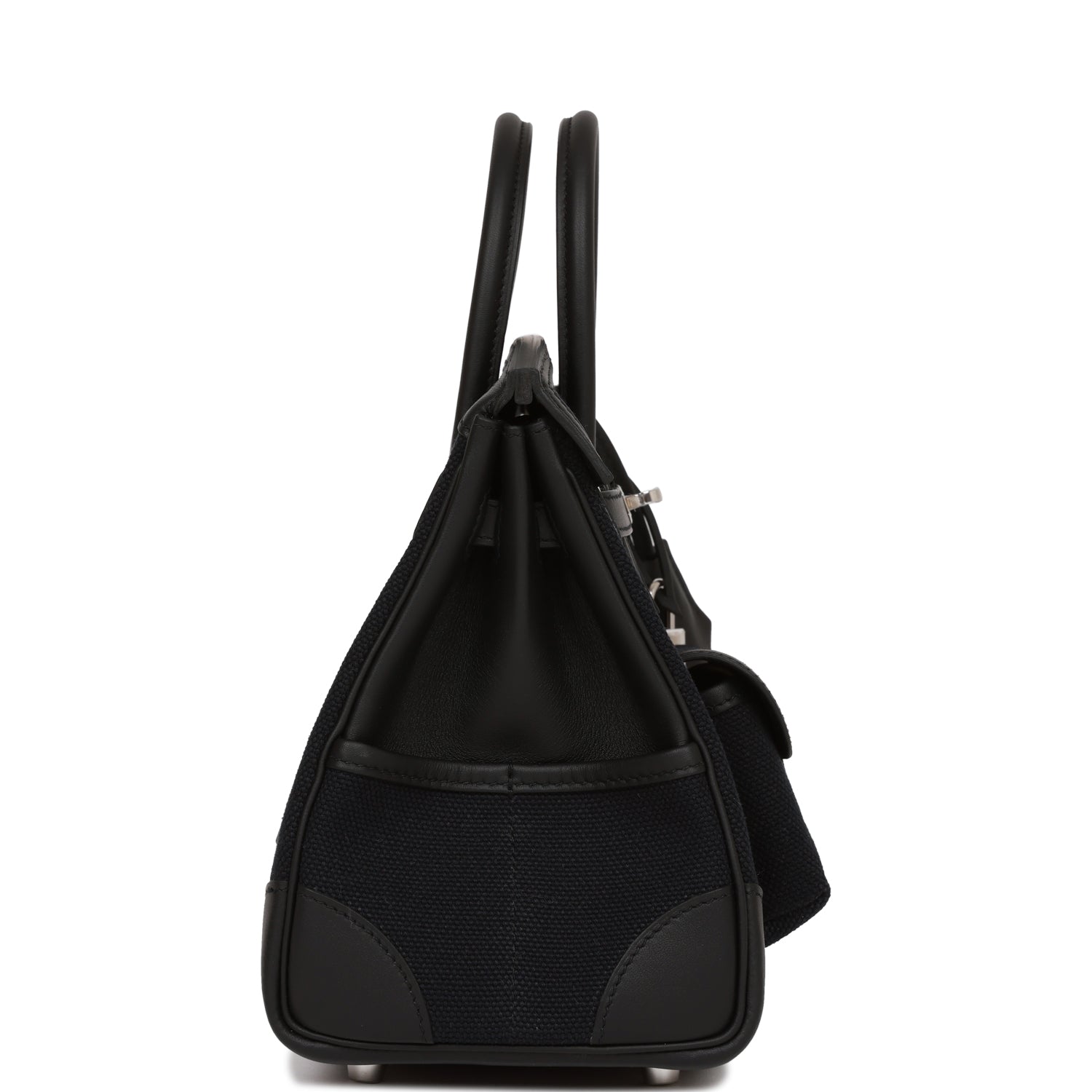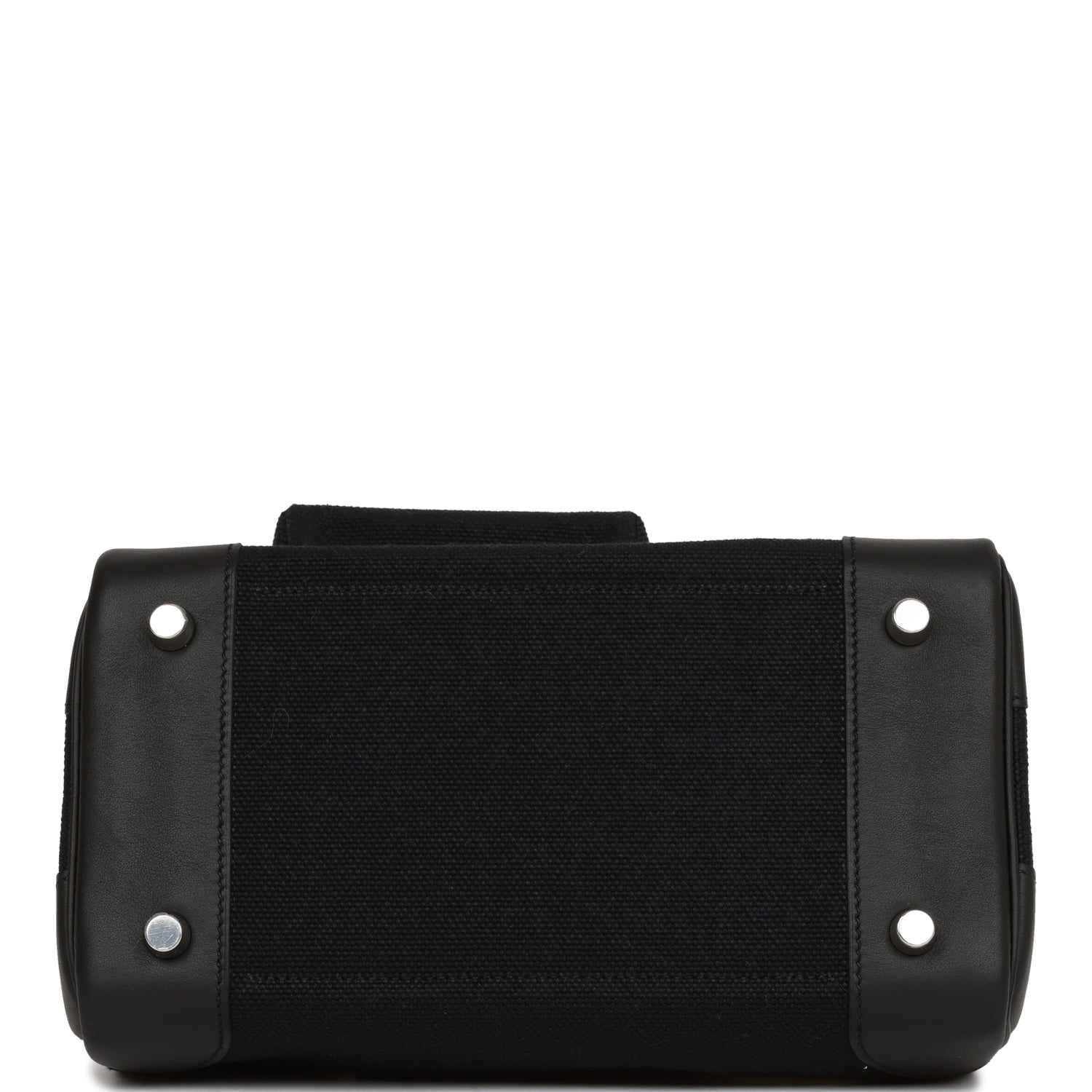 This rare "Cargo" Birkin is of black swift and toile canvas with palladium hardware and features tonal stitching, four outer pockets, front flap, two straps with center toggle closure, clochette with lock and two keys, and double rolled handles.