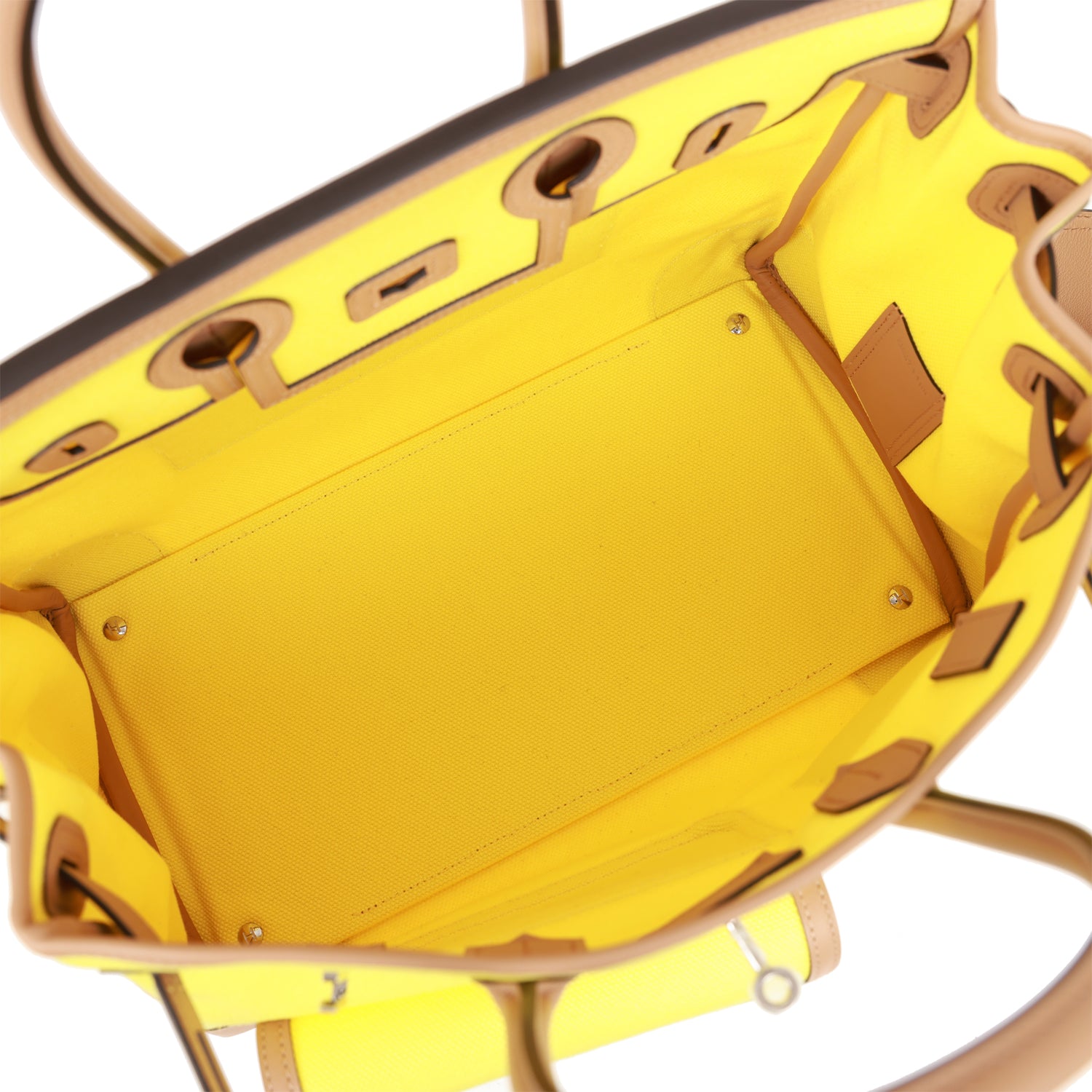 This rare "Cargo" Birkin is of Jaune Citron/Chai swift and toile canvas with palladium hardware and features tonal stitching, five outer pockets, removable cup holder, front flap, two straps with center toggle closure, clochette with lock and two keys, and double rolled handles.