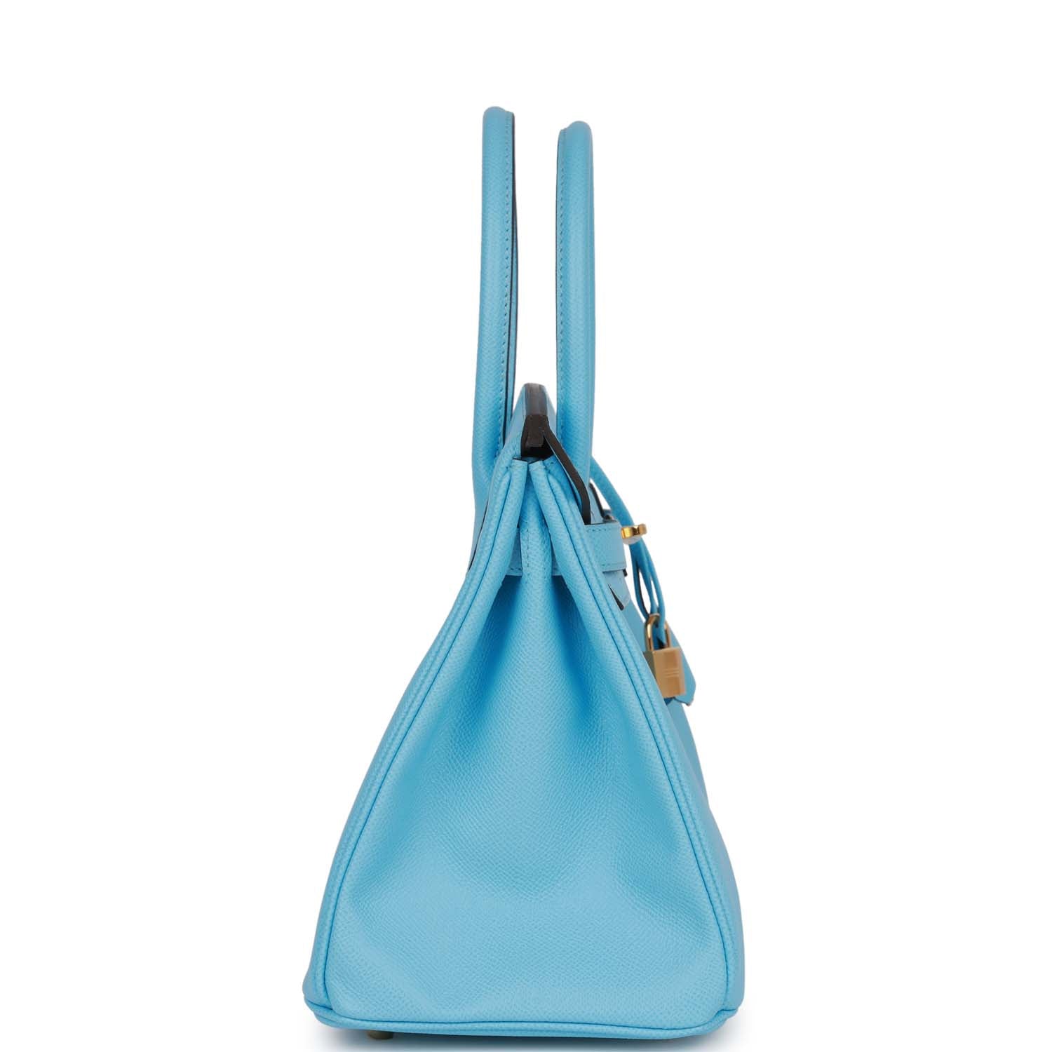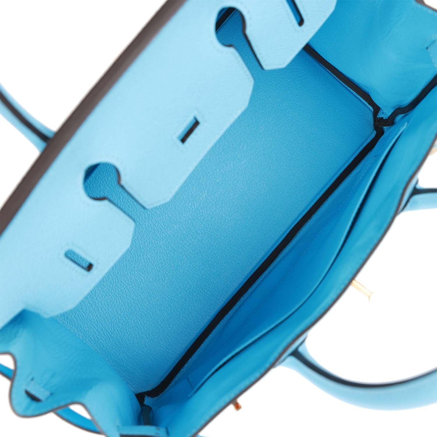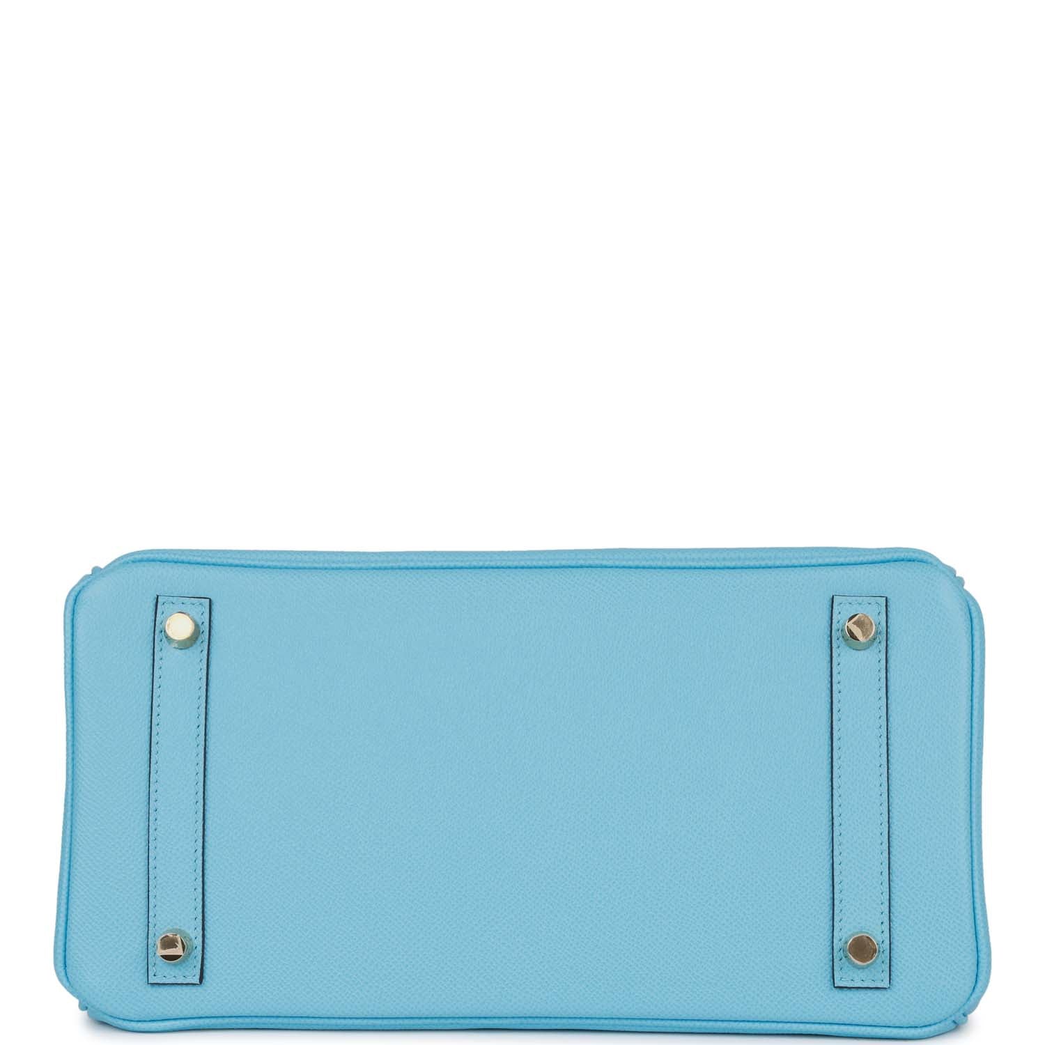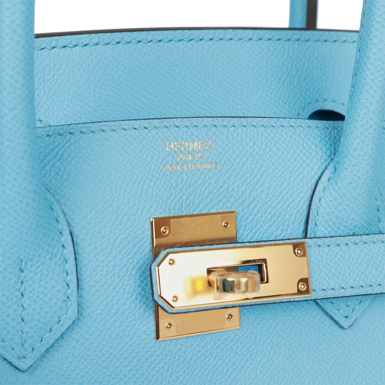 This Birkin is in Bleu Celeste epsom leather with gold hardware, tonal stitching, front flap with two straps, front toggle closure, clochette with lock and two keys, and double rolled handles.
