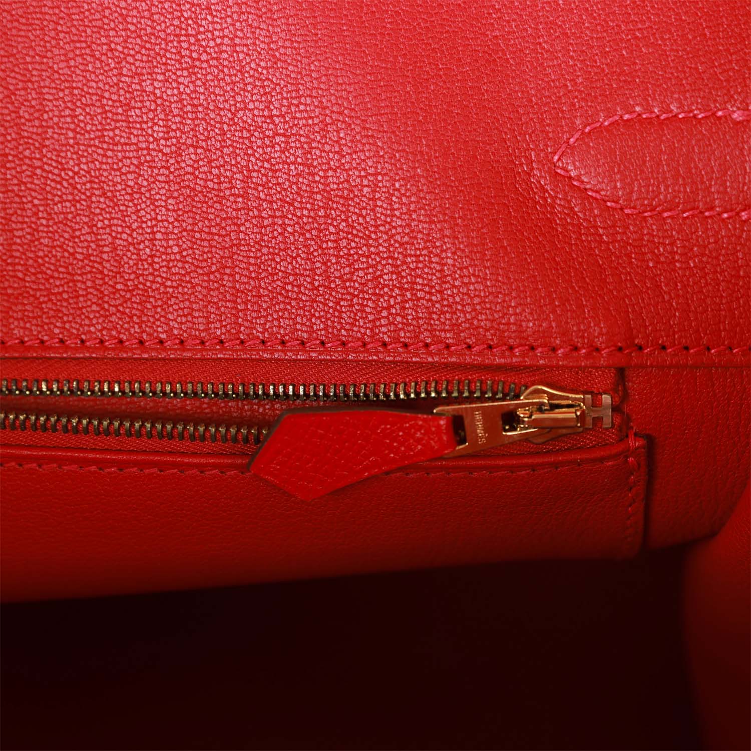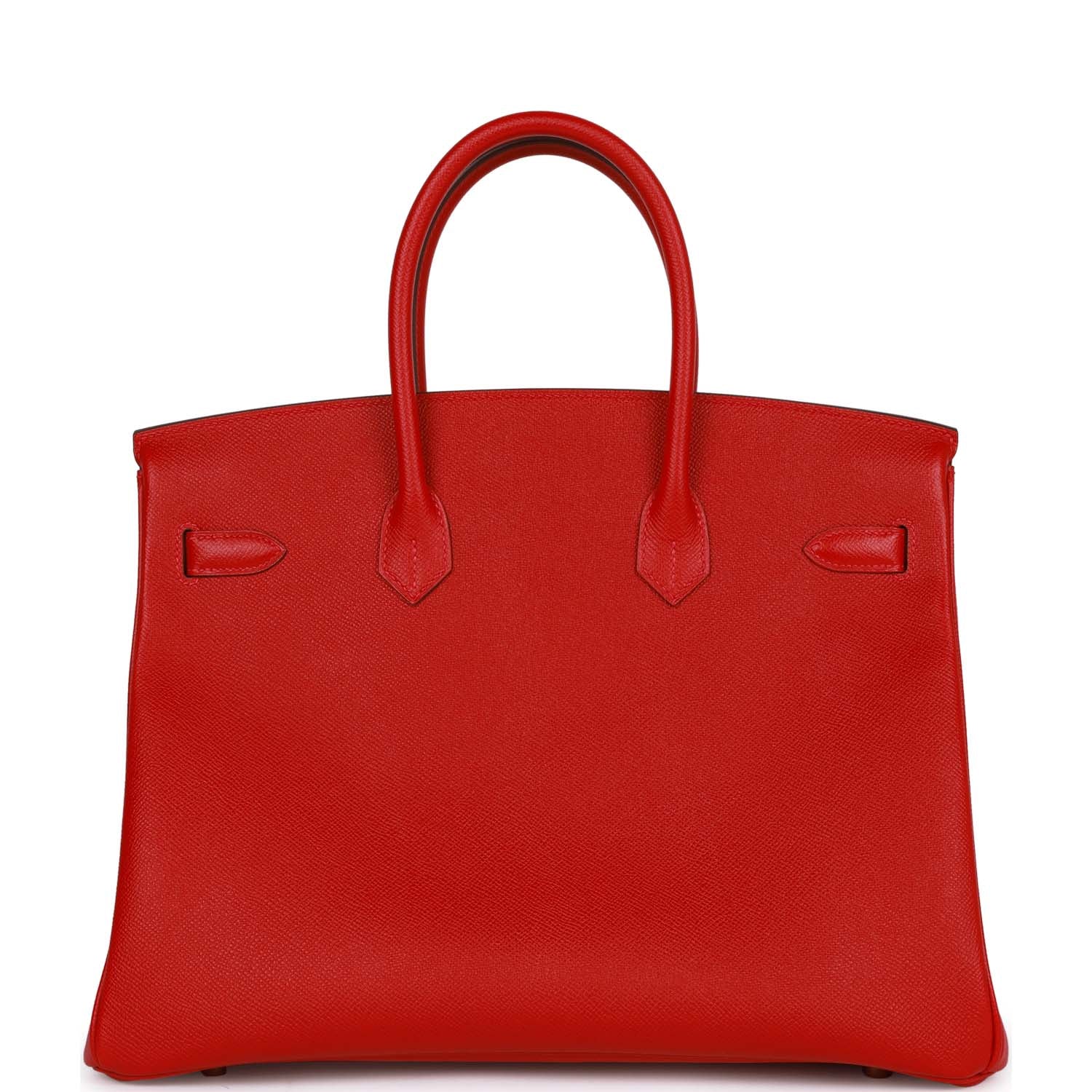 This Birkin is in Rouge Casaque epsom leather with gold hardware and features tonal stitching, front flap, two straps with center toggle closure, clochette with lock and two keys, and double rolled handles.