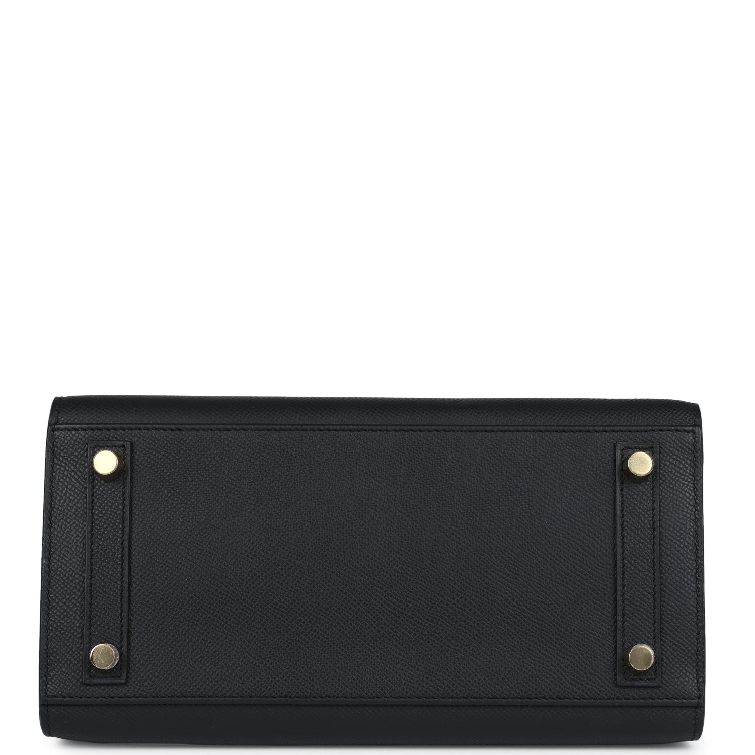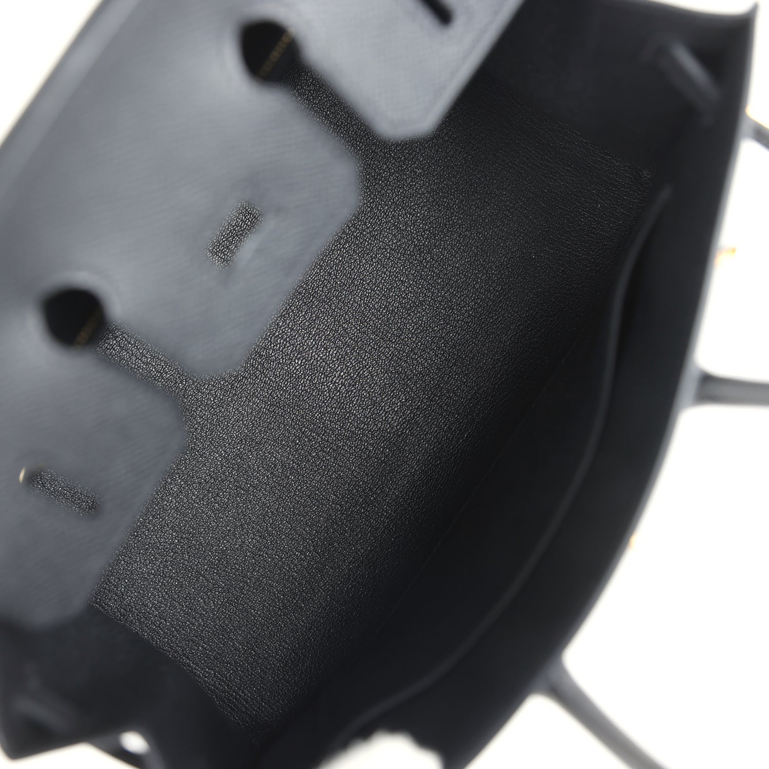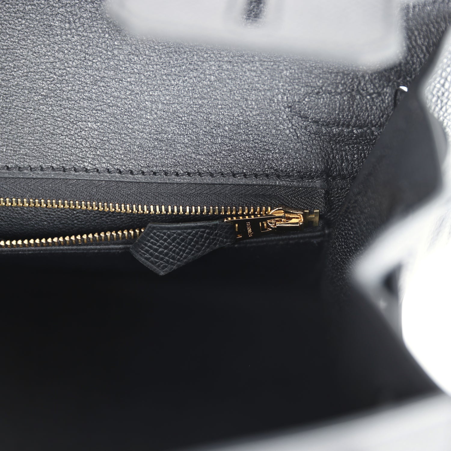 This Birkin is in Black epsom leather with gold hardware, has tonal stitching, front flap, two straps with center toggle closure, clochette with lock and two keys, and double rolled handles.