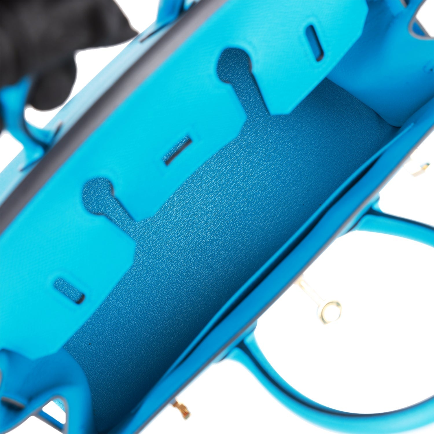 This Sellier Birkin is in Bleu Frida epsom leather with gold hardware and has tonal stitching, front flap, two straps with center toggle closure, clochette with lock and two keys, and double rolled handles.