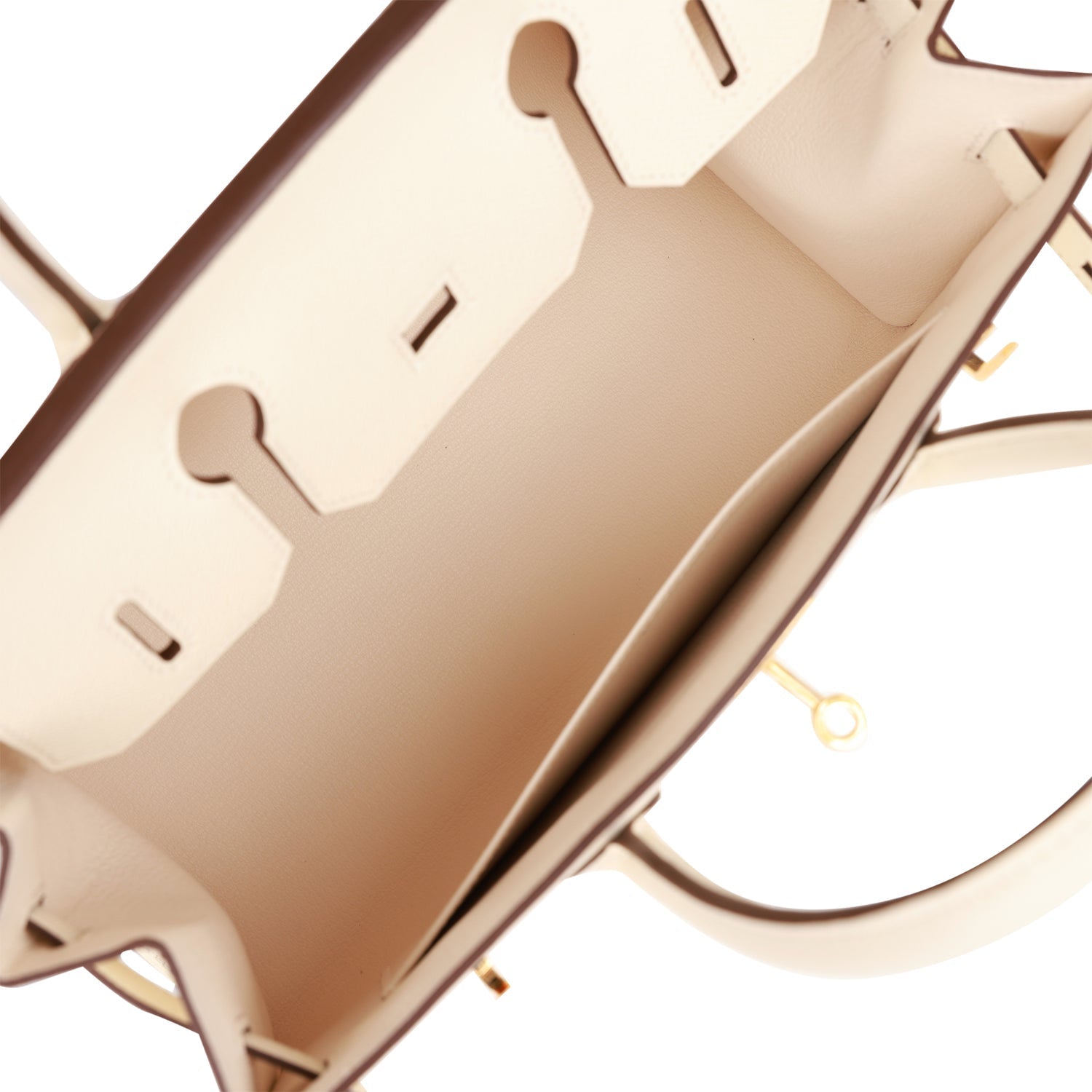 This Sellier Birkin is in Nata epsom leather with gold hardware and has tonal stitching, front flap, two straps with center toggle closure, clochette with lock and two keys, and double rolled handles.