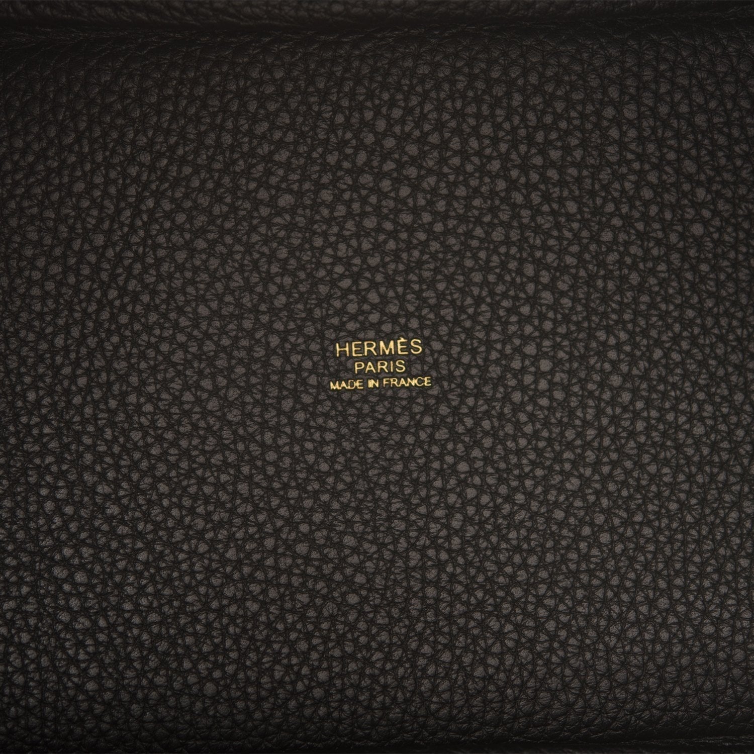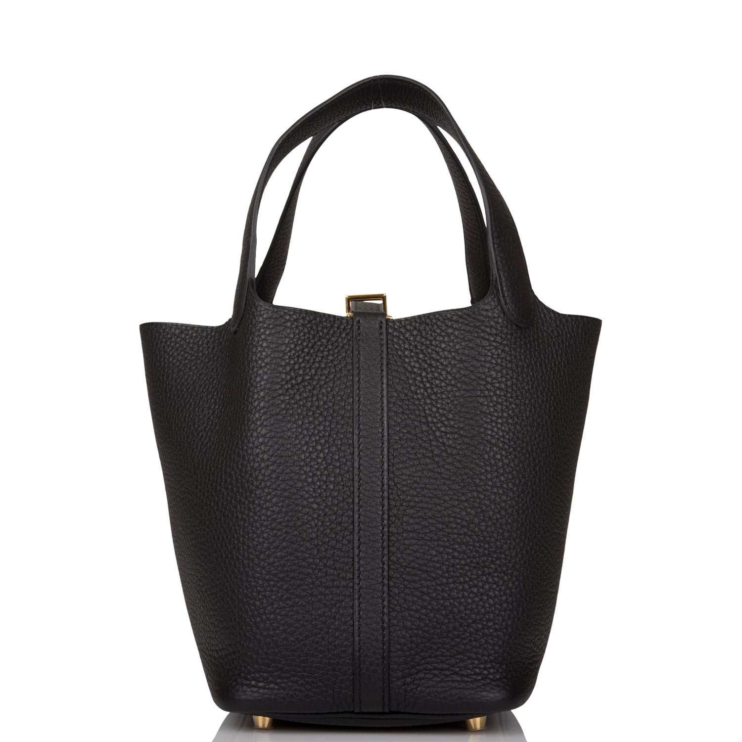 This Picotin Lock is in Black clemence leather with gold hardware and has tonal stitching with two top handles.