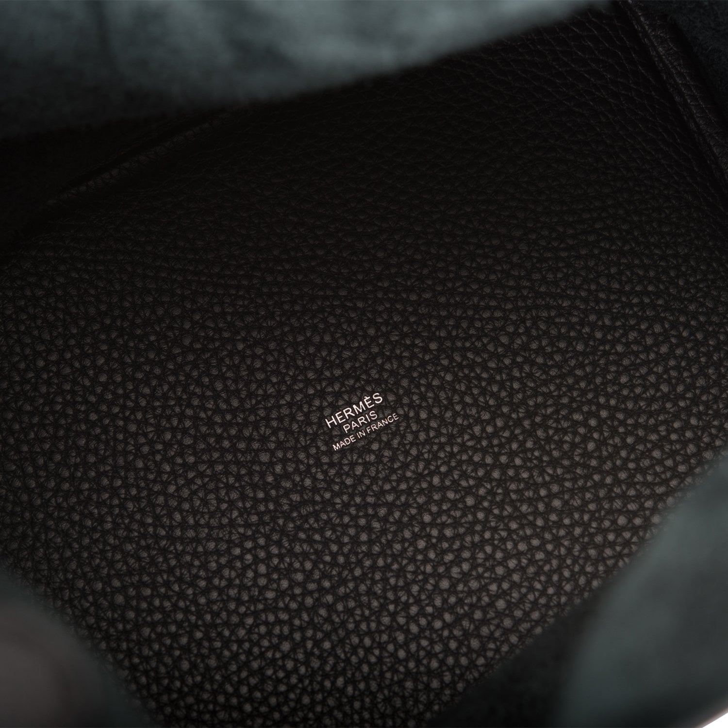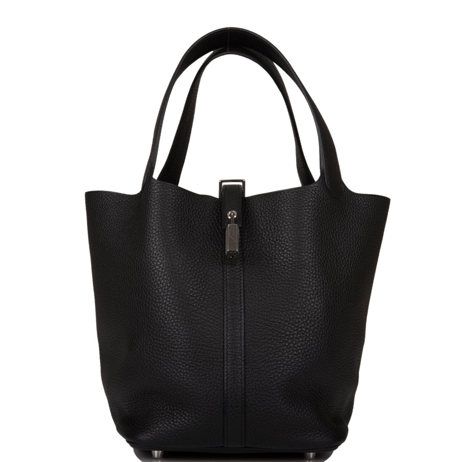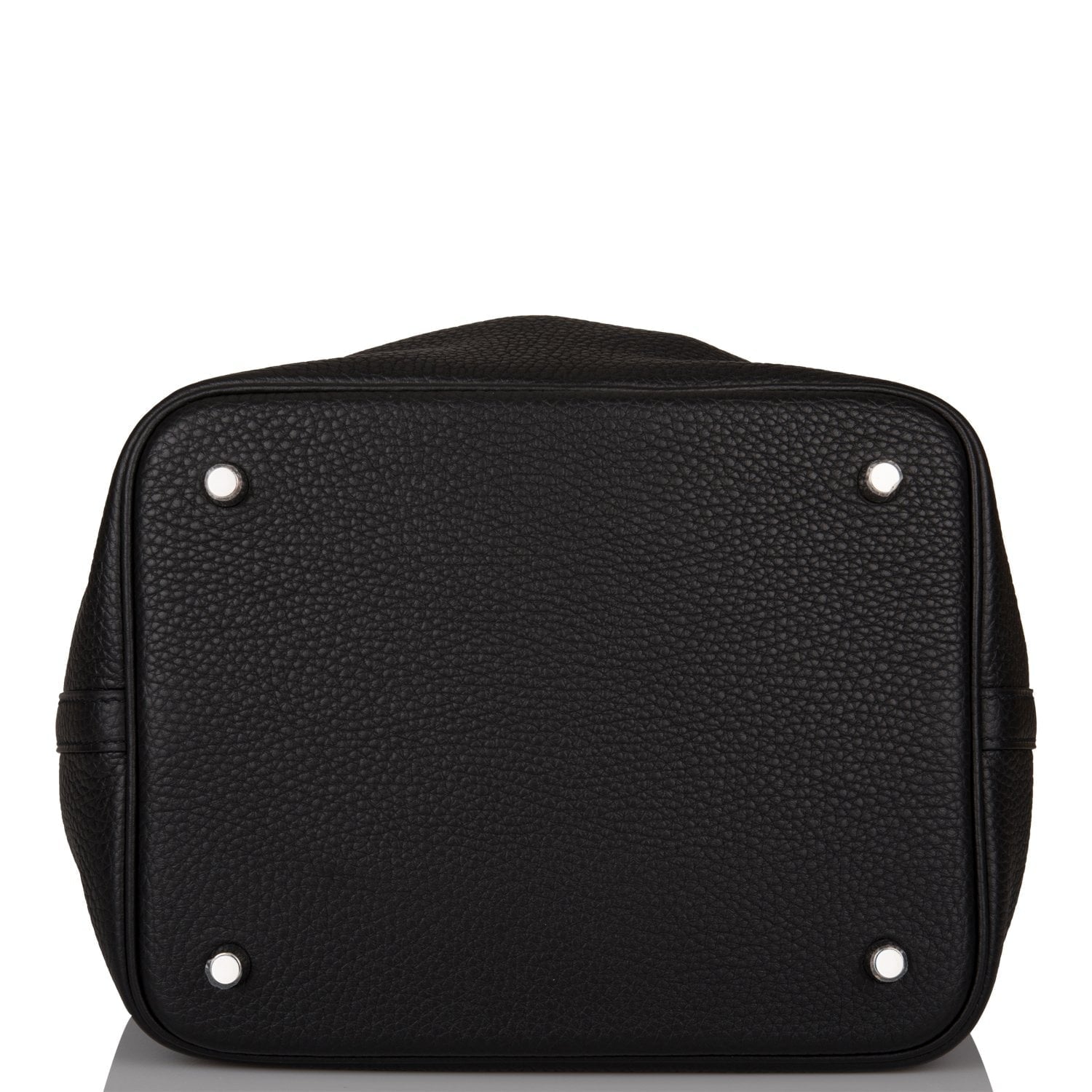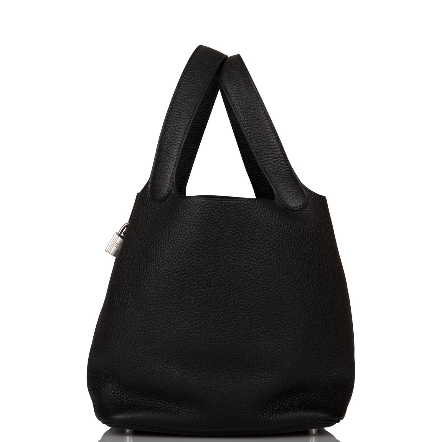 This Picotin is in black clemence leather with palladium hardware and has tonal stitching with two top handles.