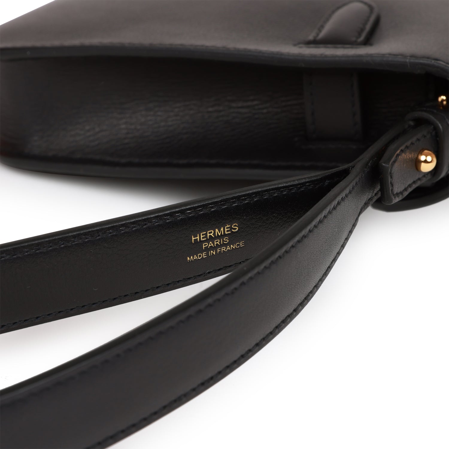 Hermes Kelly Depeches Pouch 25cm of Black evergrain leather with gold hardware and has tonal stitching, front flap and two straps with front toggle closure.