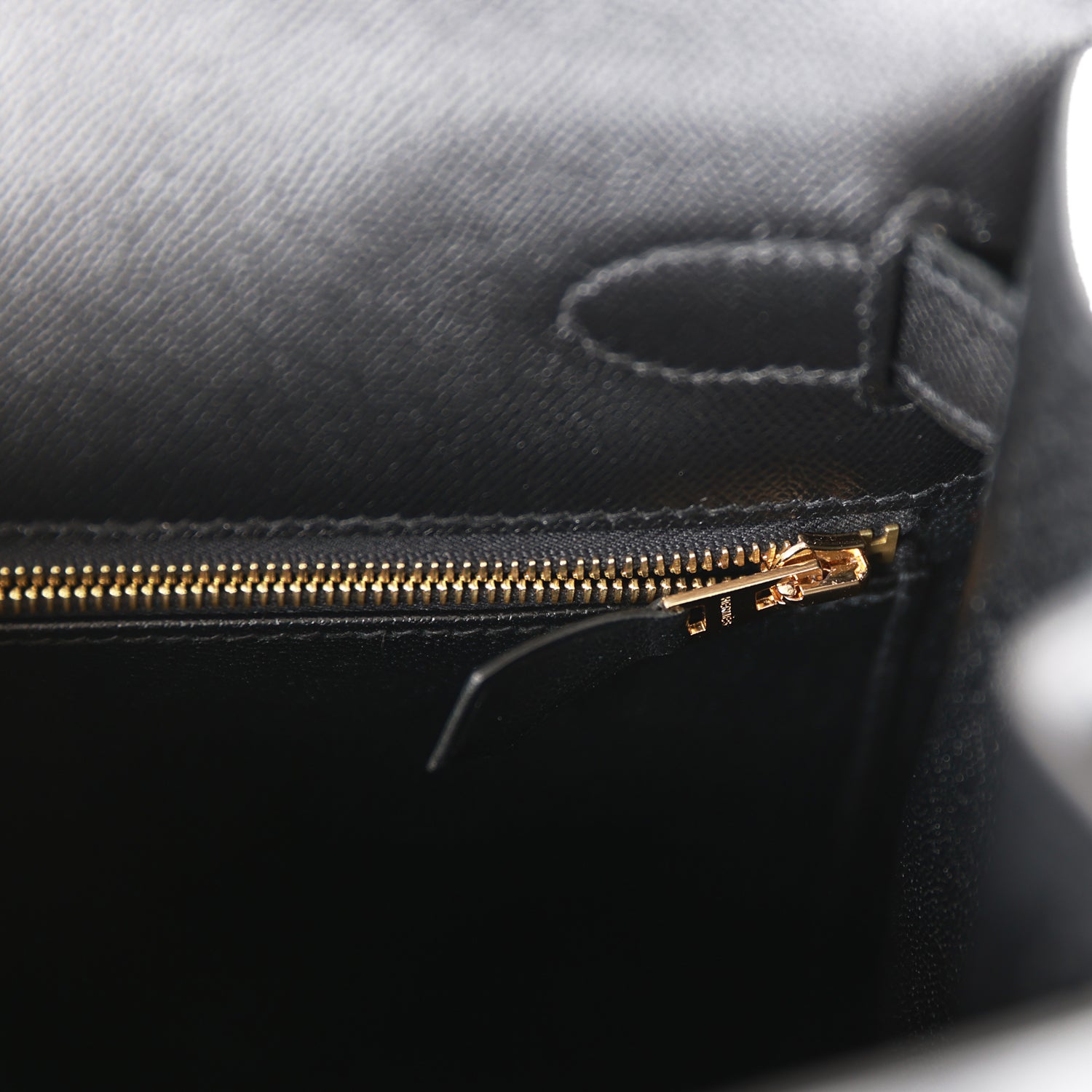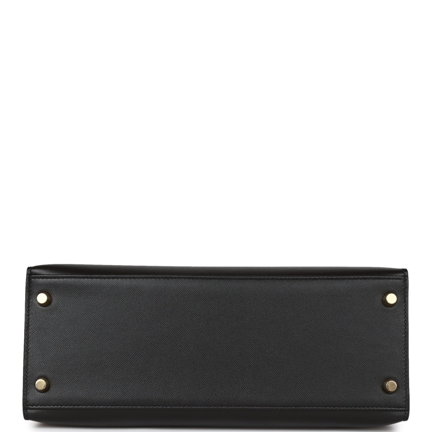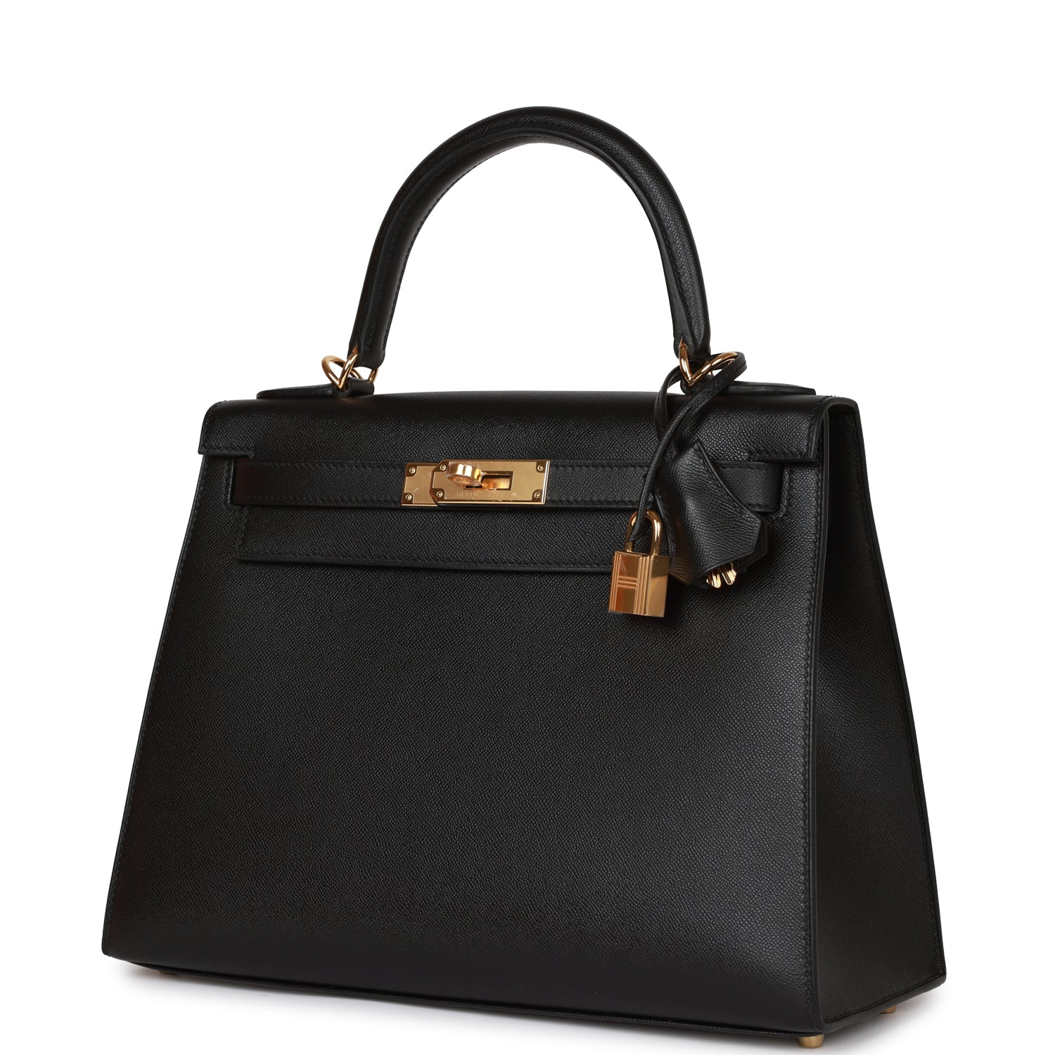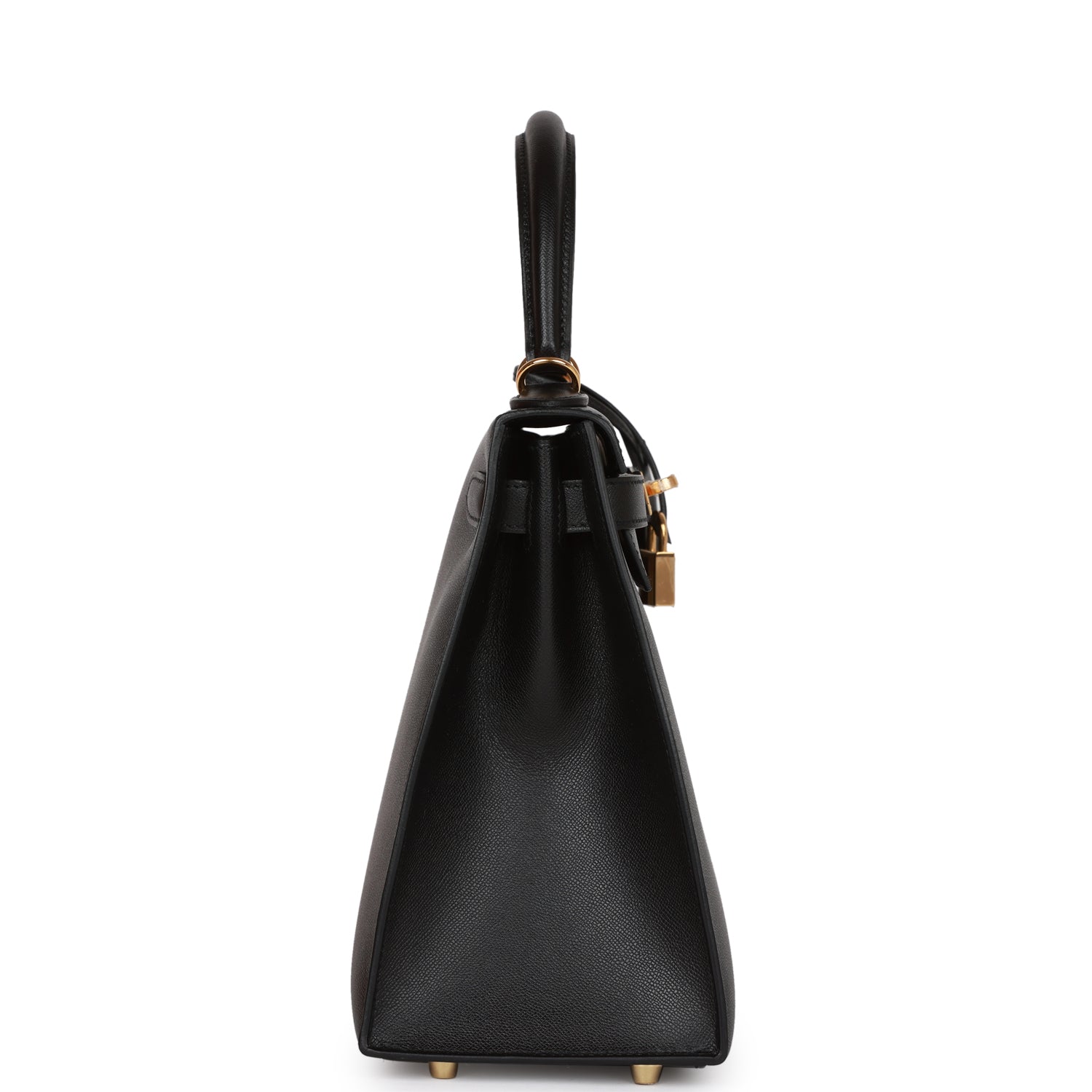 This Kelly Sellier is of black madame leather with gold hardware and has tonal stitching, a front toggle closure, a clochette with lock and two keys, a single rolled handle and an optional shoulder strap.