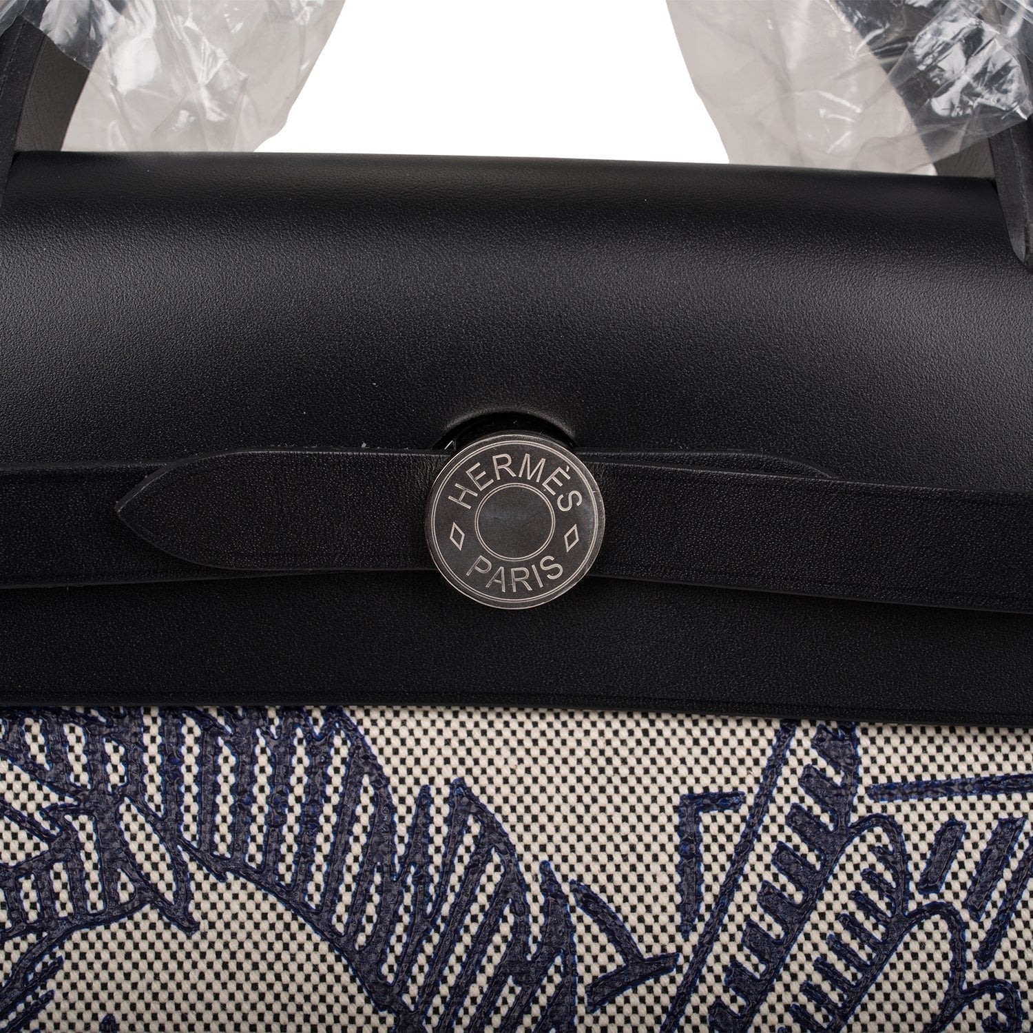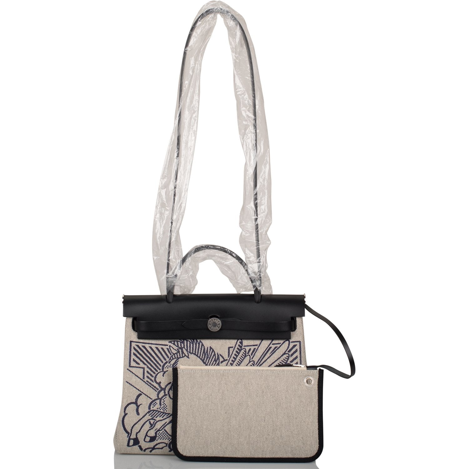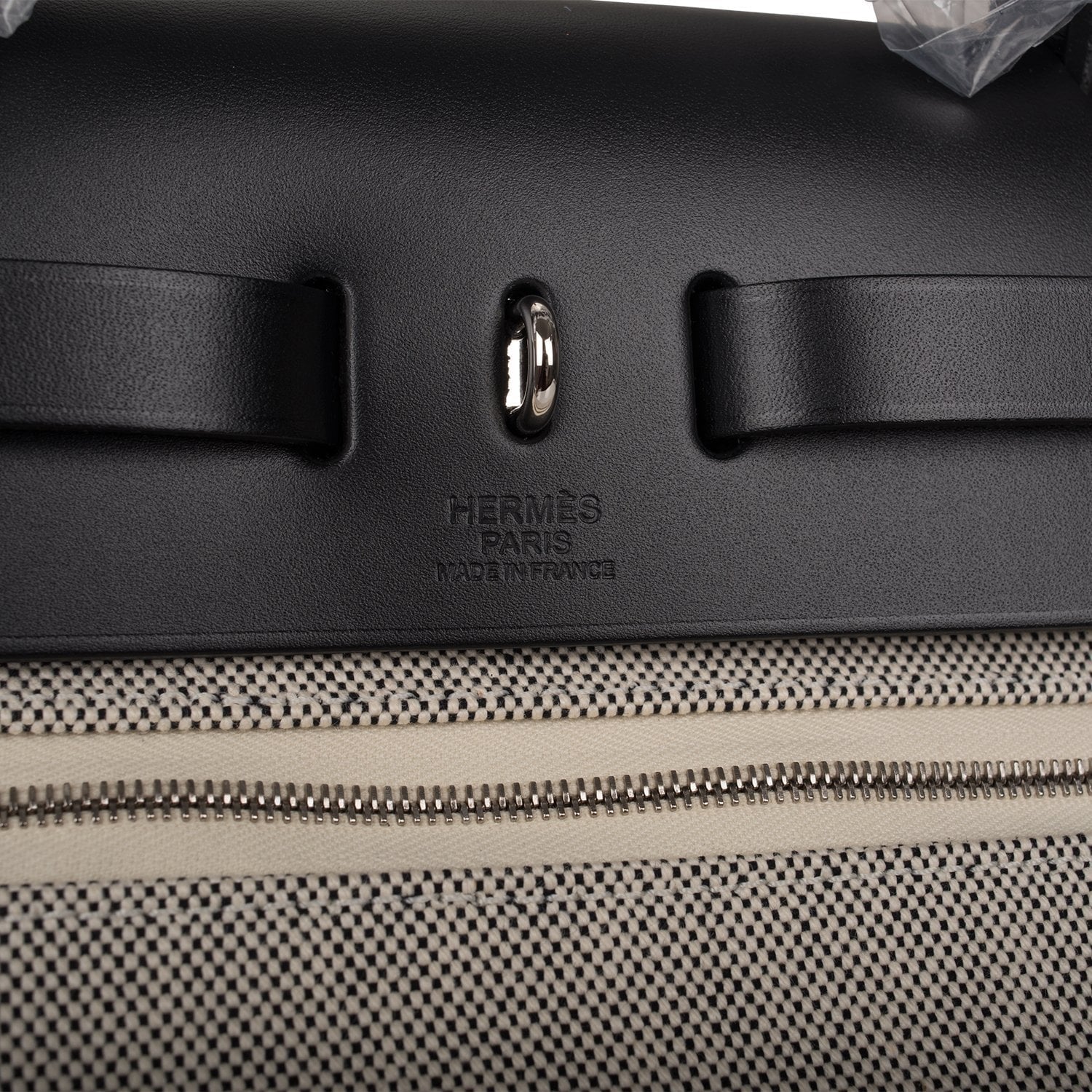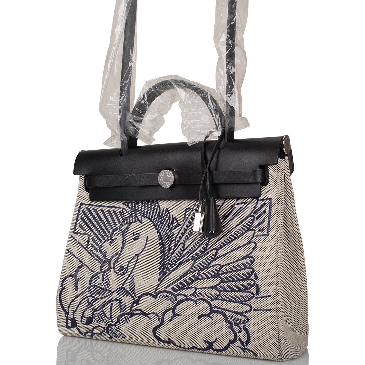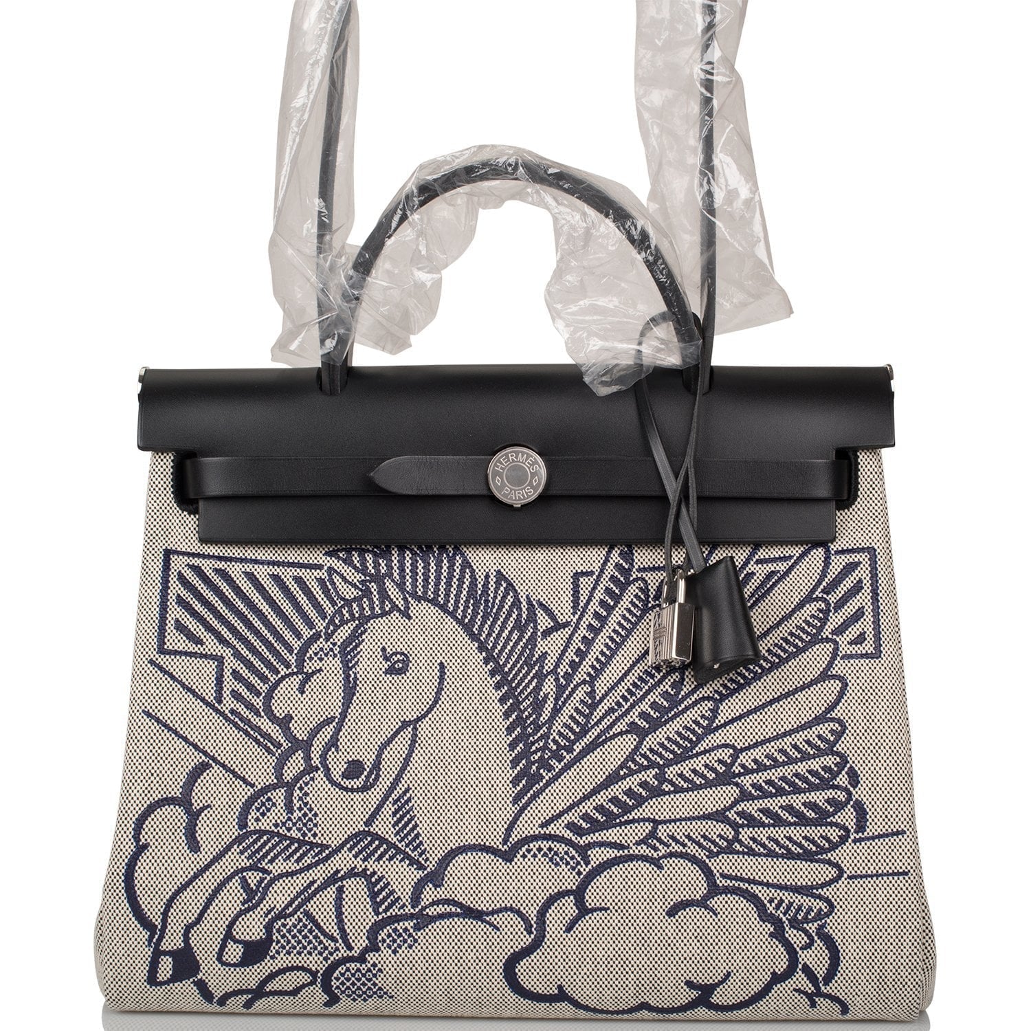 This Pegase Pop Herbag is in black hunter leather and toile with palladium hardware and has tonal stitching, clou de selle closure, top handle and shoulder strap in hunter leather, clochette, interior zip pouch and zip pocket on back of bag.