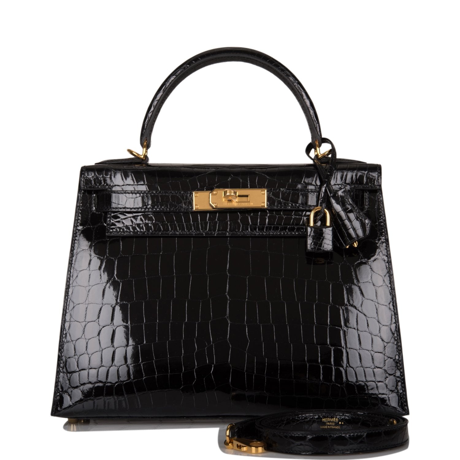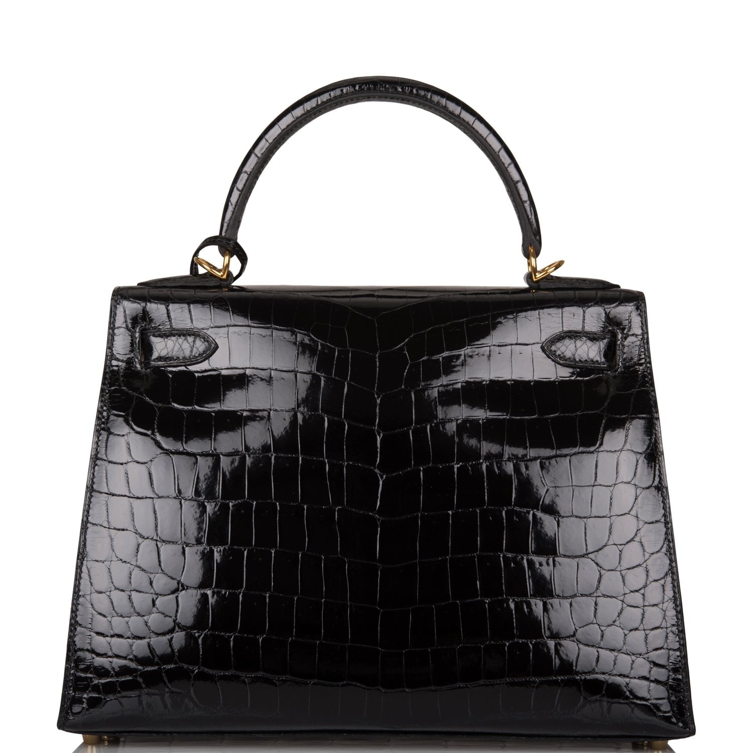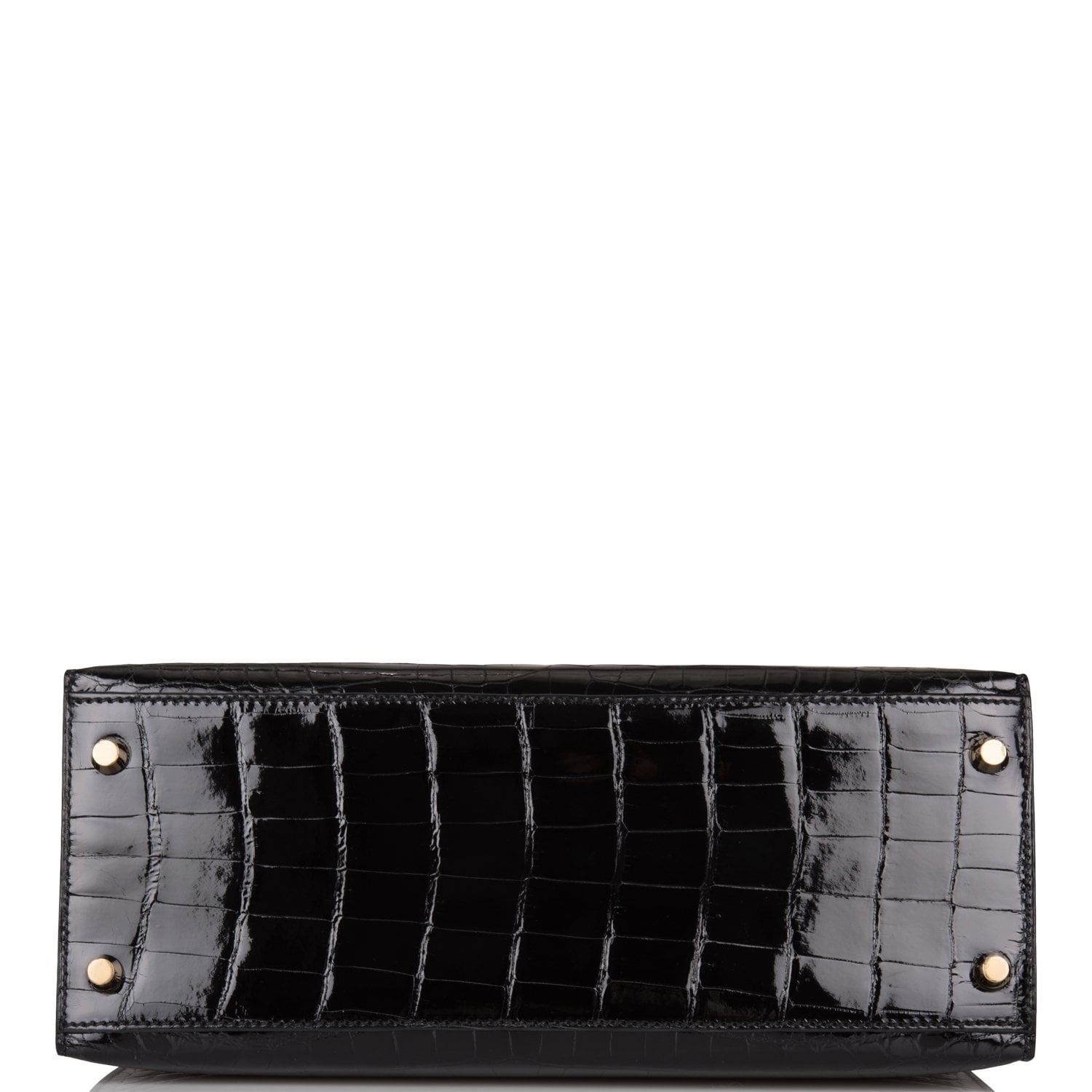 This Kelly, in the Sellier style, is of black shiny niloticus crocodile with gold hardware and features tonal stitching, a front toggle closure, a clochette with lock and two keys and a single rolled handle.