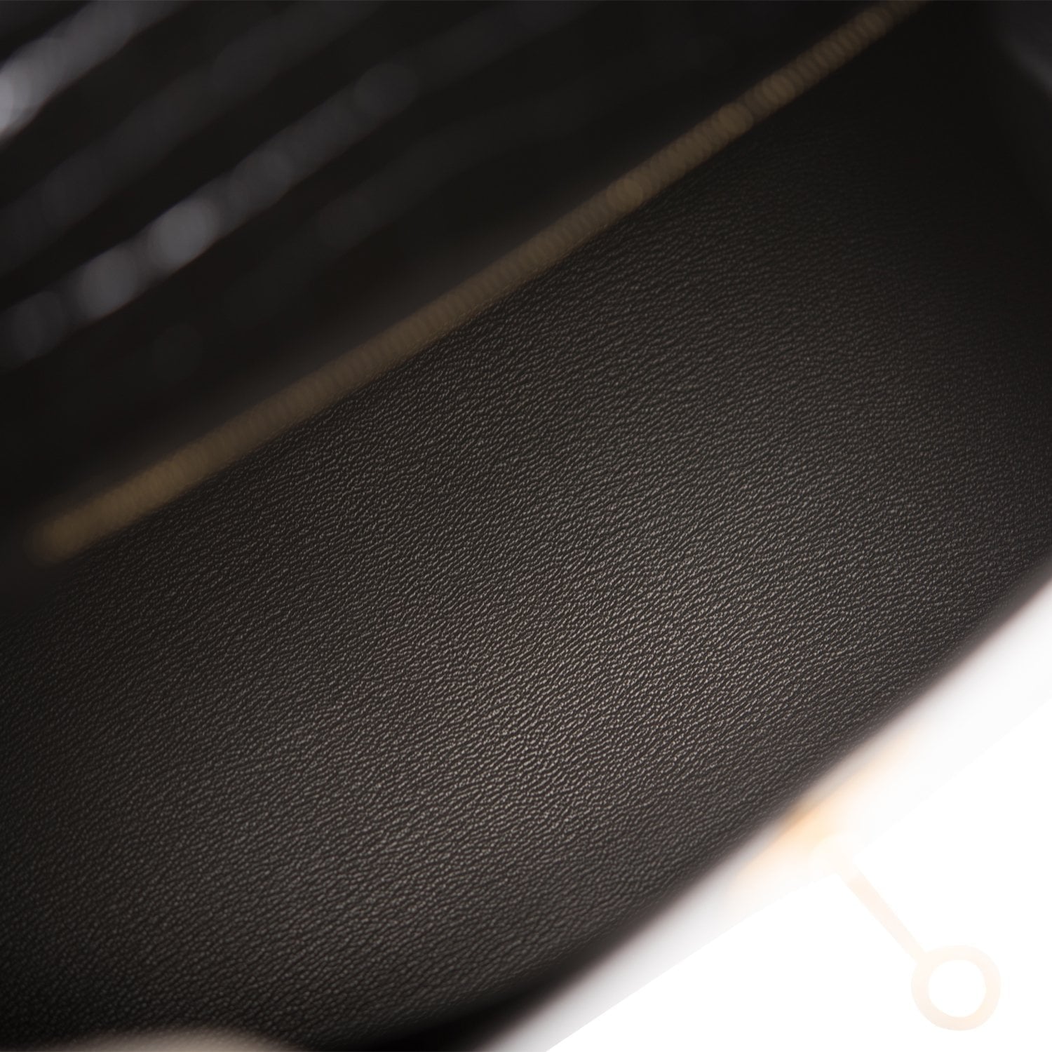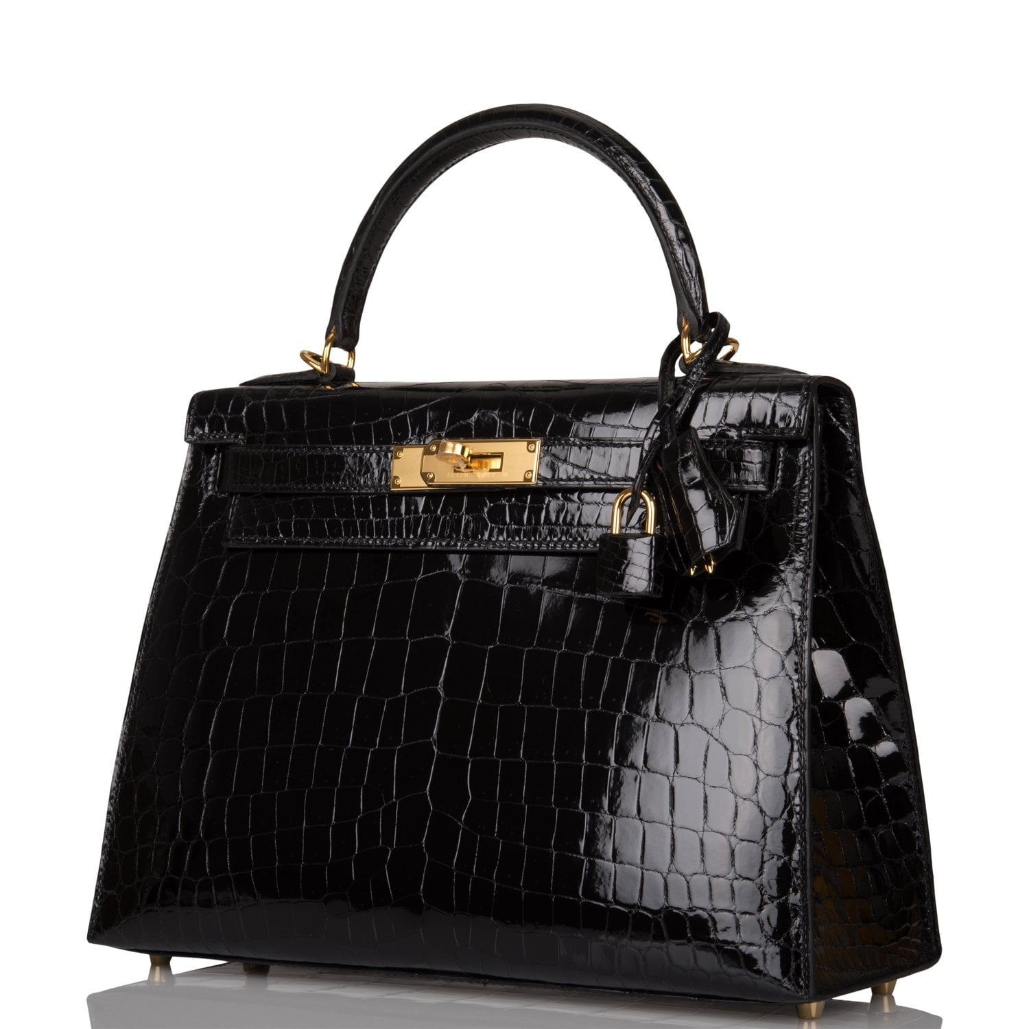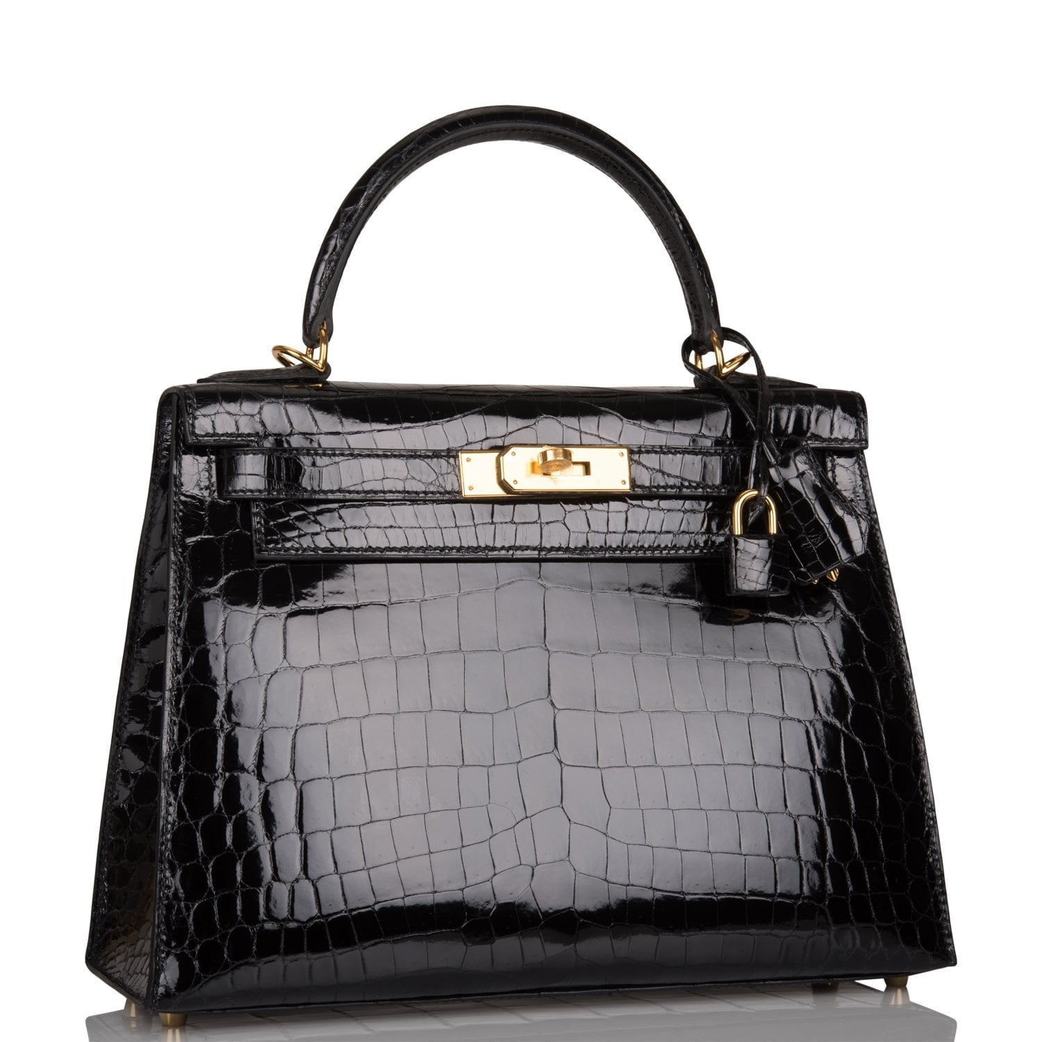 This Kelly, in the Sellier style, is of black shiny niloticus crocodile with gold hardware and features tonal stitching, a front toggle closure, a clochette with lock and two keys and a single rolled handle.