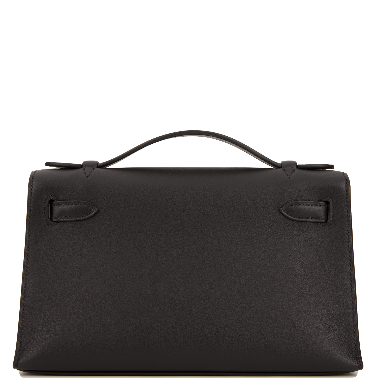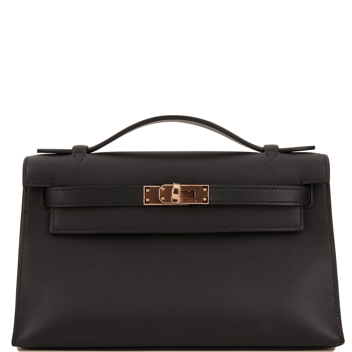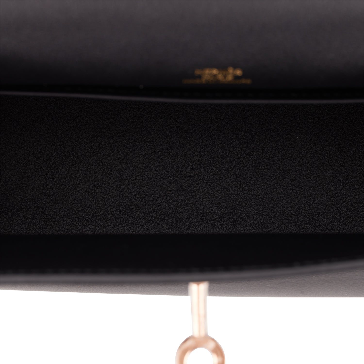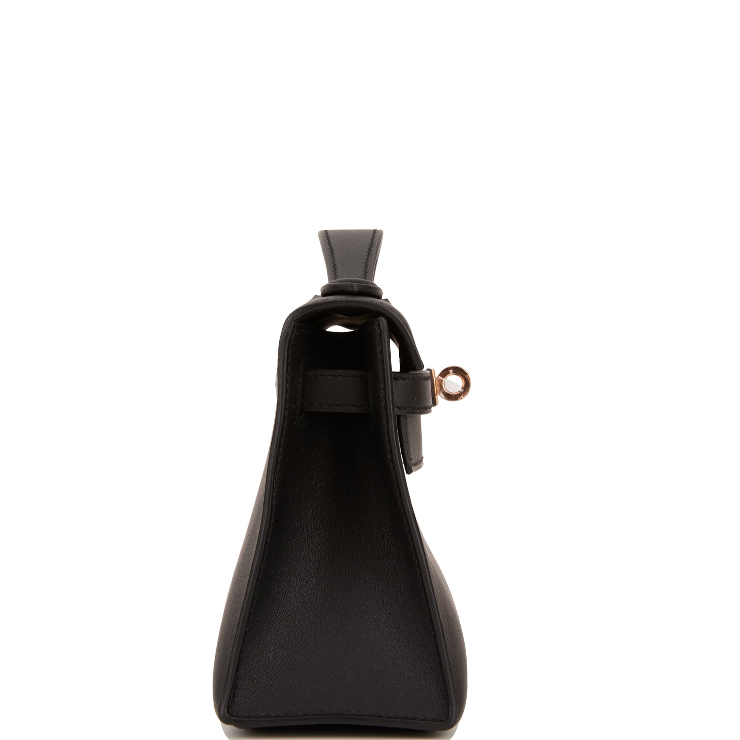 This Mini Kelly Pochette is in Black swift leather with rose gold hardware and has tonal stitching, front flap, two straps with center toggle closure and a top flat handle.