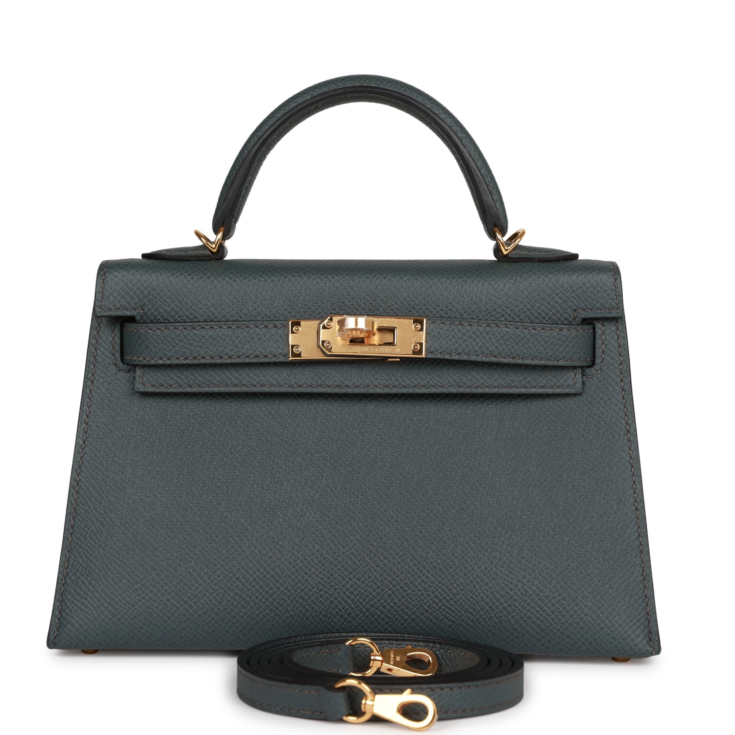 This Kelly, in the Sellier style, is in Bleu Orage epsom leather with gold hardware and has tonal stitching, two straps with front toggle closure, clochette with lock and two keys, single rolled handle and removable shoulder strap.